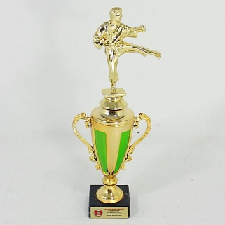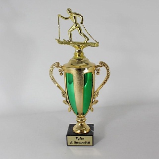 Кубок пластиковый на основании из мрамора. В крышке есть отверстие для крепления пластиковой фигурки.