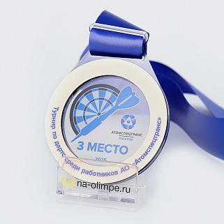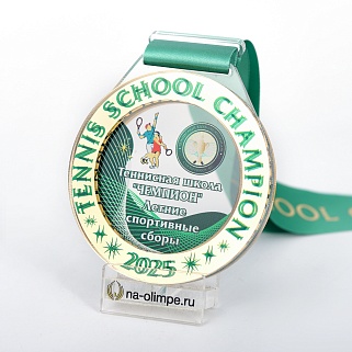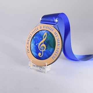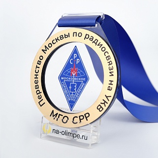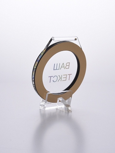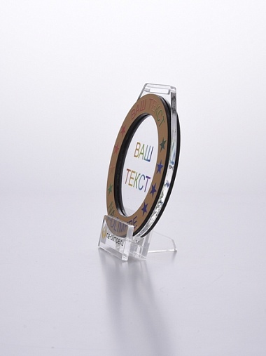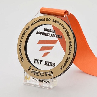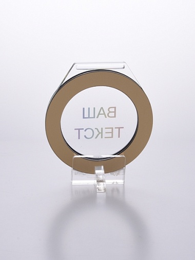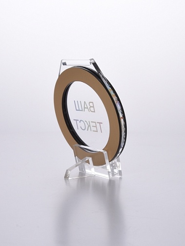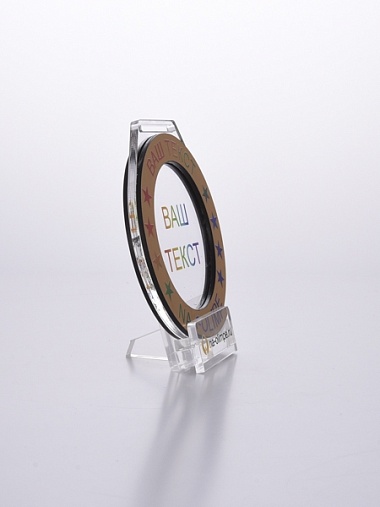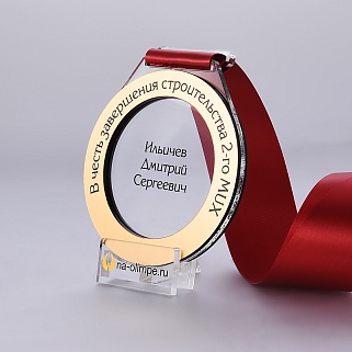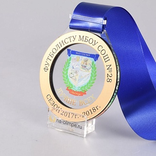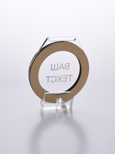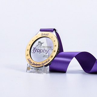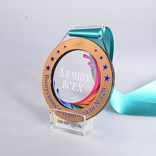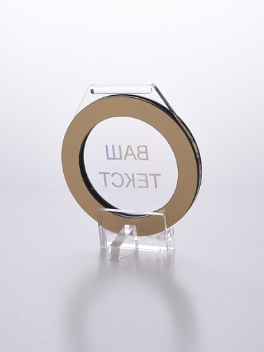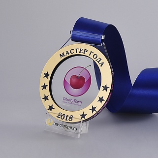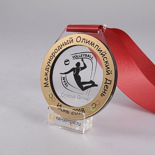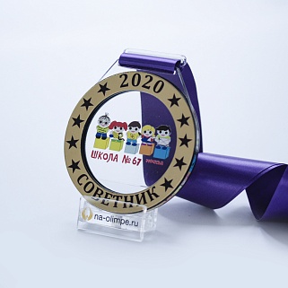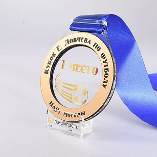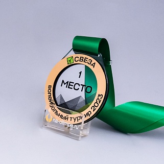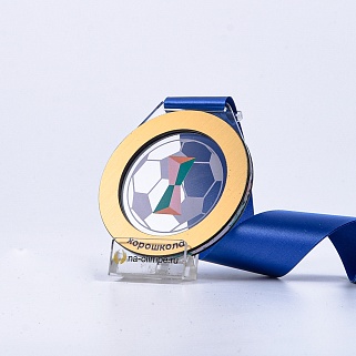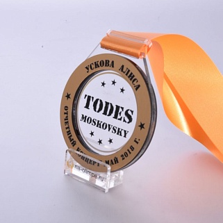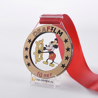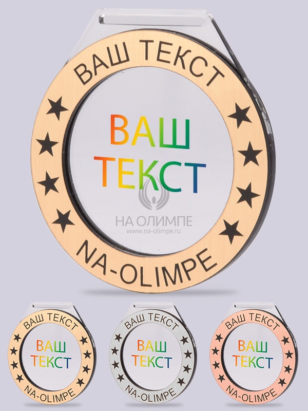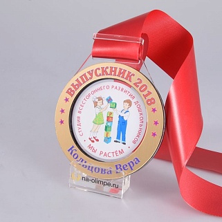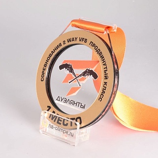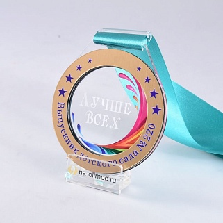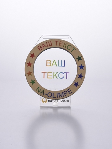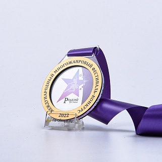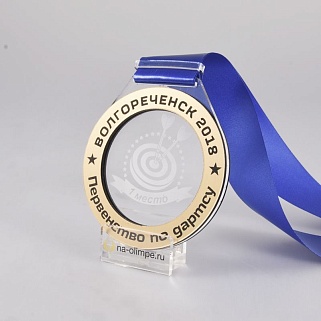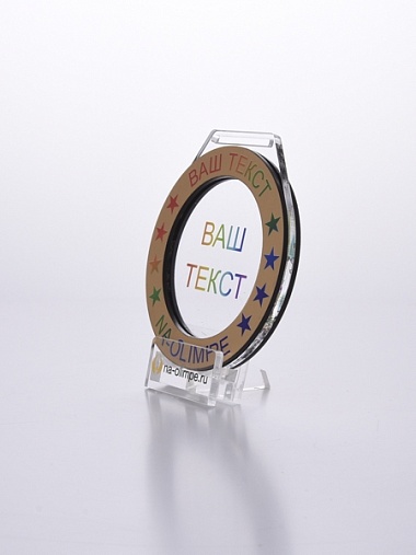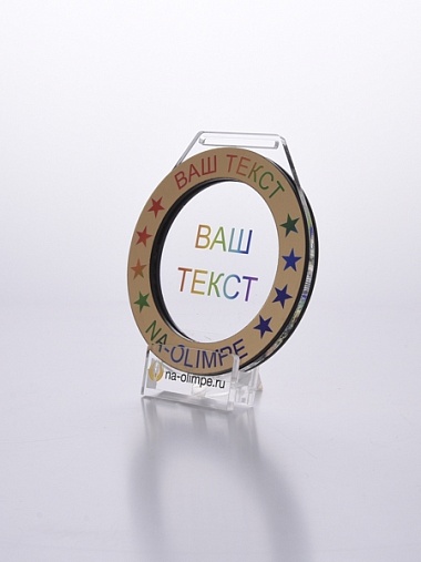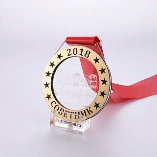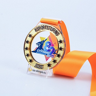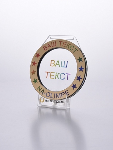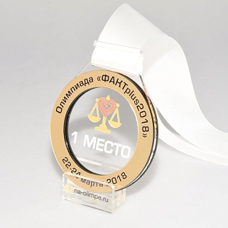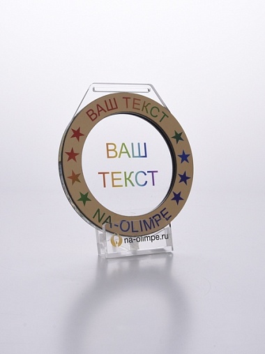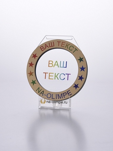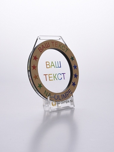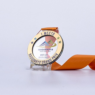 Медаль из акрила и золотистого пластика с полноцветной печатью в центре и по кругу. Нанесение текста и логотипа уже включены в стоимость.
