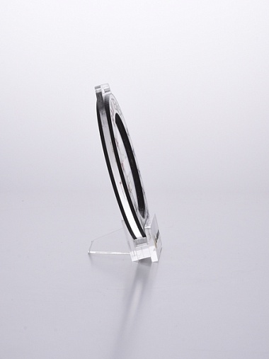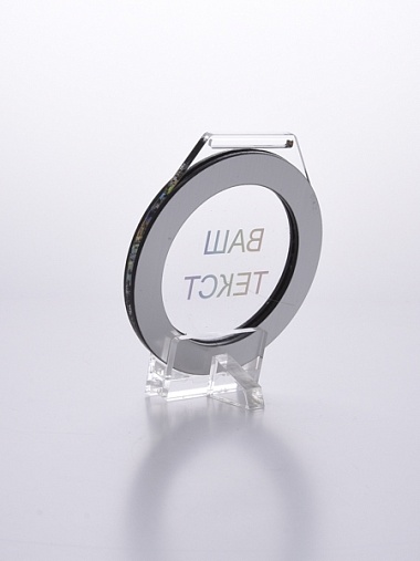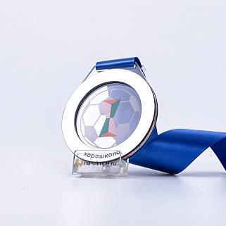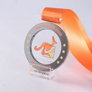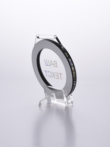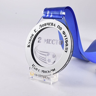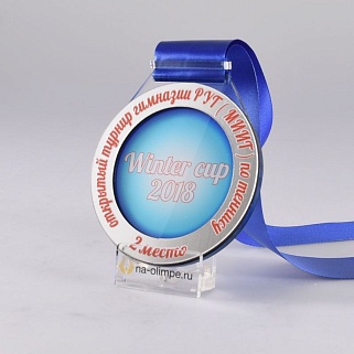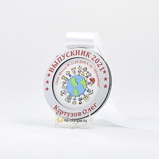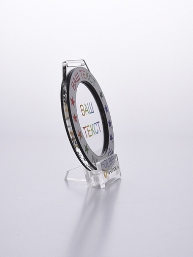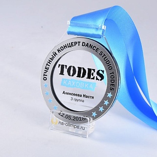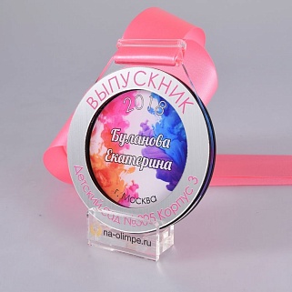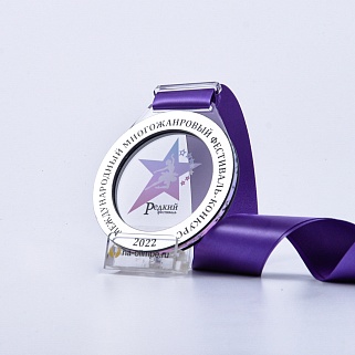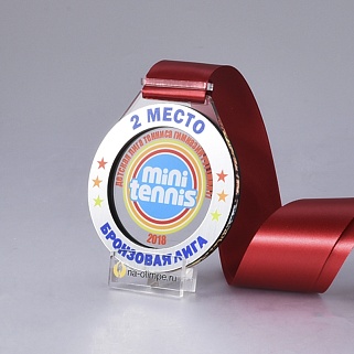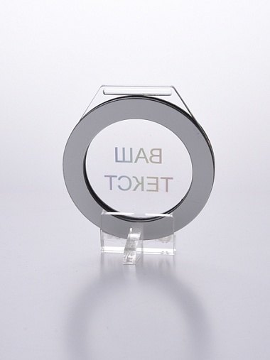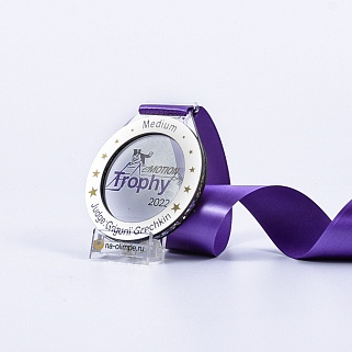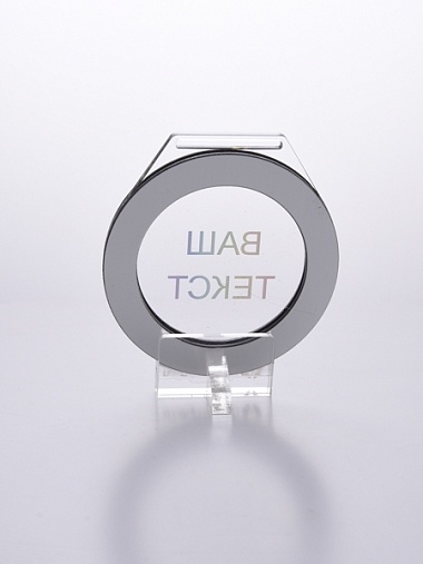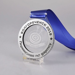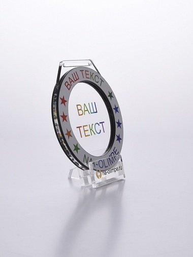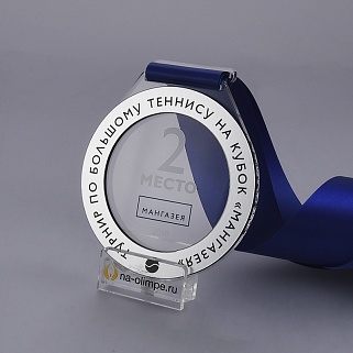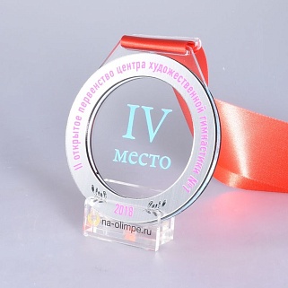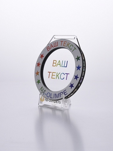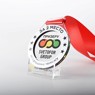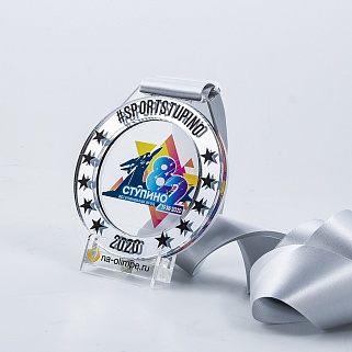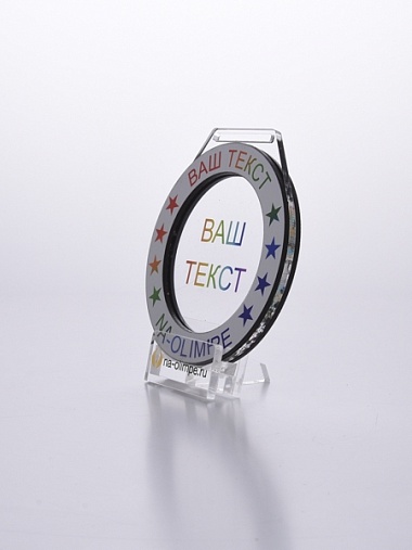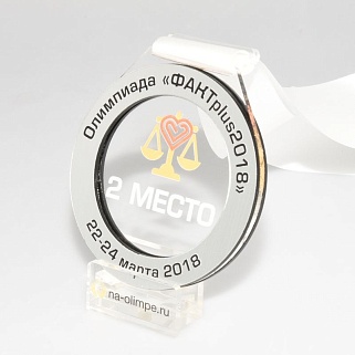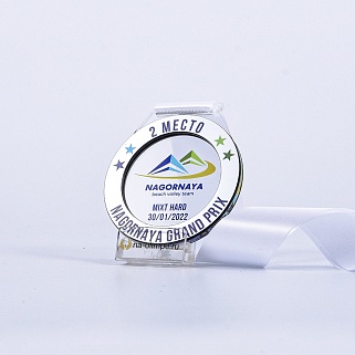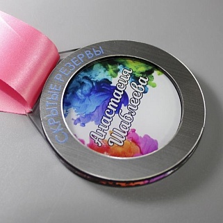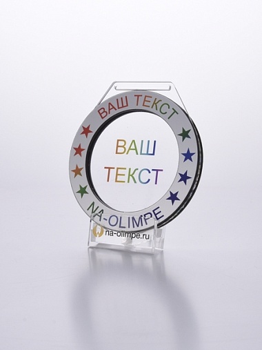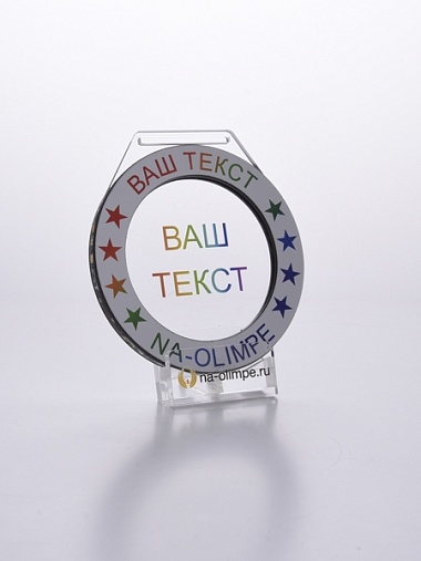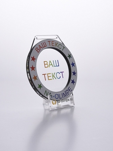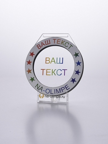 Медаль из акрила и серебристого пластика с полноцветной печатью в центре и по кругу. Нанесение текста и логотипа уже включены в стоимость.