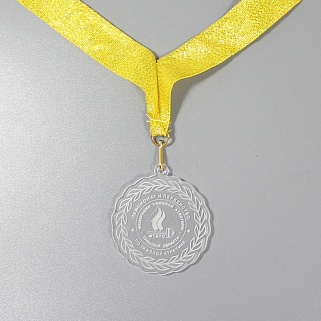 Медаль из акрила с гравировкой текста и/или логотипа по Вашему желанию.