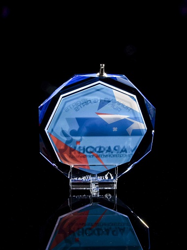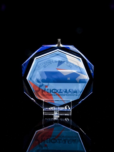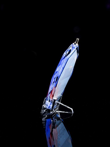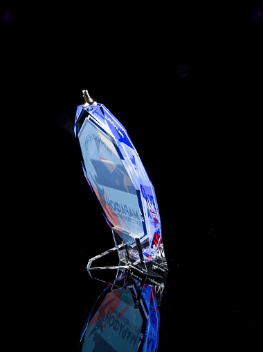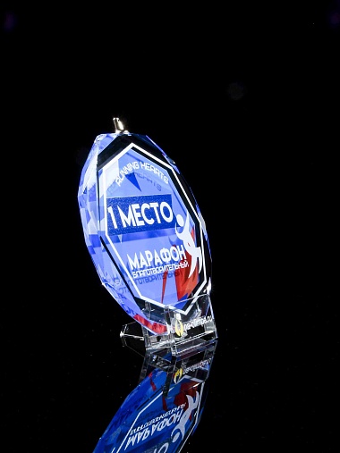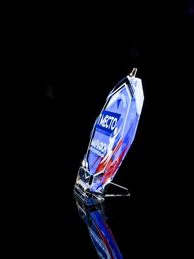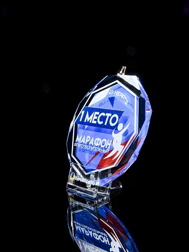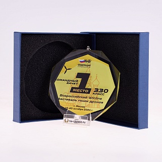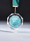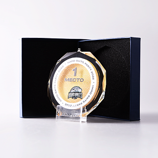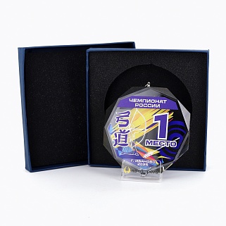 Медаль из стекла, толщиной 10 мм. с полноцветной печатью. Печать выполняется на uv-принтере уф-отверждаемыми чернилами. Изображение не выцветает и не желтеет со временем. Высокое качество печати позволяет наносить изображения с большой детализацией, любых цветов включая белый. Изображение наносится на медаль с двух сторон - с лицевой и с обратной. На лицевой части обычно наносится информационная часть макета (текст, логотип), на обратной части наносится фон, подобранный в соответствии с пожеланиями заказчика. Таким образом всё нанесение на медали наносится с двух сторон, а воспринимается только спереди. Благодаря печати с двух сторон достигается эффект объемного изображения: при небольшом повороте медали изображение на передней части движется относительно фона на задней стороне. Диаметр медали равен 100 мм. Вес медали без футляра 195 гр. Поставляется в комплекте с подарочным футляром (цвет футляра и подложка могут отличаться), лента в комплект не входит и заказывается отдельно.