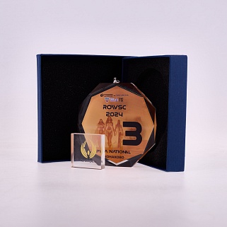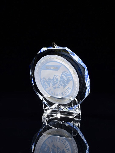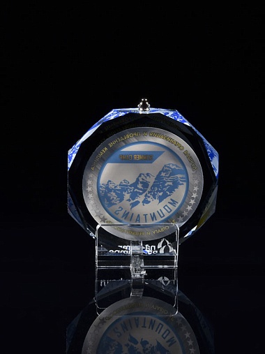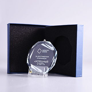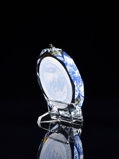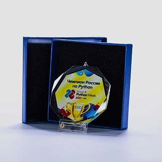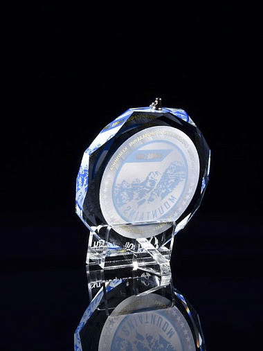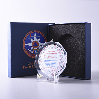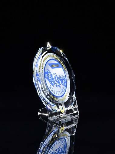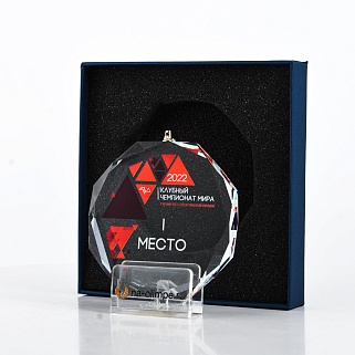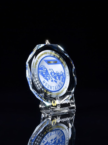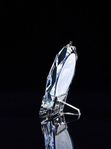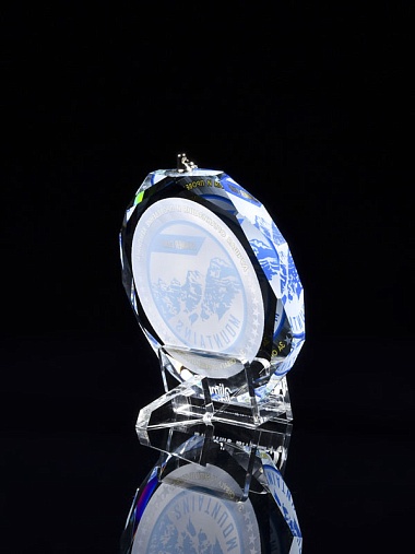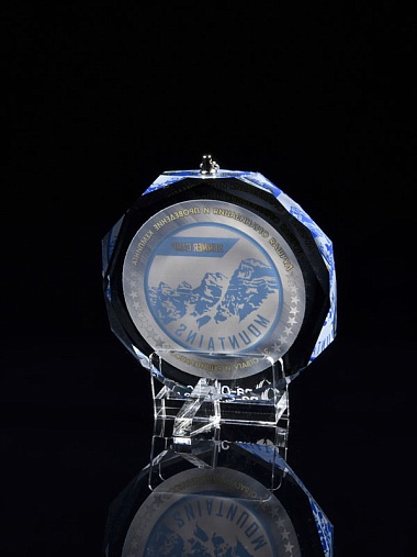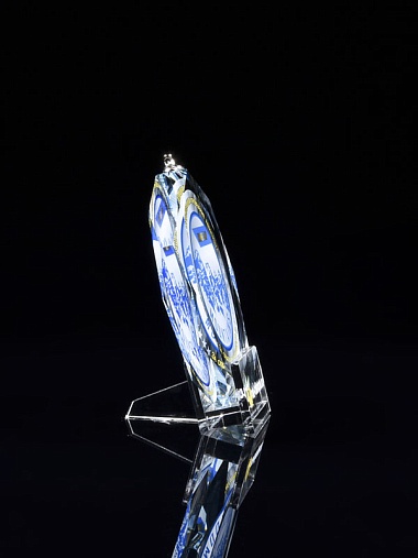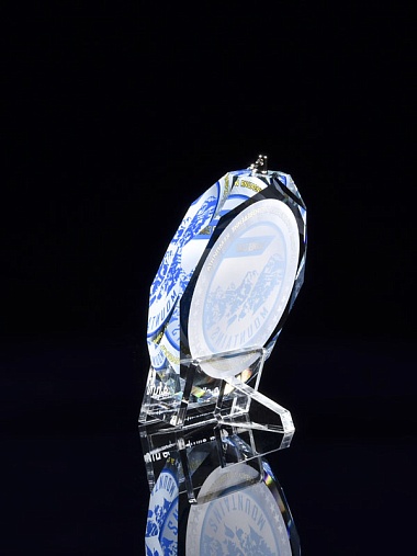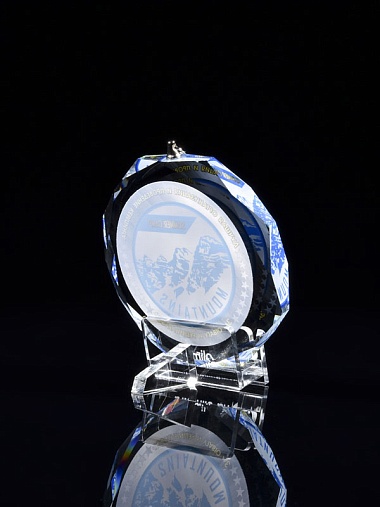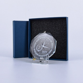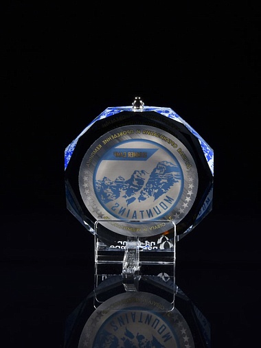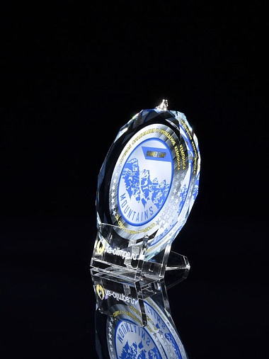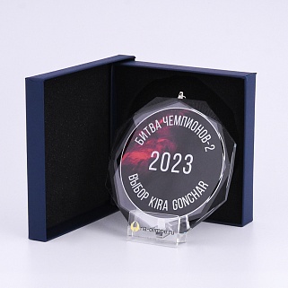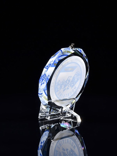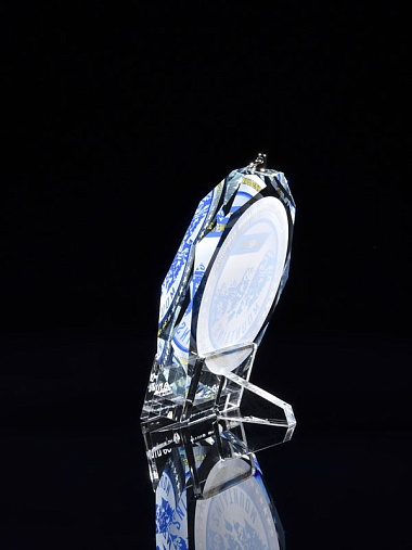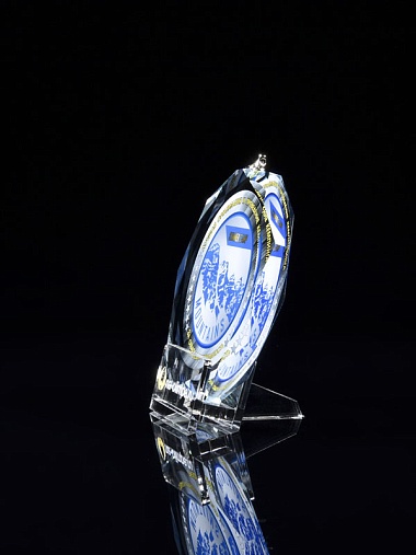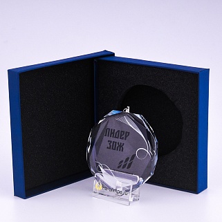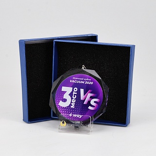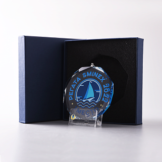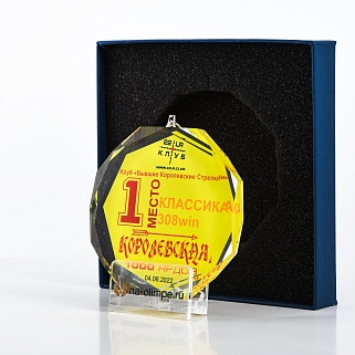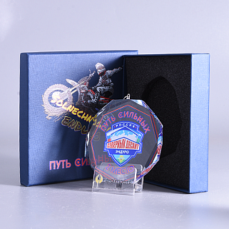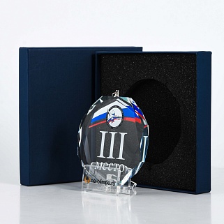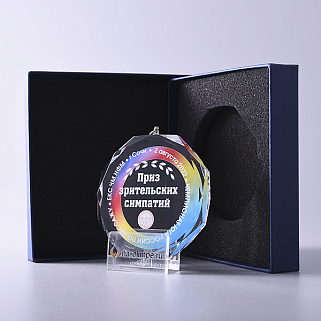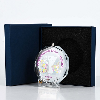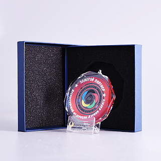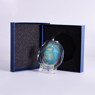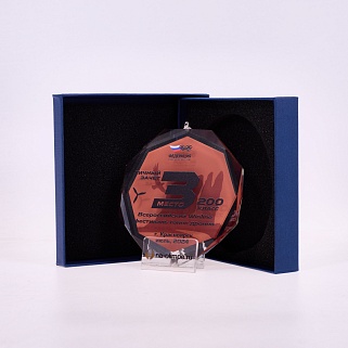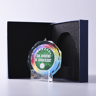 Медаль из стекла, толщиной 8мм с полноцветной печатью. Печать выполняется на uv-принтере уф-отверждаемыми чернилами. Изображение не выцветает и не желтеет со временем. Высокое качество печати позволяет наносить изображения с большой детализацией, любых цветов включая белый. Изображение наносится на обратную сторону медали зеркально, благодаря этому становится возможным оценить толщину материала награды и медаль раскрывается с лучшей стороны. Диаметр медали равен 80мм. Поставляется в комплекте с подарочным футляром (цвет футляра и подложка могут отличаться), лента в комплект не входит и заказывается отдельно. Вес награды без футляра 150гр.