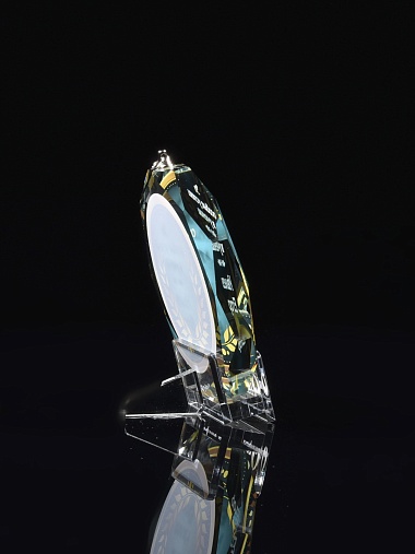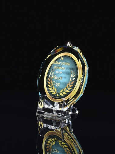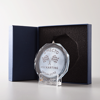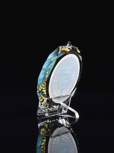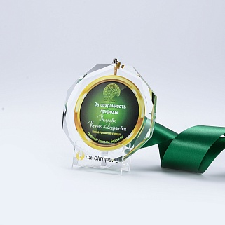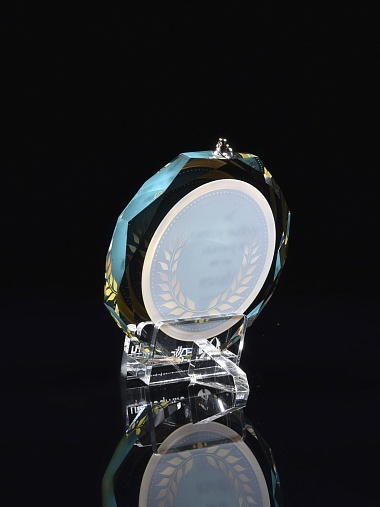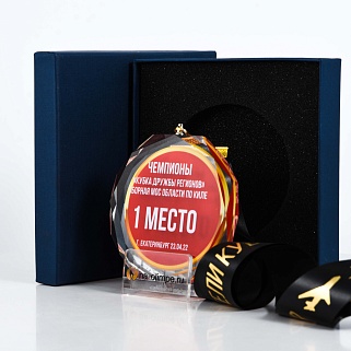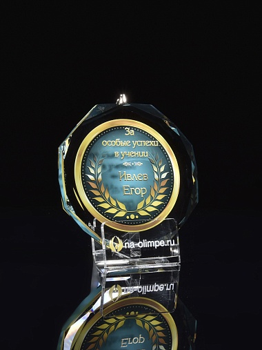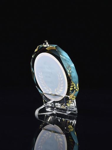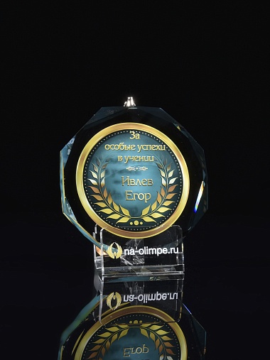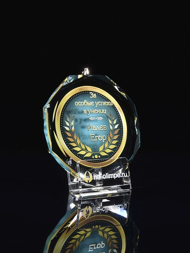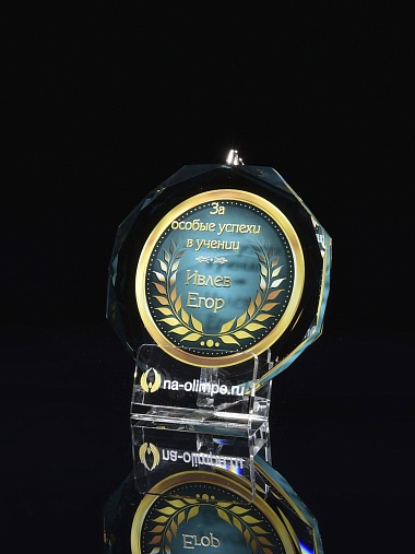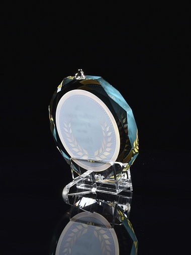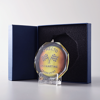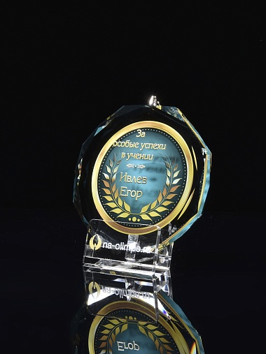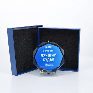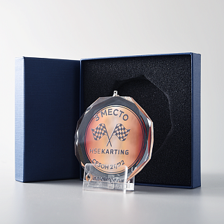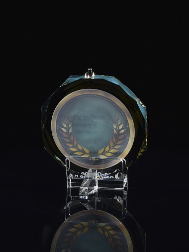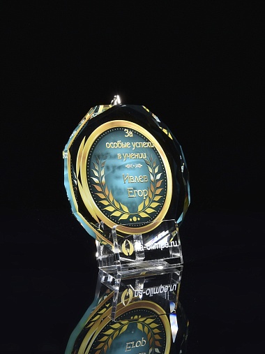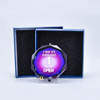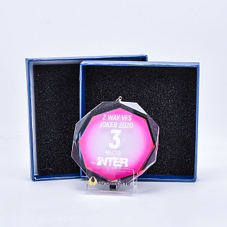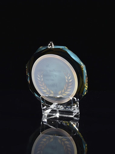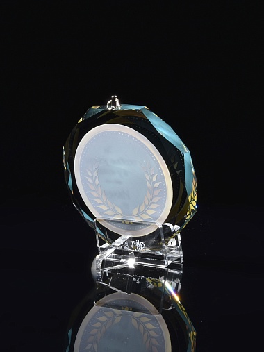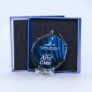 Медаль из стекла, толщиной 8 мм. с полноцветной печатью. Печать выполняется на uv-принтере уф-отверждаемыми чернилами. Изображение не выцветает и не желтеет со временем. Высокое качество печати позволяет наносить изображения с большой детализацией, любых цветов включая белый. Изображение наносится на медаль с двух сторон - с лицевой и с обратной. На лицевой части обычно наносится информационная часть макета (текст, логотип), на обратной части наносится фон, подобранный в соответствии с пожеланиями заказчика. Таким образом всё нанесение на медали наносится с двух сторон, а воспринимается только спереди. Благодаря печати с двух сторон достигается эффект объемного изображения: при небольшом повороте медали изображение на передней части движется относительно фона на задней стороне. Диаметр медали равен 80 мм. Поставляется в комплекте с подарочным футляром (цвет футляра и подложка могут отличаться), лента в комплект не входит и заказывается отдельно. Вес награды без футляра 150гр.