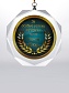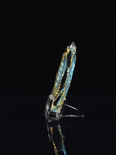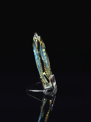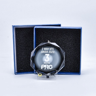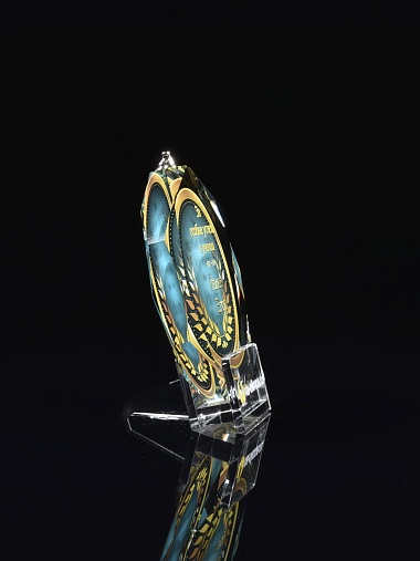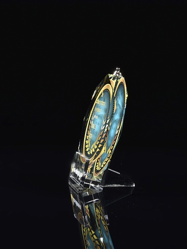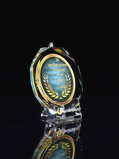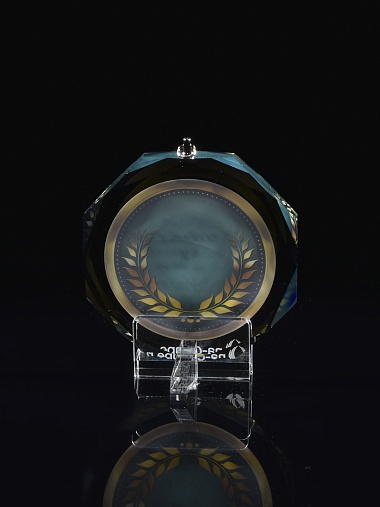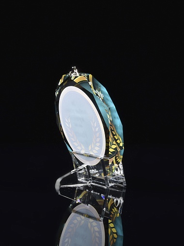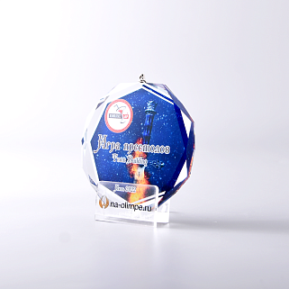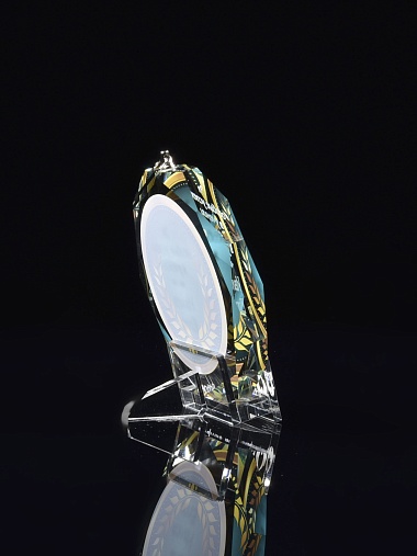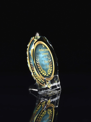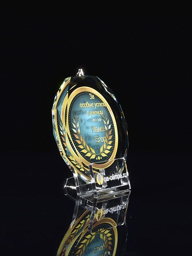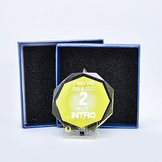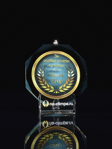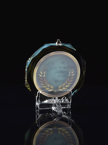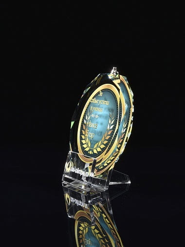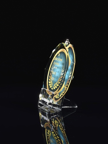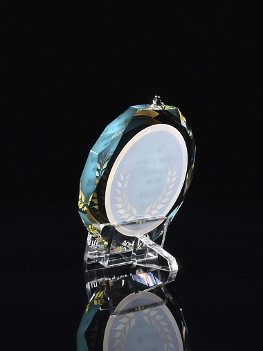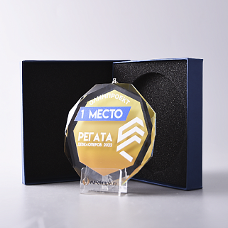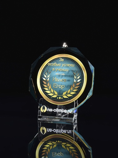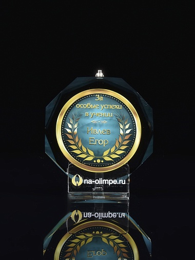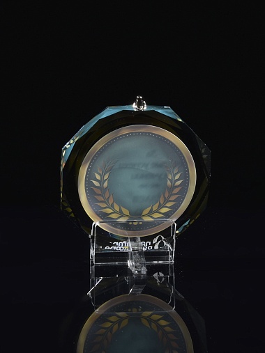 Медаль из стекла, толщиной 8 мм. с полноцветной печатью. Печать выполняется на uv-принтере уф-отверждаемыми чернилами. Изображение не выцветает и не желтеет со временем. Высокое качество печати позволяет наносить изображения с большой детализацией, любых цветов включая белый. Изображение наносится на медаль с двух сторон - с лицевой и с обратной. На лицевой части обычно наносится информационная часть макета (текст, логотип), на обратной части наносится фон, подобранный в соответствии с пожеланиями заказчика. Таким образом всё нанесение на медали наносится с двух сторон, а воспринимается только спереди. Благодаря печати с двух сторон достигается эффект объемного изображения: при небольшом повороте медали изображение на передней части движется относительно фона на задней стороне. Диаметр медали равен 80 мм. Поставляется в комплекте с подарочным футляром (цвет футляра и подложка могут отличаться), лента в комплект не входит и заказывается отдельно. Вес награды без футляра 150гр.