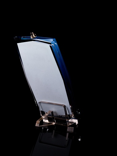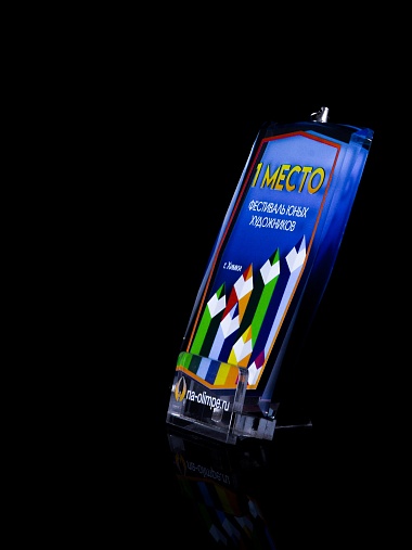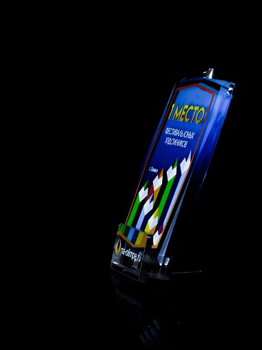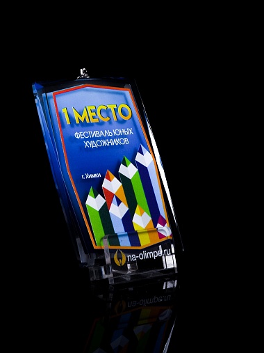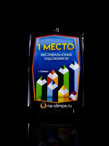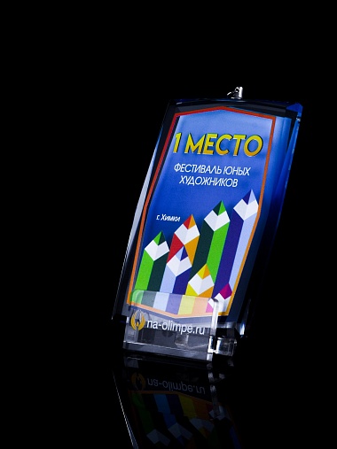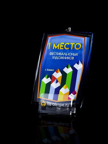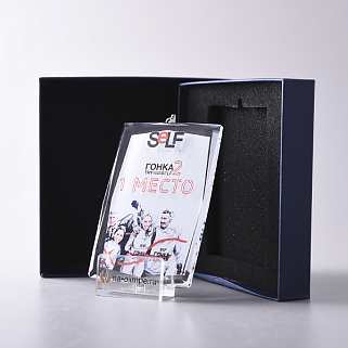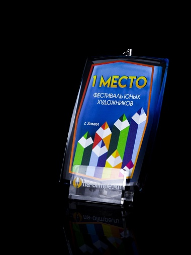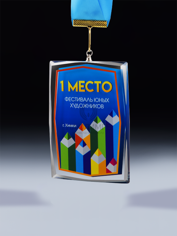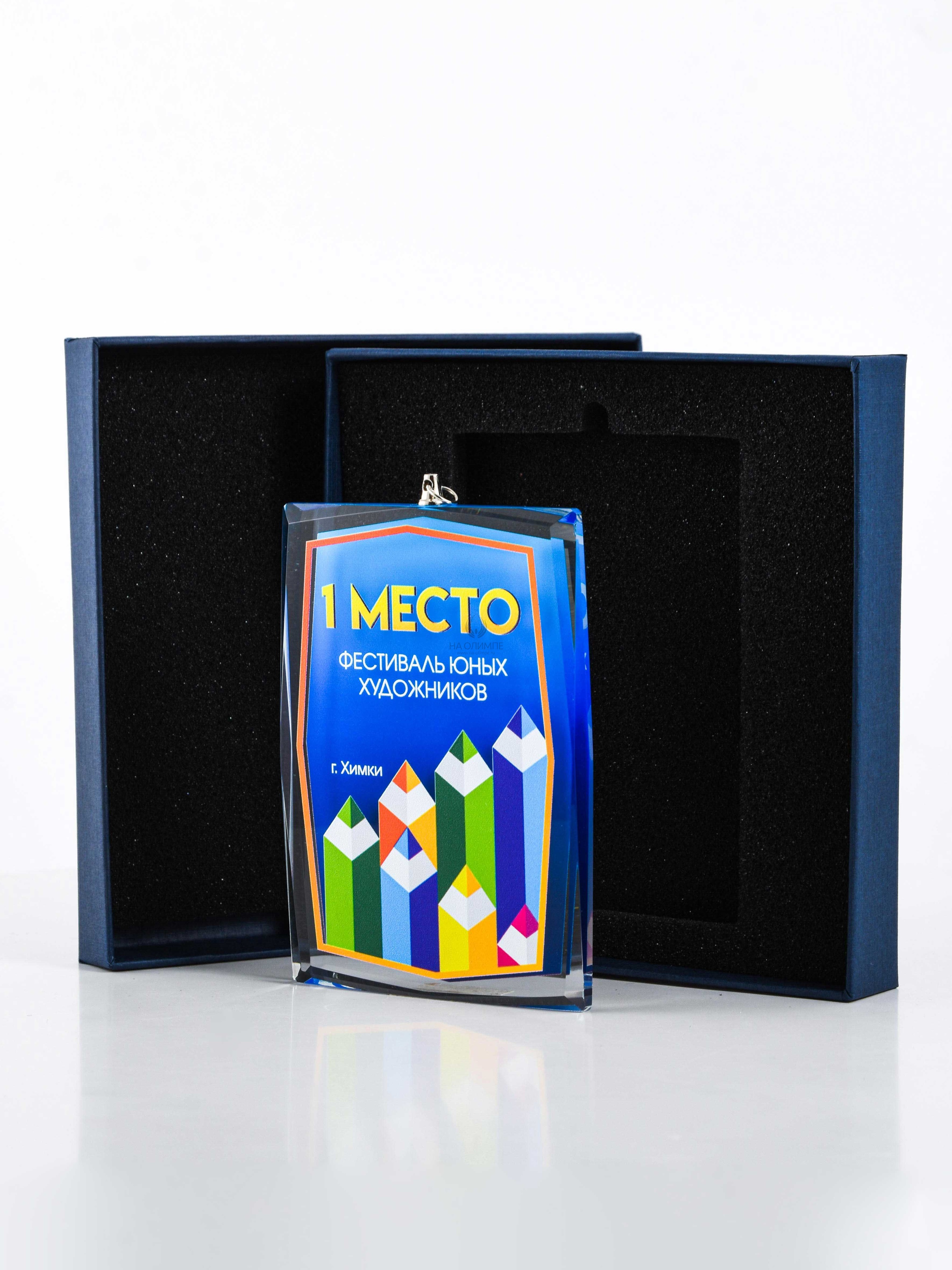 Медаль из стекла, толщиной 8 мм. с полноцветной печатью. Печать выполняется на uv-принтере уф-отверждаемыми чернилами. Изображение не выцветает и не желтеет со временем. Высокое качество печати позволяет наносить изображения с большой детализацией, любых цветов включая белый. Изображение наносится на медаль с двух сторон - с лицевой и с обратной. На лицевой части обычно наносится информационная часть макета (текст, логотип), на обратной части наносится фон, подобранный в соответствии с пожеланиями заказчика. Таким образом всё нанесение на медали наносится с двух сторон, а воспринимается только спереди. Благодаря печати с двух сторон достигается эффект объемного изображения: при небольшом повороте медали изображение на передней части движется относительно фона на задней стороне. Размер стеклянной части 10х7 см. Поставляется в комплекте с подарочным футляром (цвет футляра и подложка могут отличаться), лента в комплект не входит и заказывается отдельно. Вес награды без футляра 133гр.