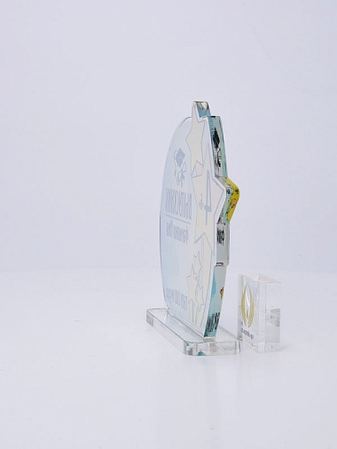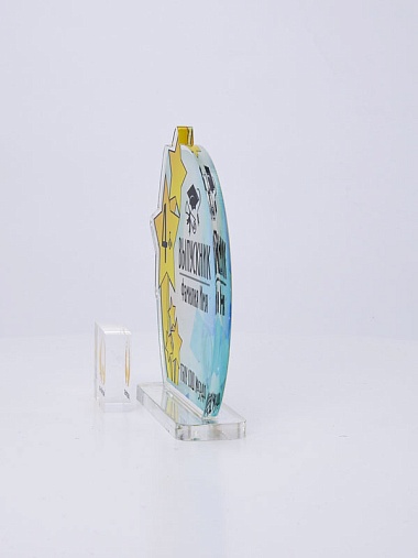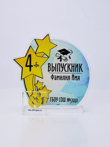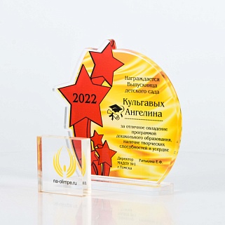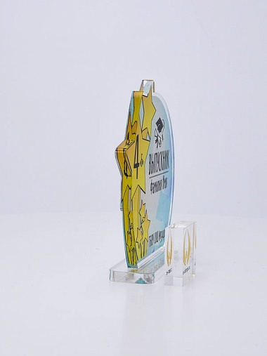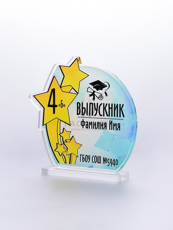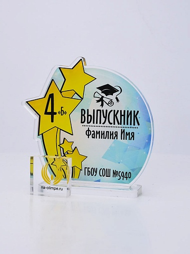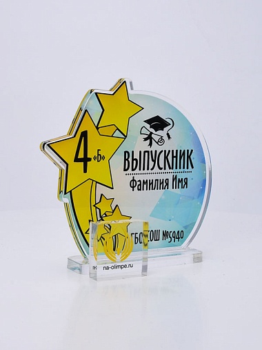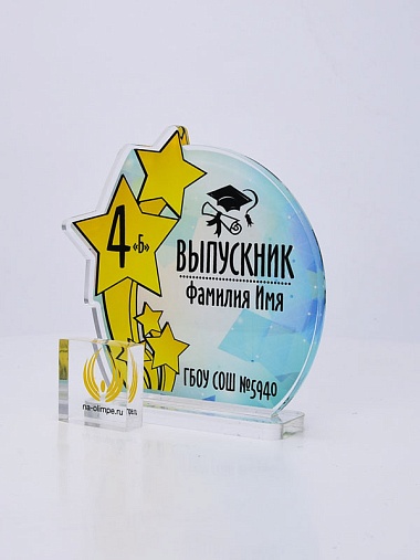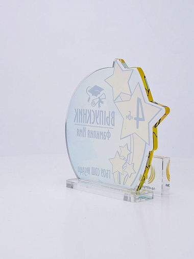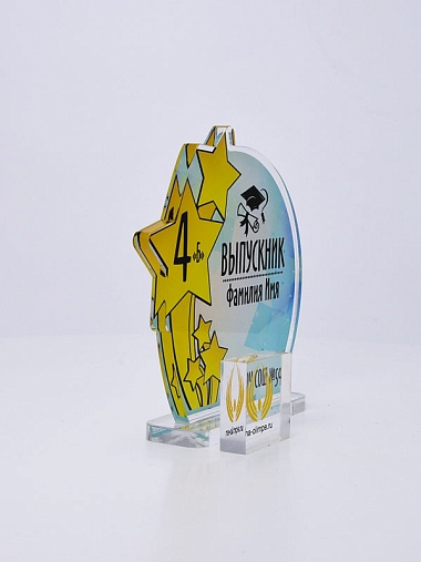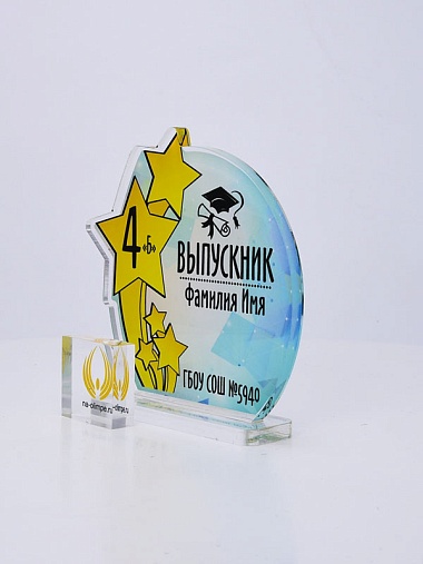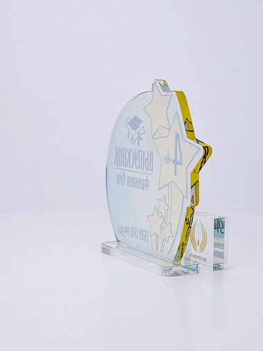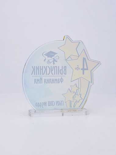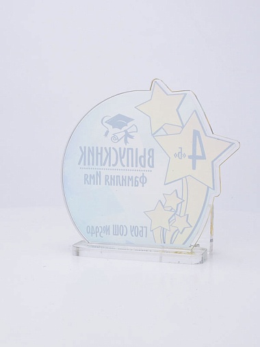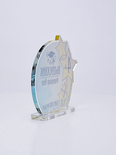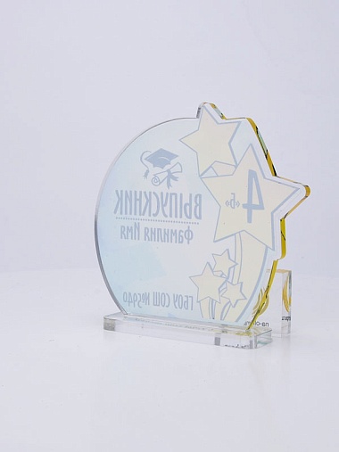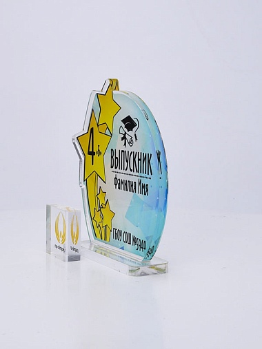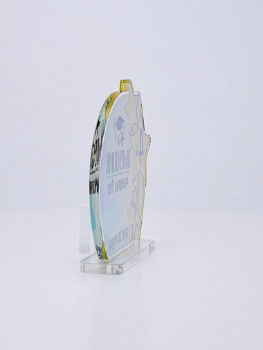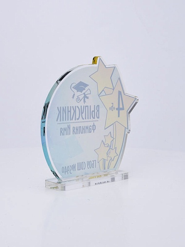 Выпускная награда выполнена из прозрачного акрила 6мм с полноцветной цифровой печатью текста по Вашему запросу.