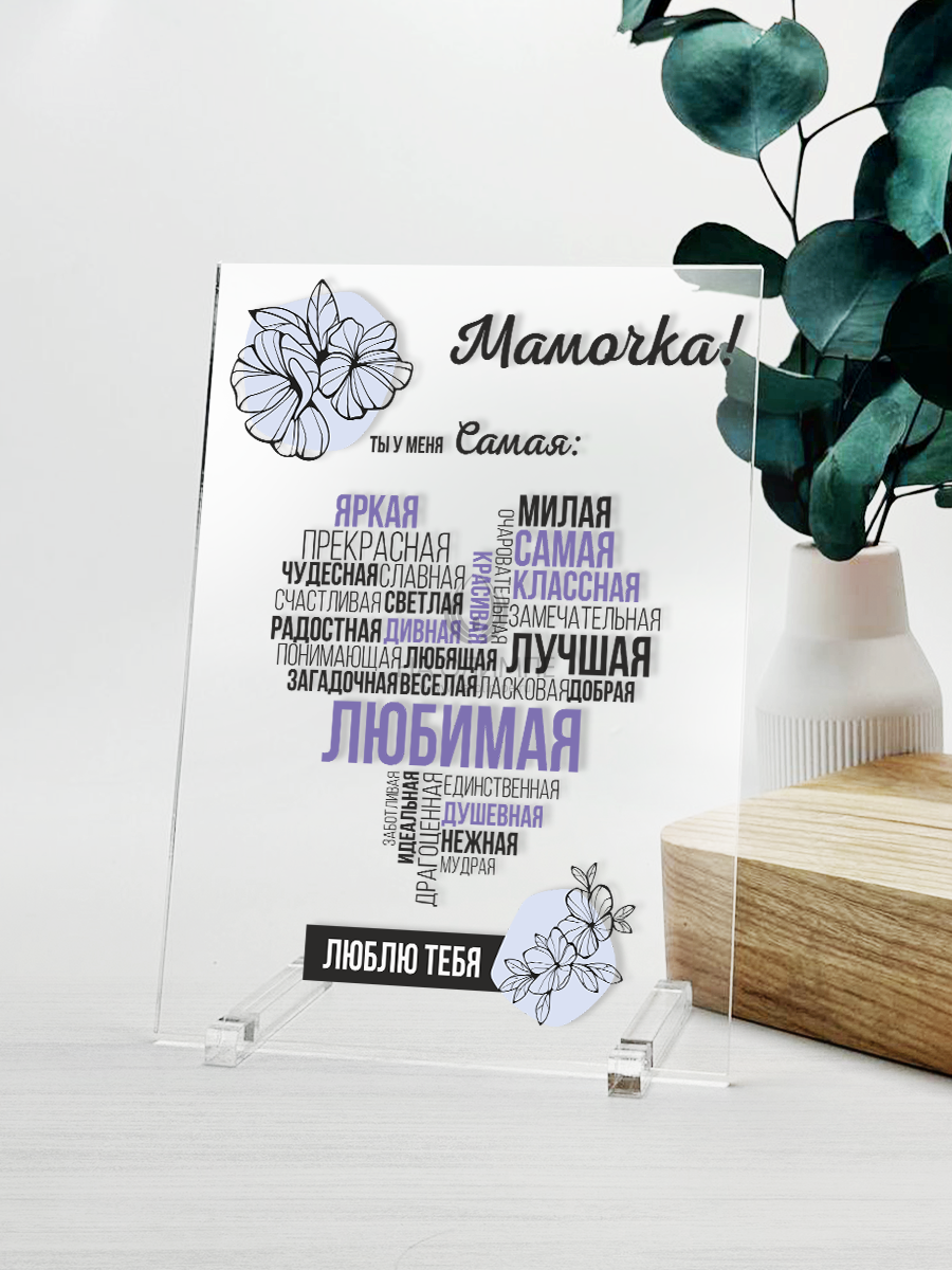 Постер открытка из прозрачного акрила с цветной печатью. В комплект входит прямоугольная пластина из акрила толщиной 3мм с готовым дизайном и две подставки.
