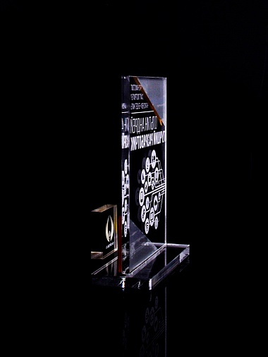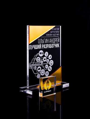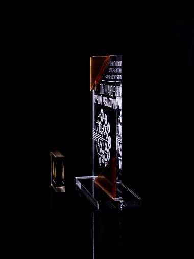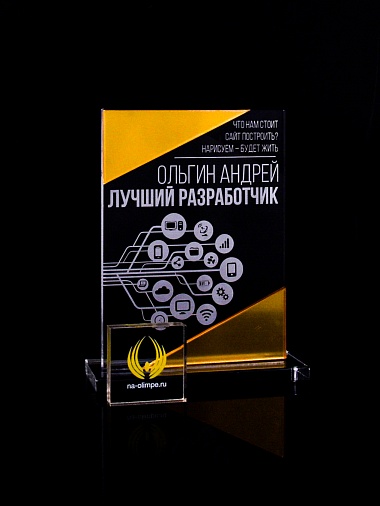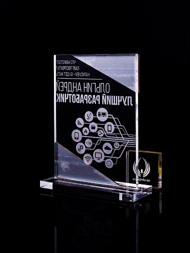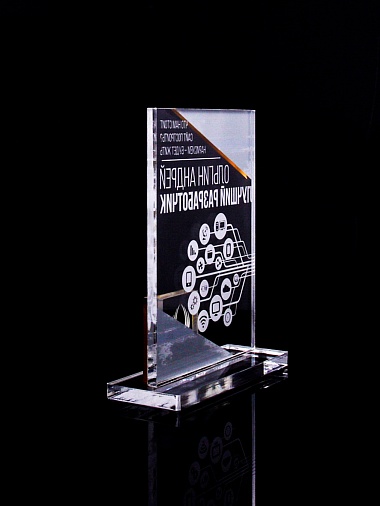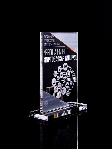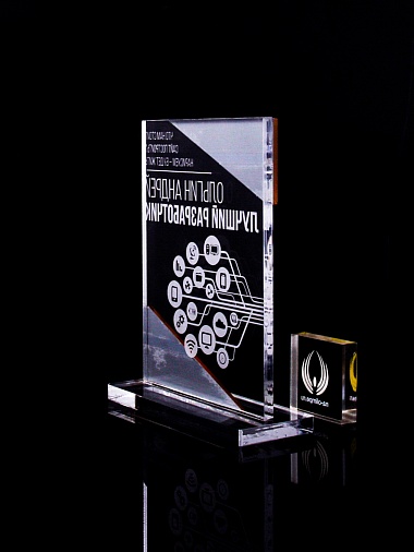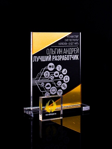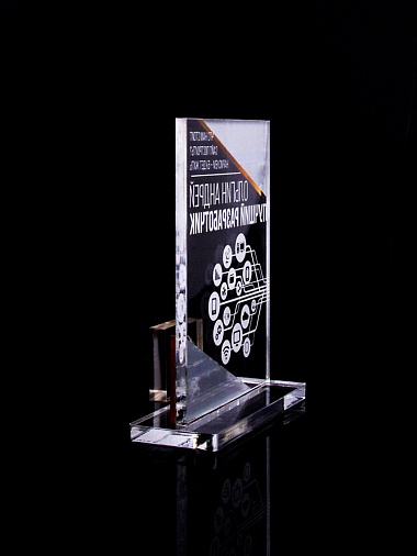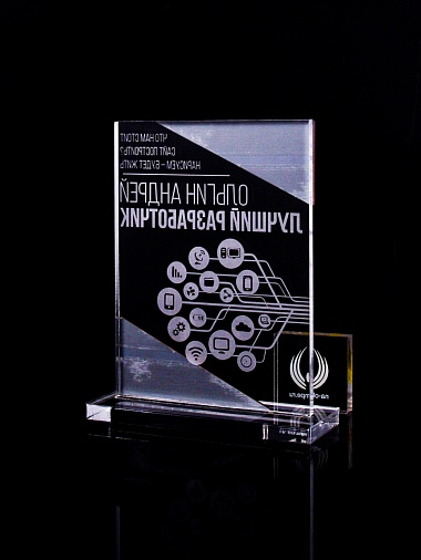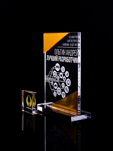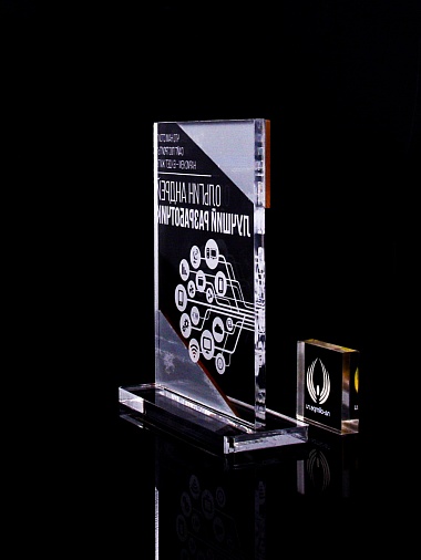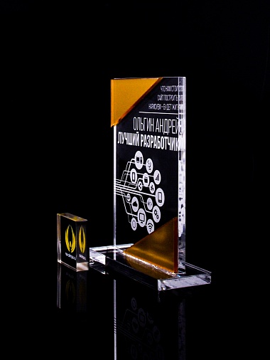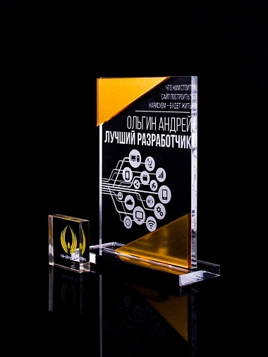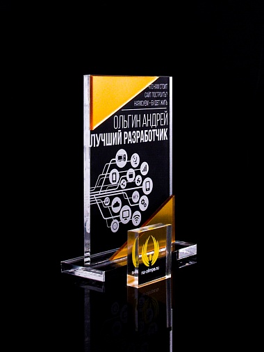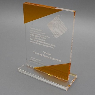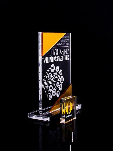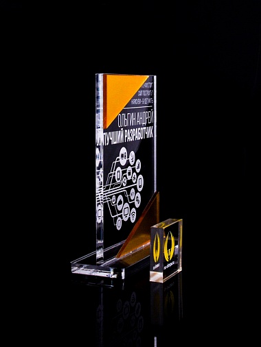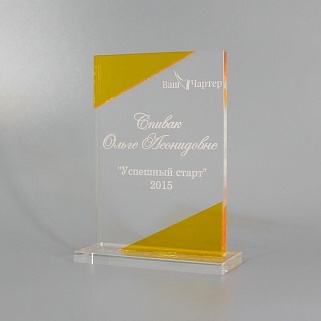 Приз из прозрачного и желтого акрила с лазерной гравировкой.