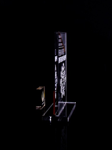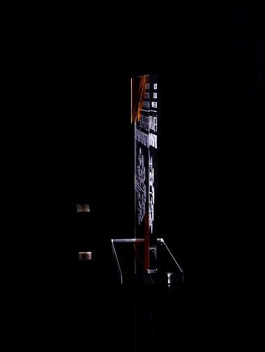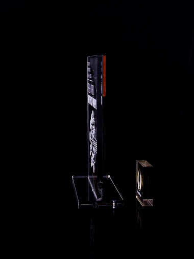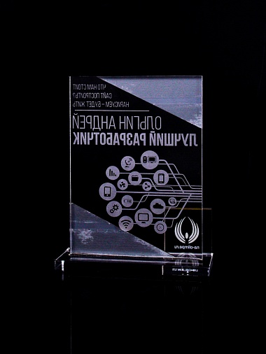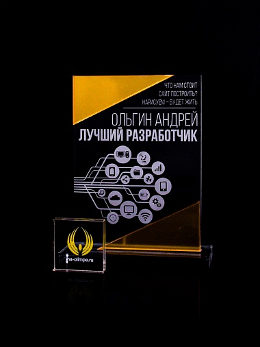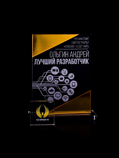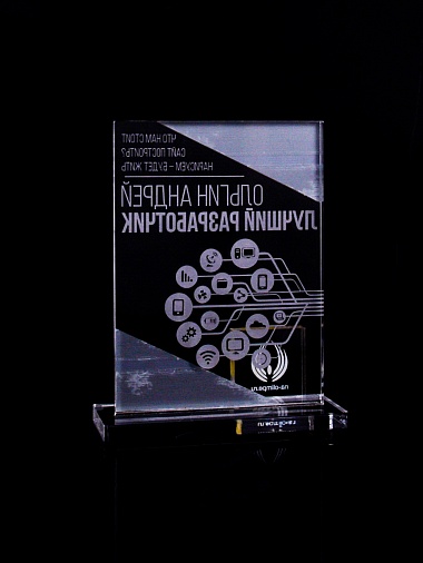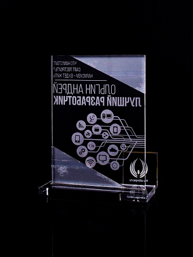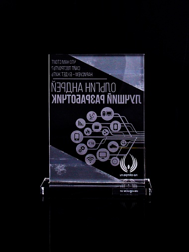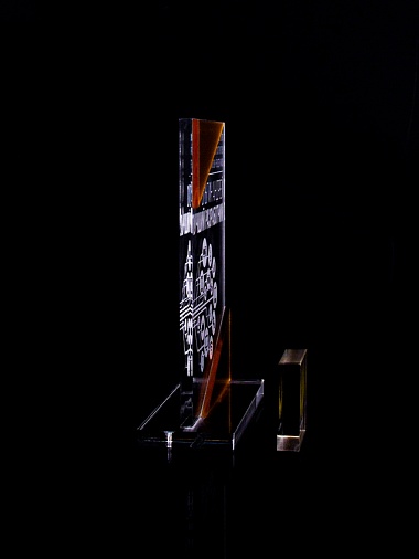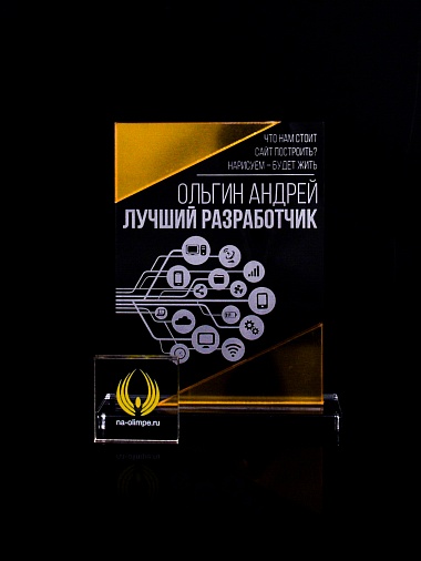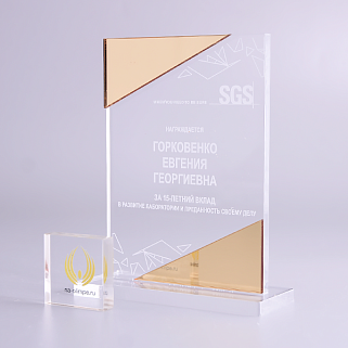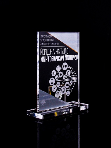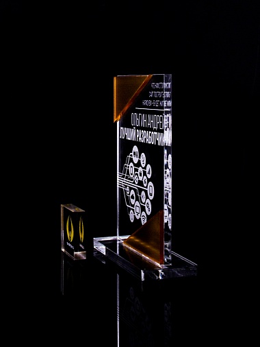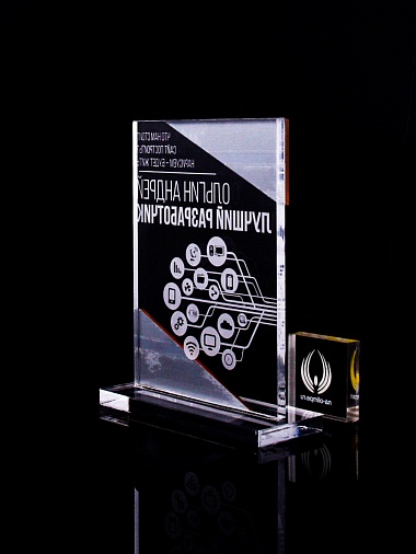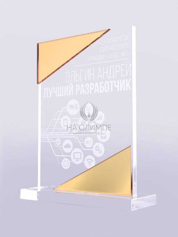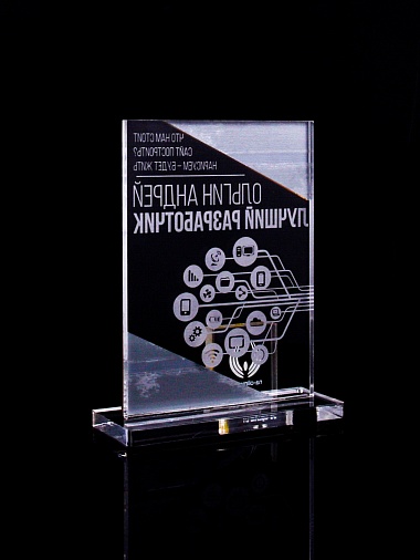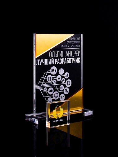 Приз из прозрачного и желтого акрила с лазерной гравировкой.