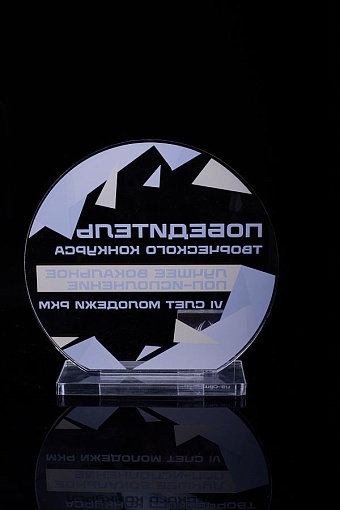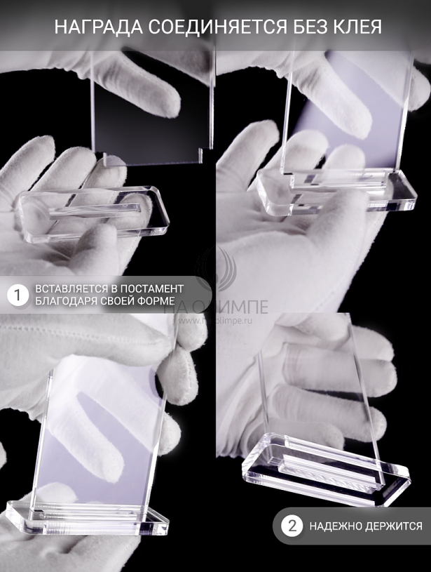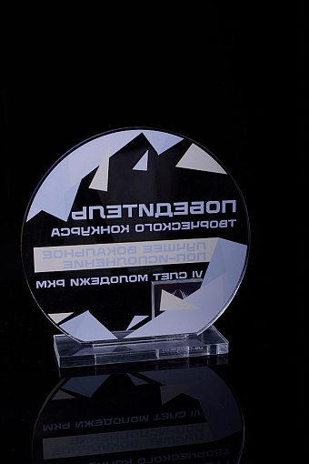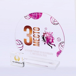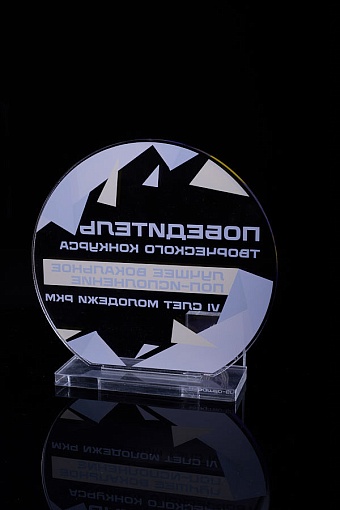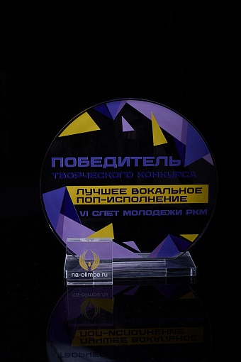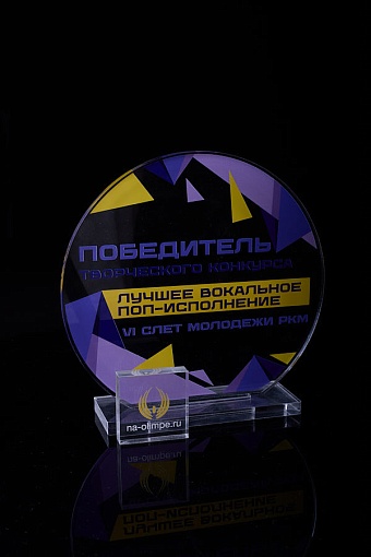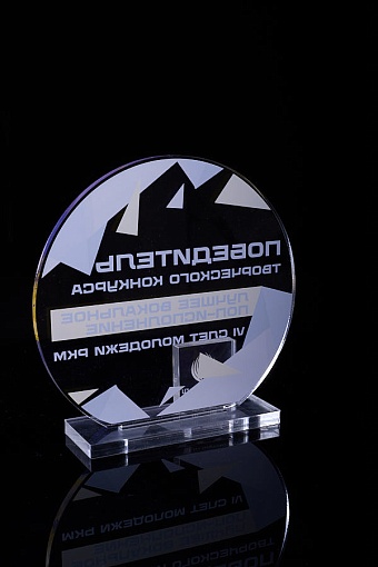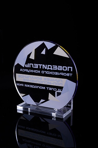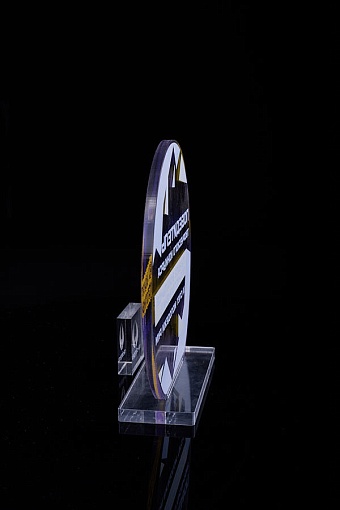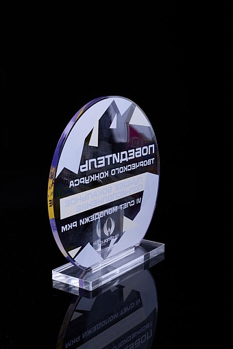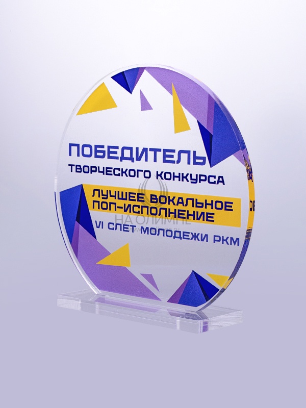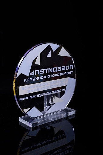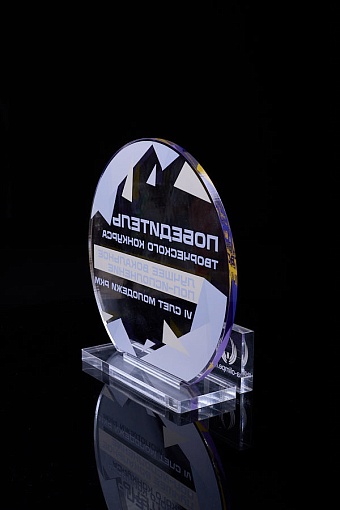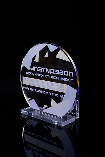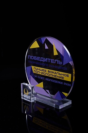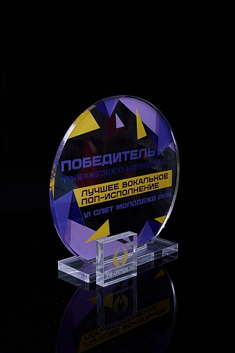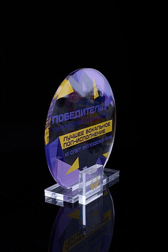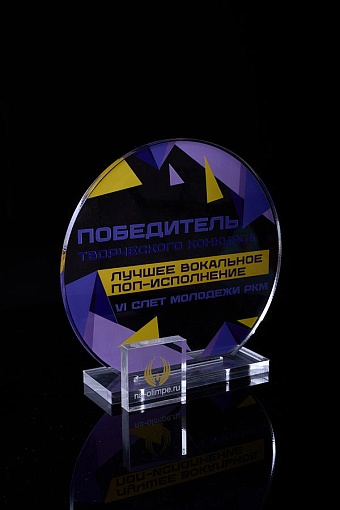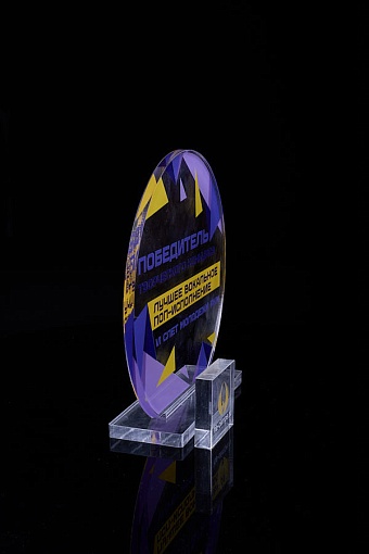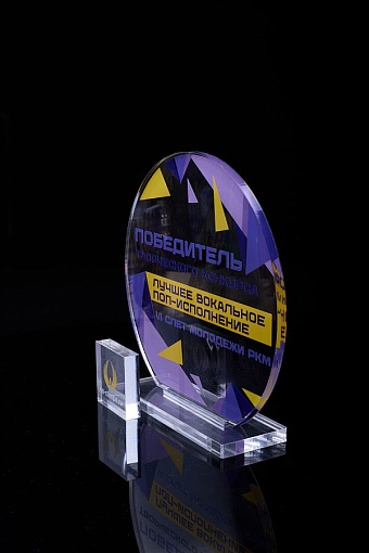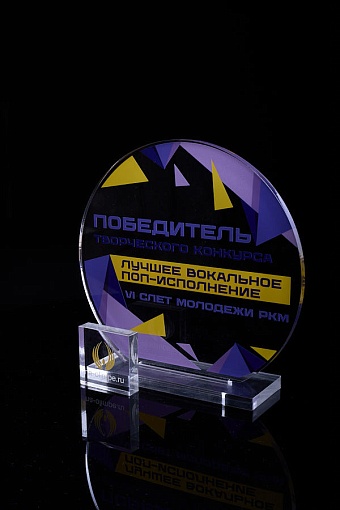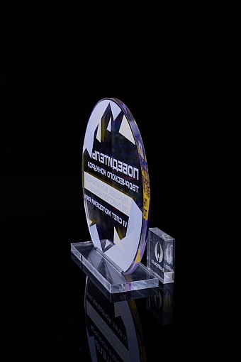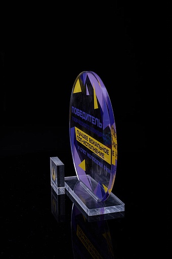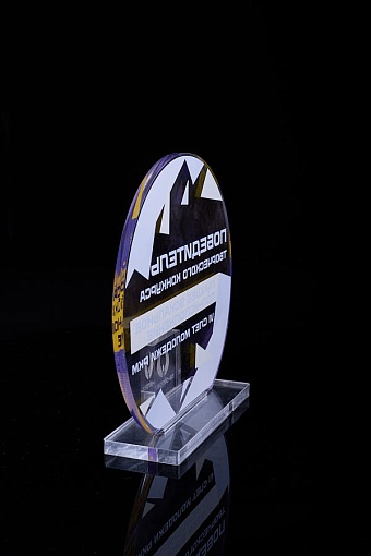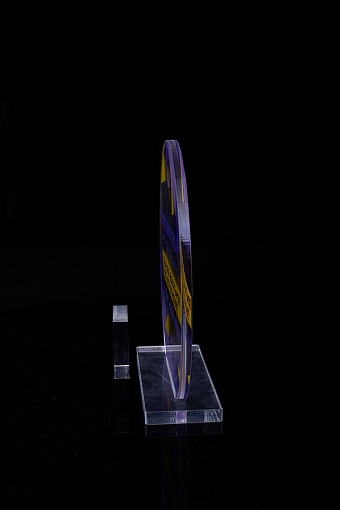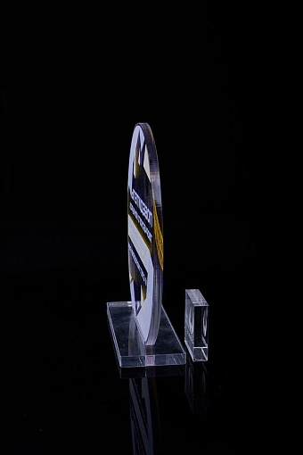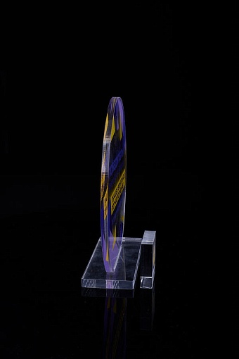 Награда из прозрачного акрила с цветной печатью на постаменте. Акриловая вертикальная основа вставляется в постамент в паз. Такая конструкция проста и надежна в эксплуатации и при транспортировке, так как не имеет склеенных элементов.