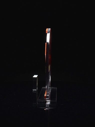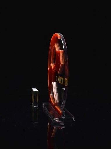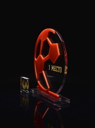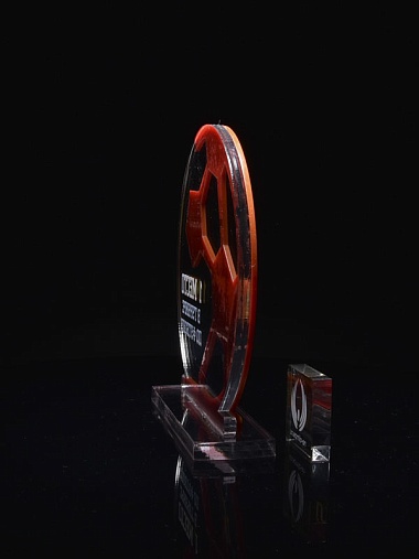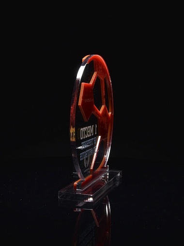 Приз из красного и прозрачного акрила с цветным нанесением.