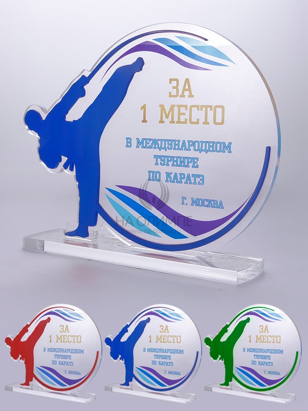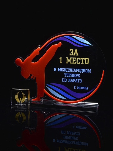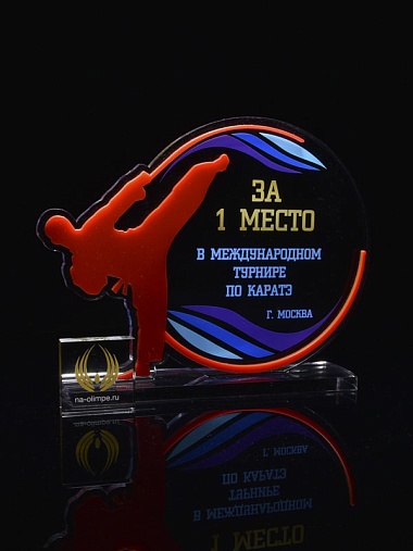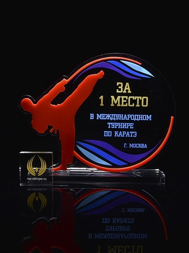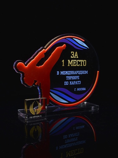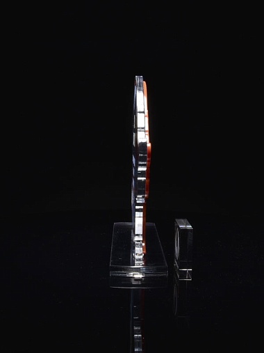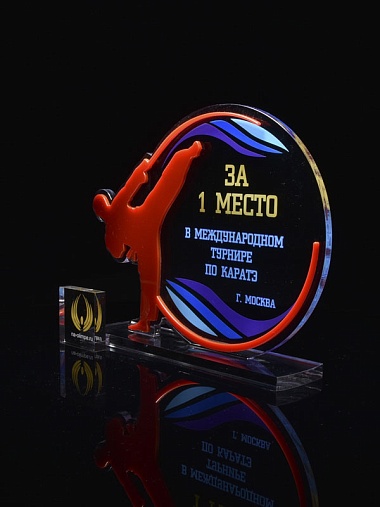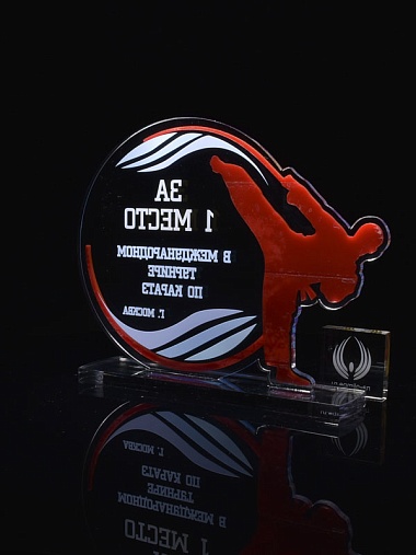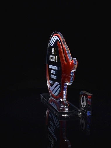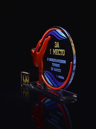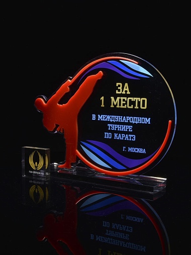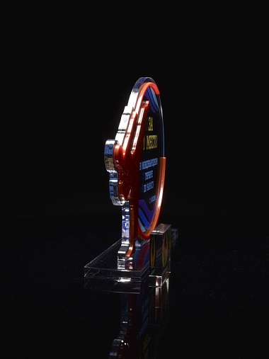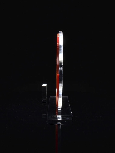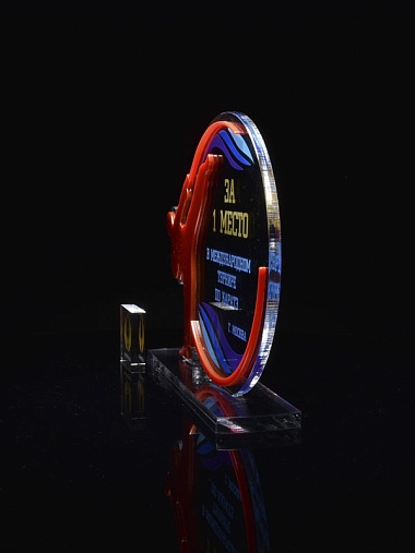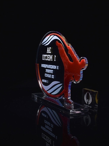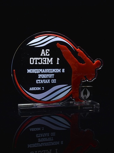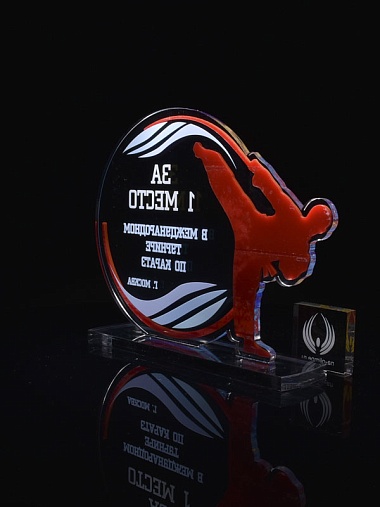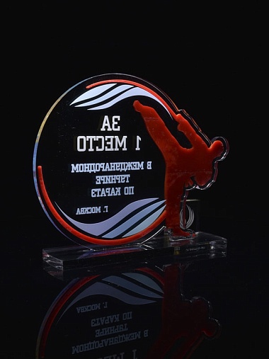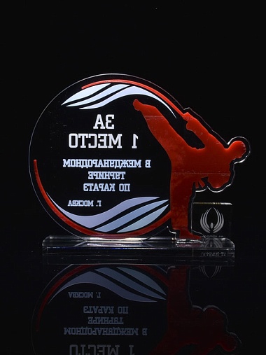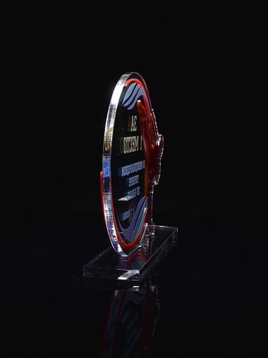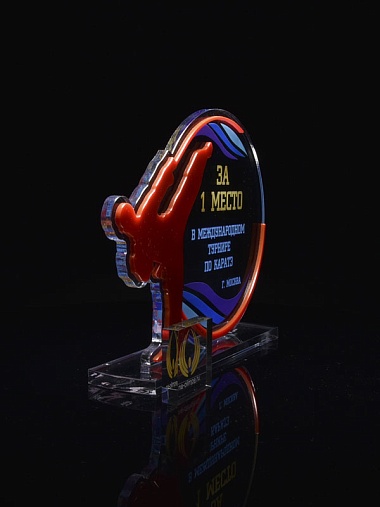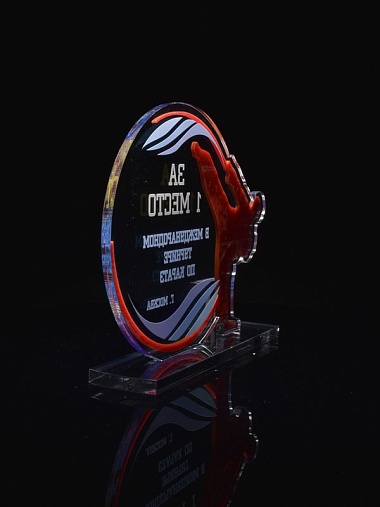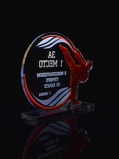 Приз из красного и прозрачного акрила с цветным нанесением.