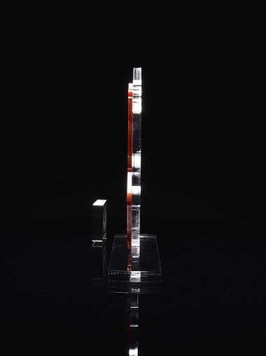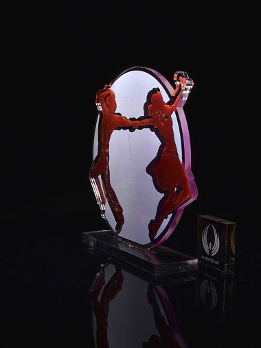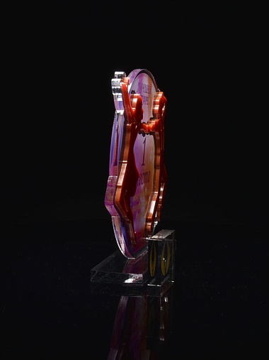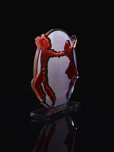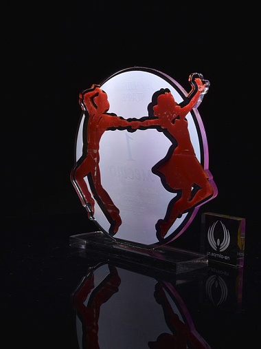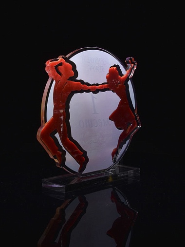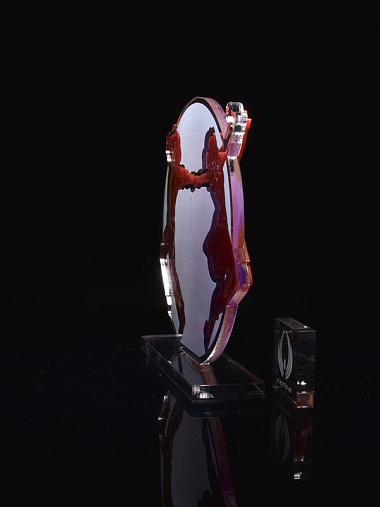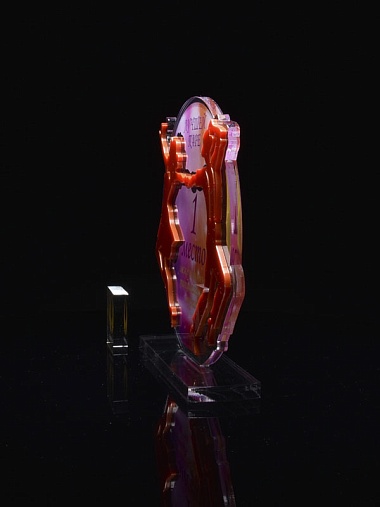 Приз из красного и прозрачного акрила с цветным нанесением.