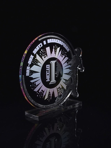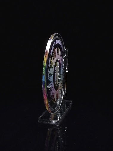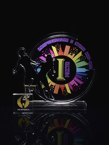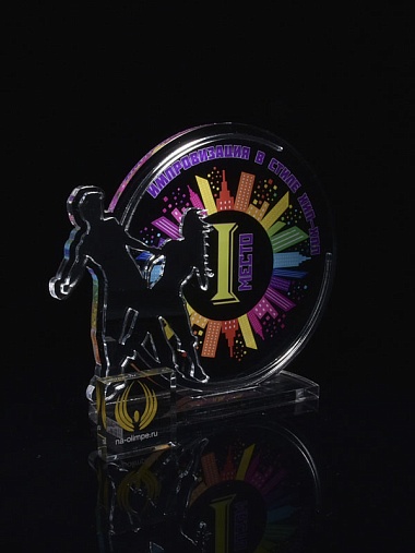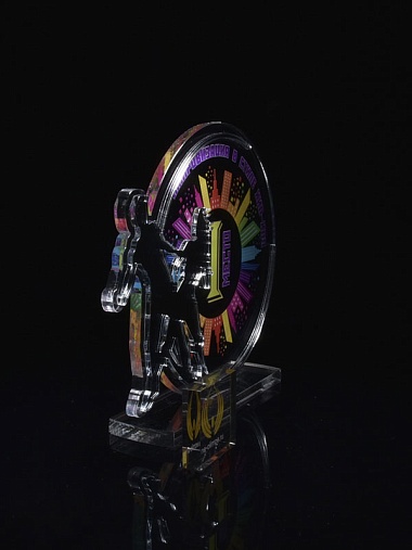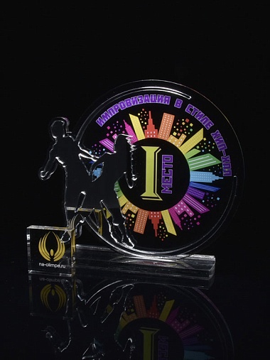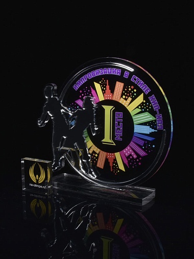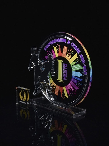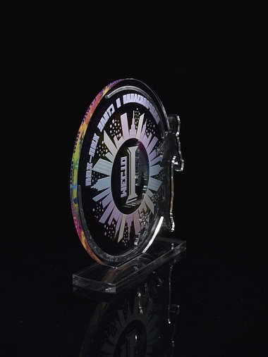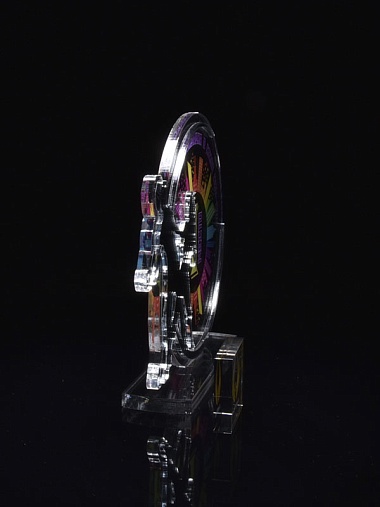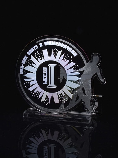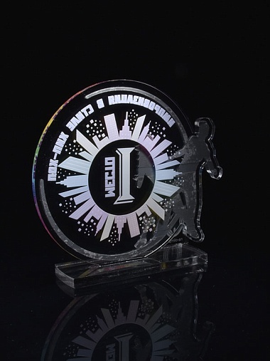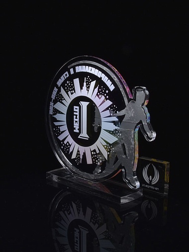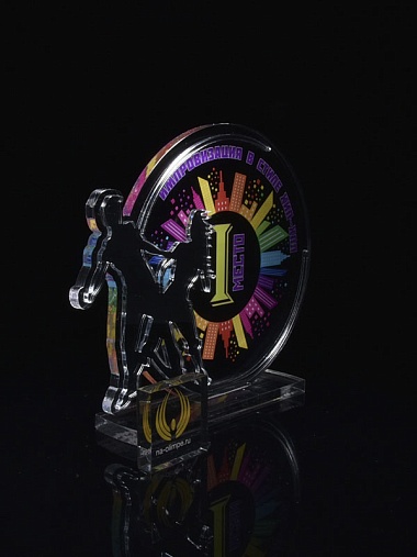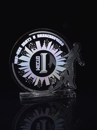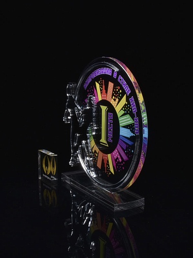 Приз из серебряного и прозрачного акрила с цветным нанесением.