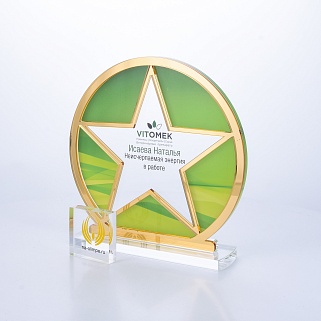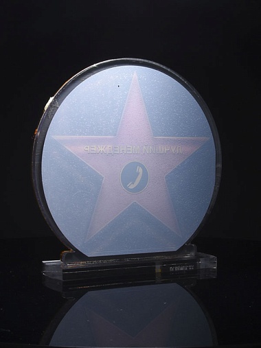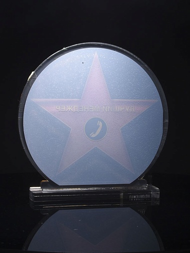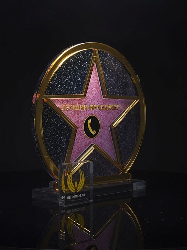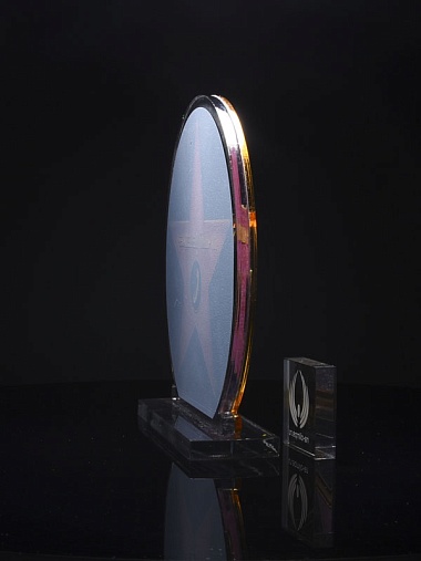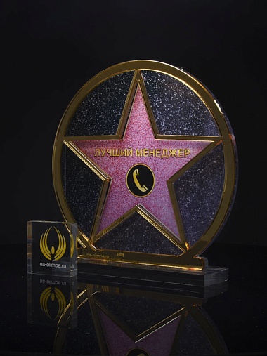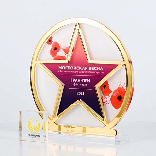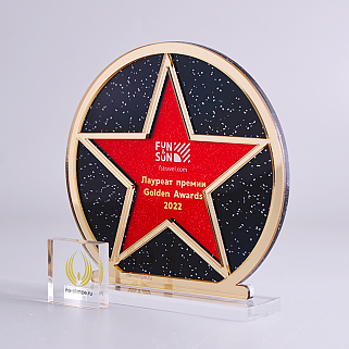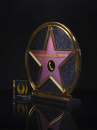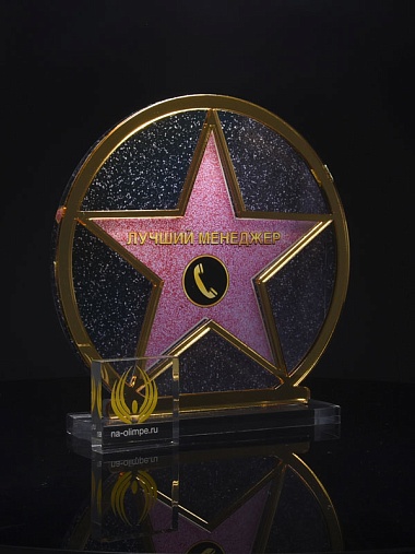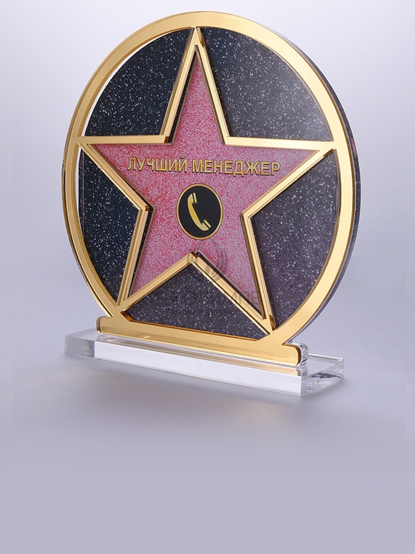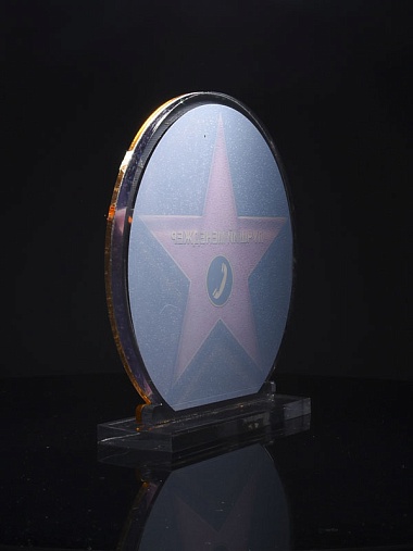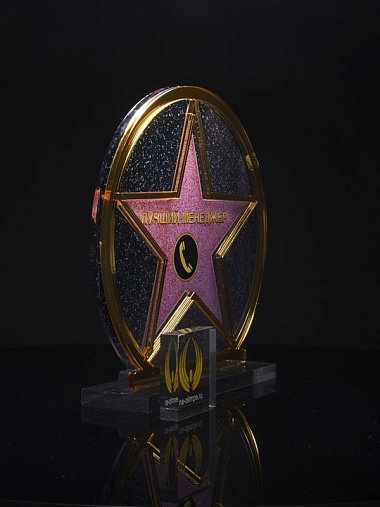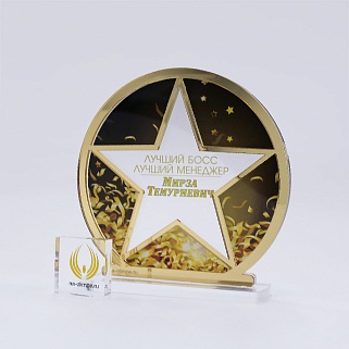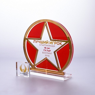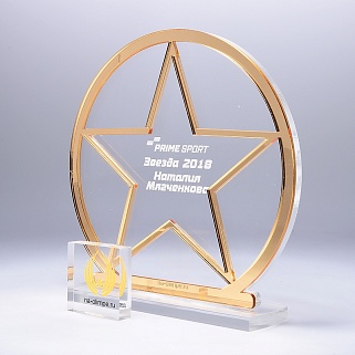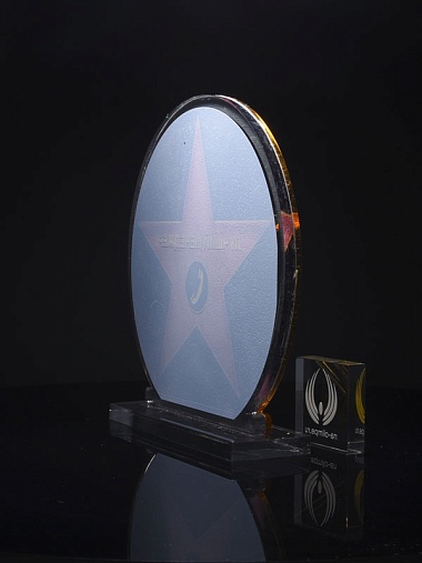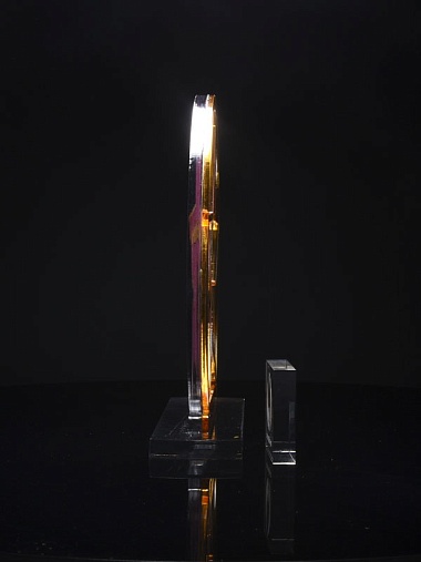 Приз из золотого и прозрачного акрила с цветным нанесением.