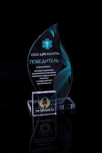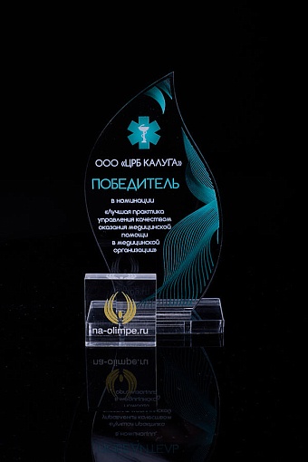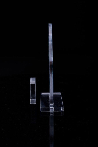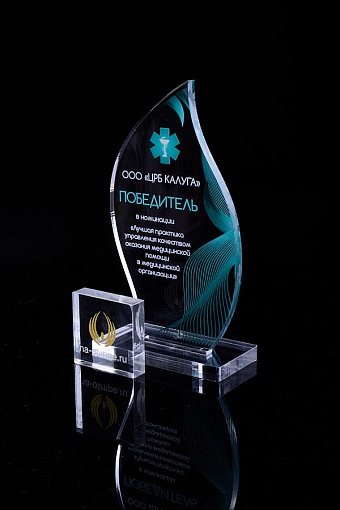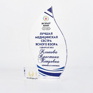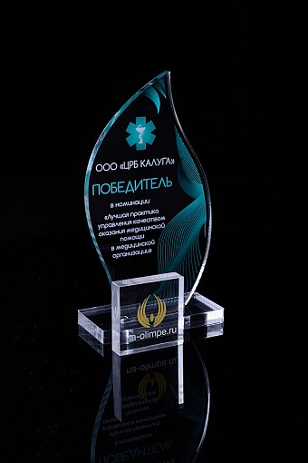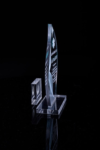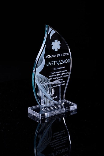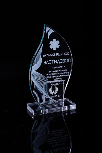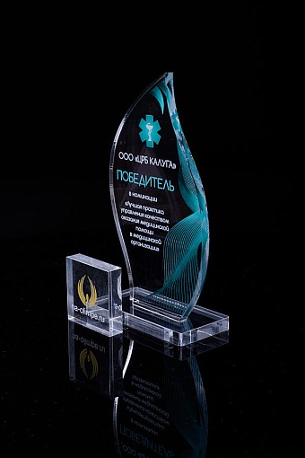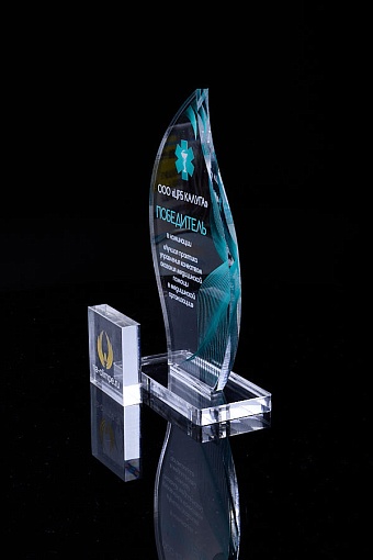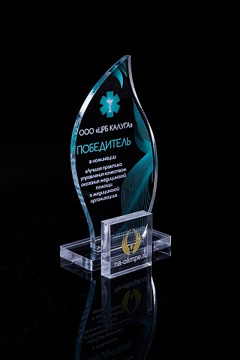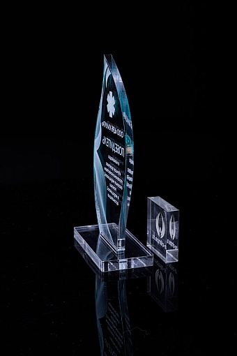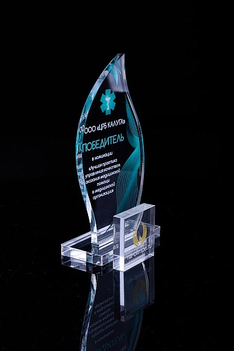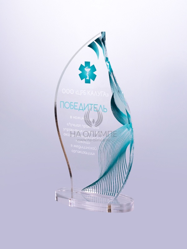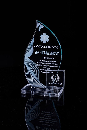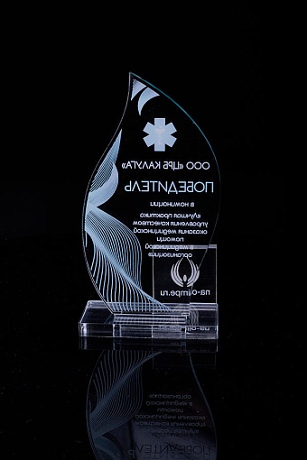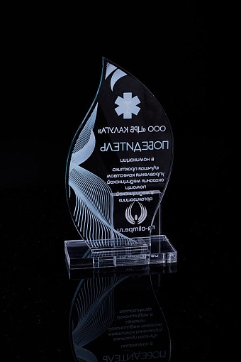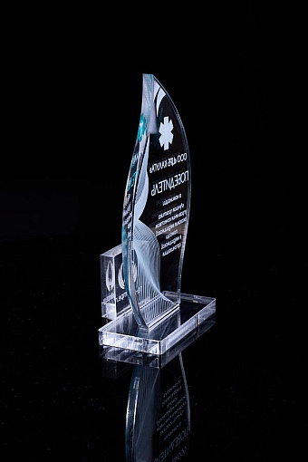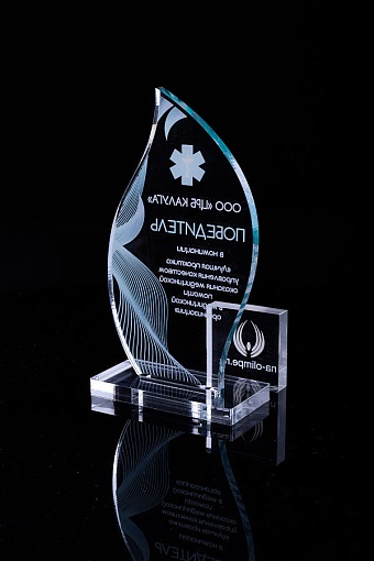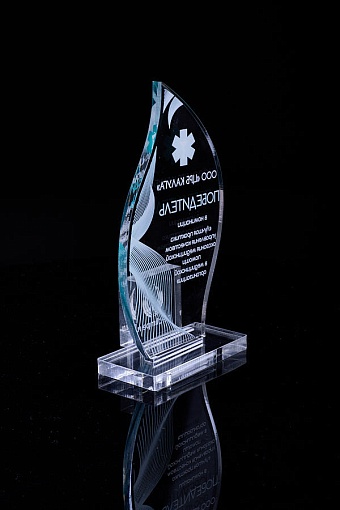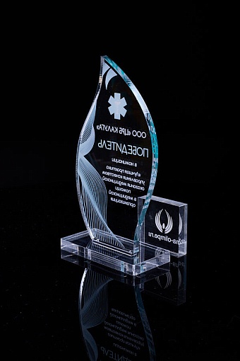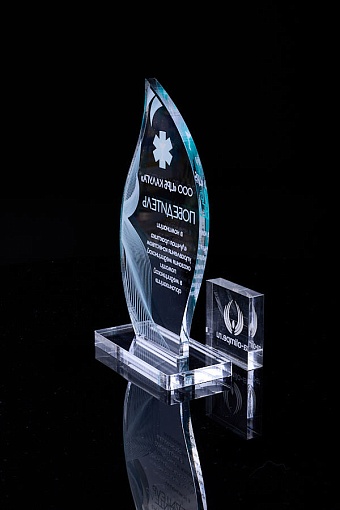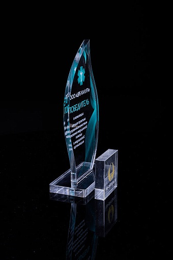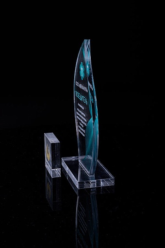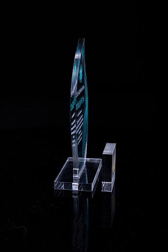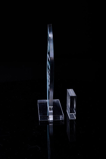 Награда из прозрачного акрила с цветной печатью на постаменте. Акриловая вертикальная основа вставляется в постамент в паз. Такая конструкция проста и надежна в эксплуатации и при транспортировке, так как не имеет склеенных элементов.