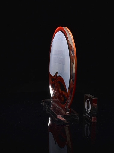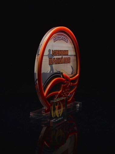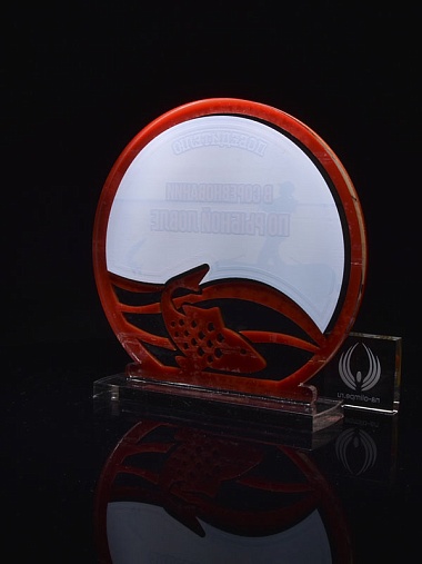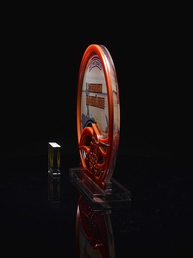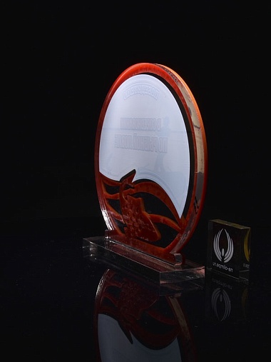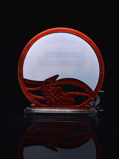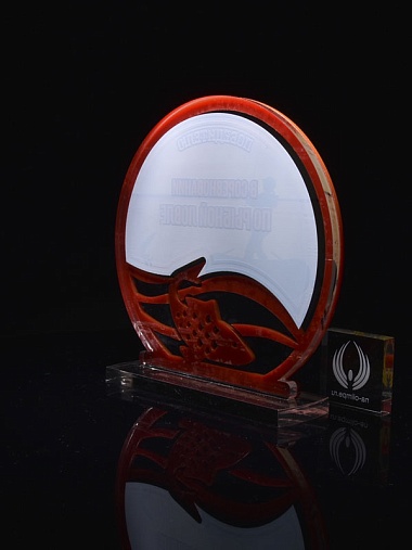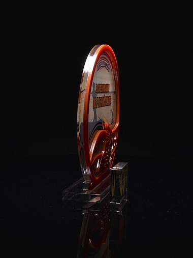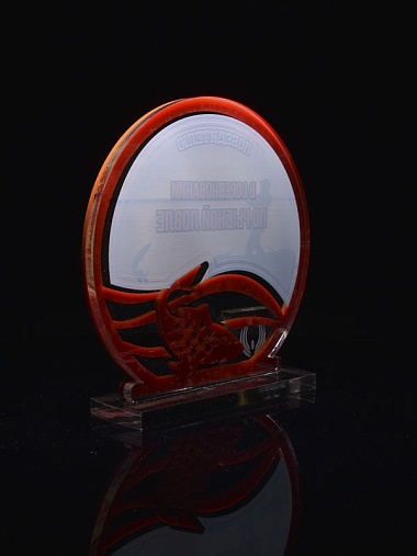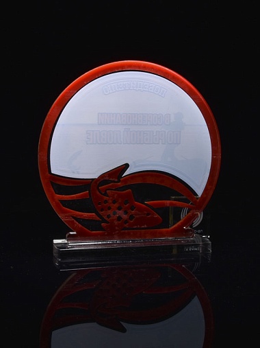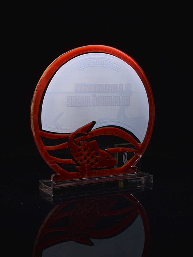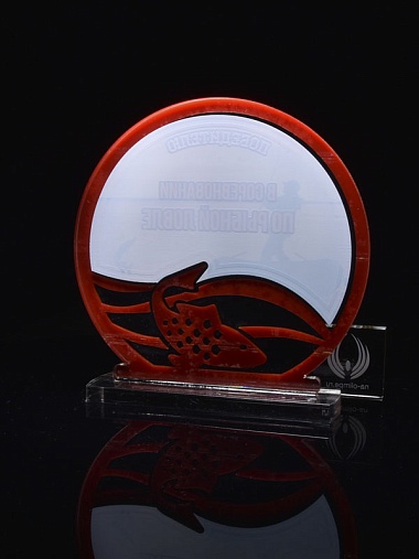 Приз из красного и прозрачного акрила с цветным нанесением.