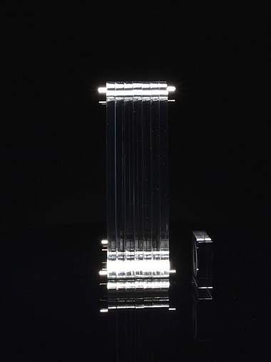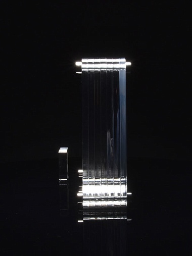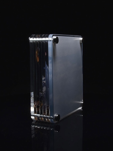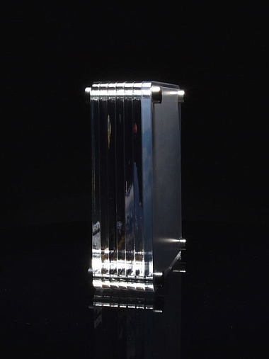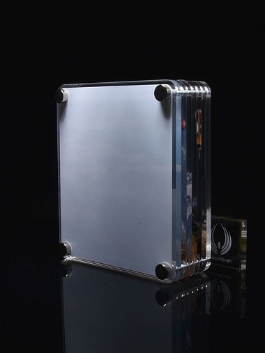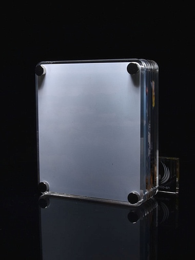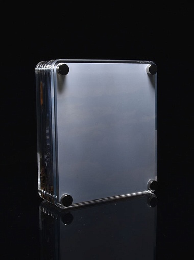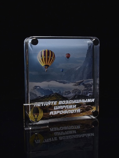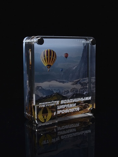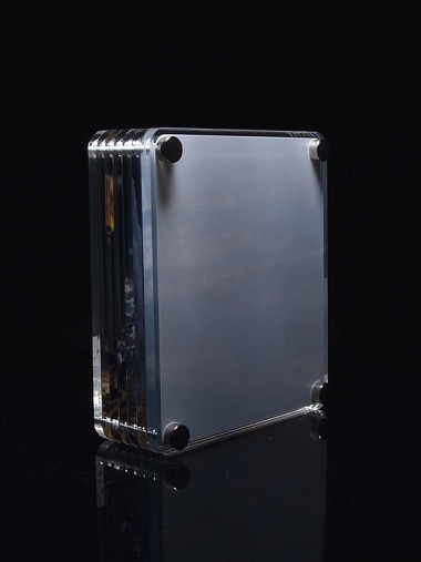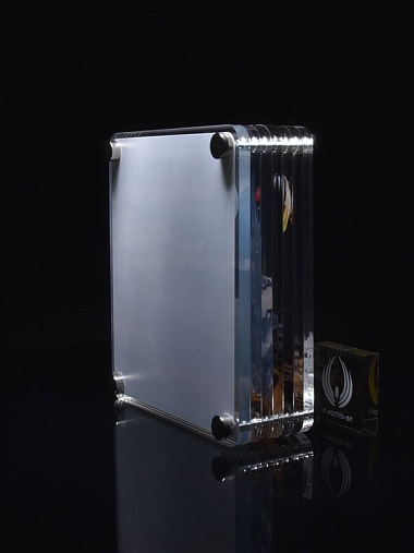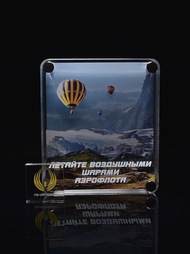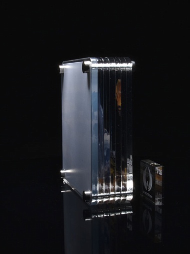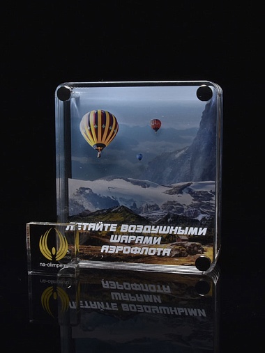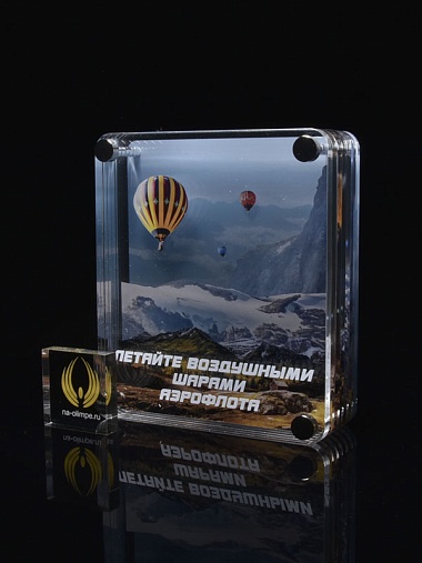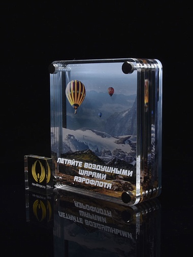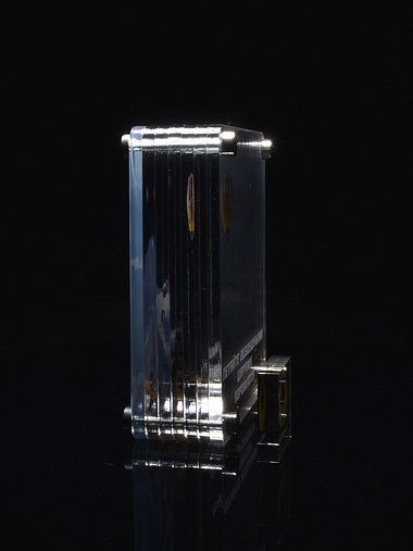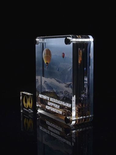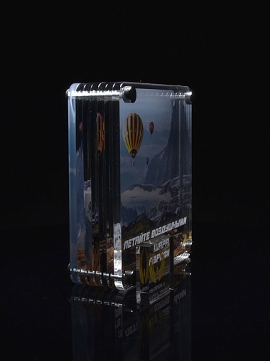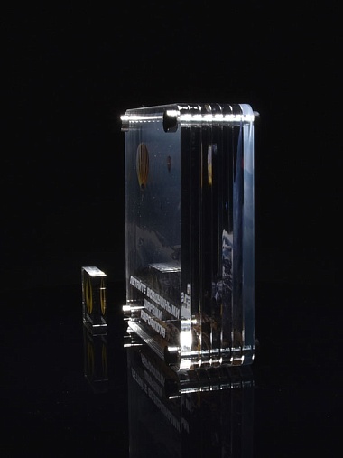 Приз из семи слоёв прозрачного акрила, скреплённых декоративными держателями. Послойное нанесение на каждом слое цветного изображения даёт 3D эффект.