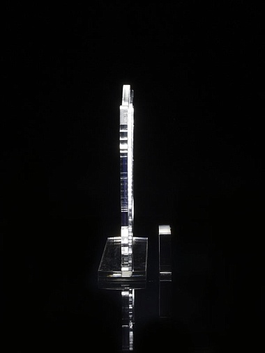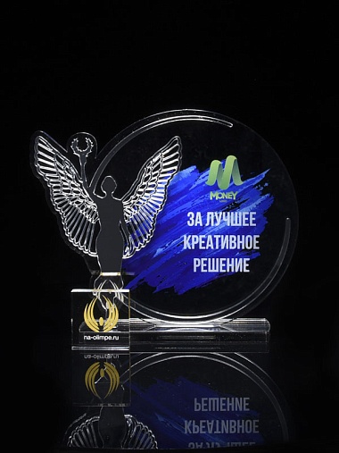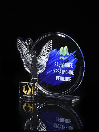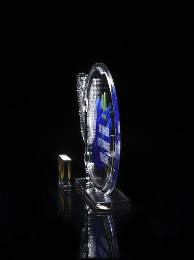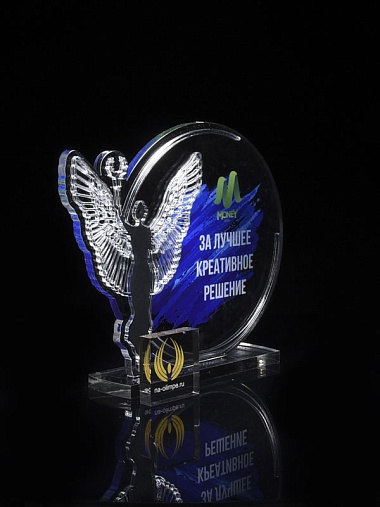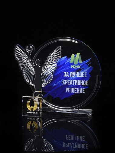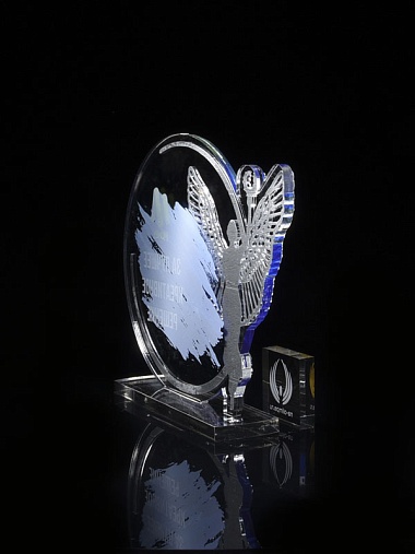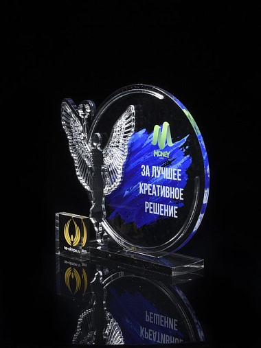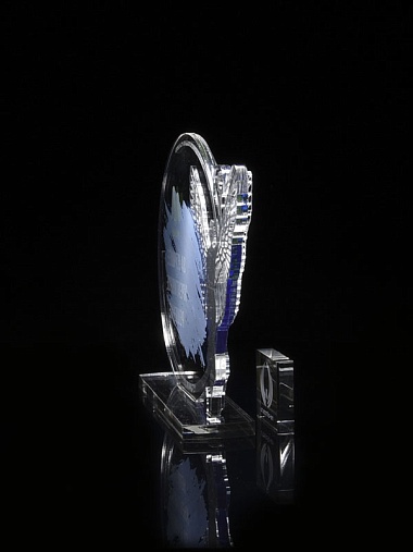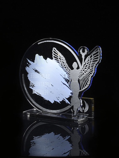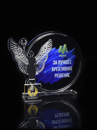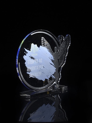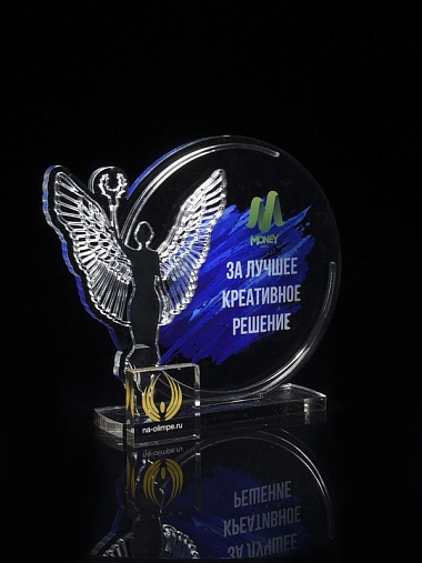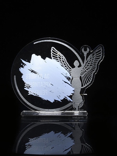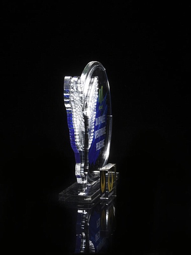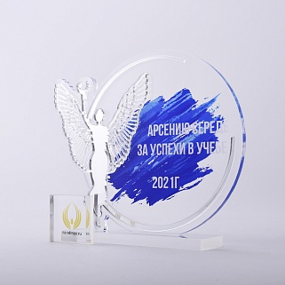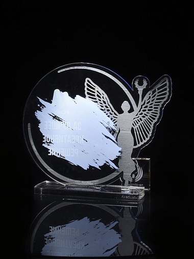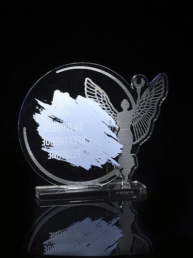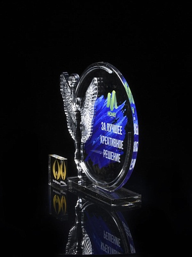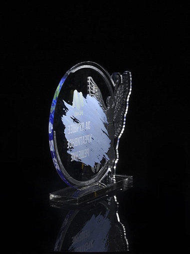 Приз из прозрачного и серебряного акрила с цветной печатью.