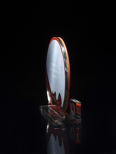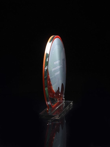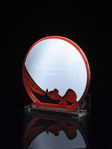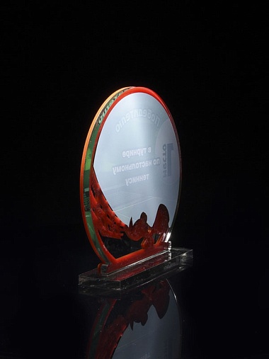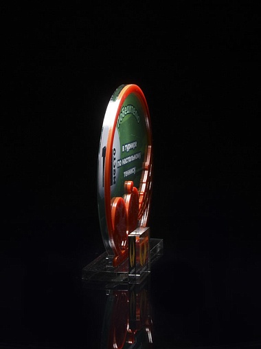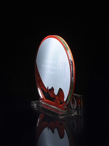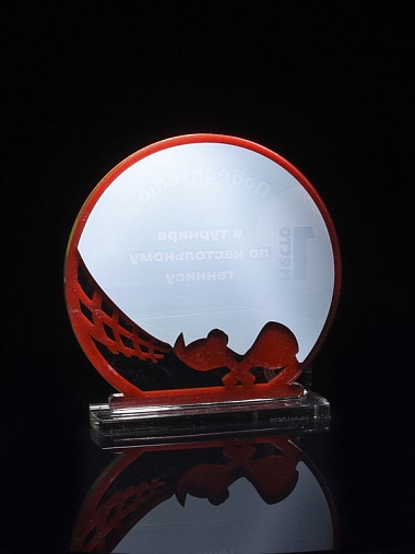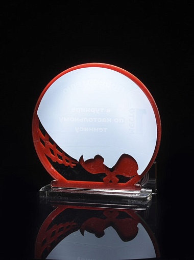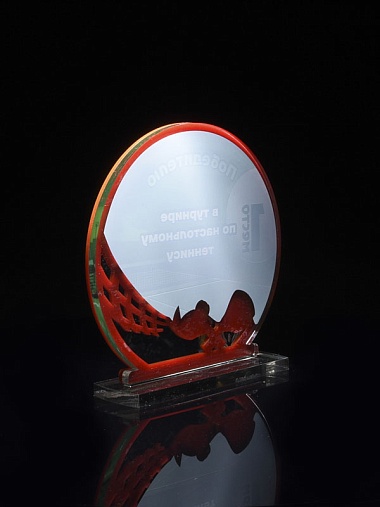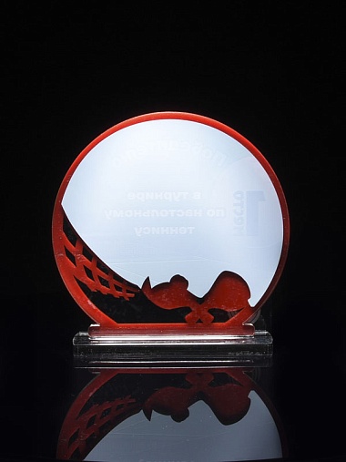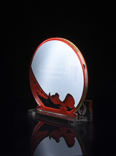 Приз из прозрачного и красного акрила с цветной печатью.