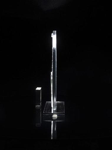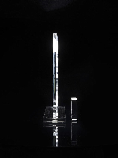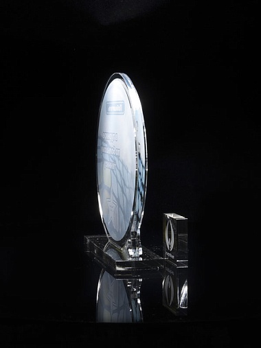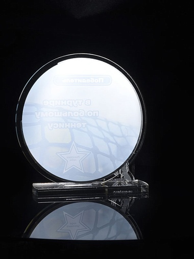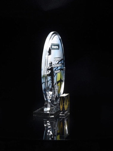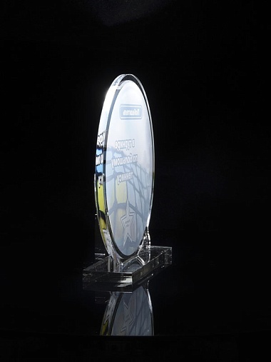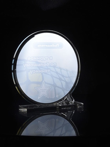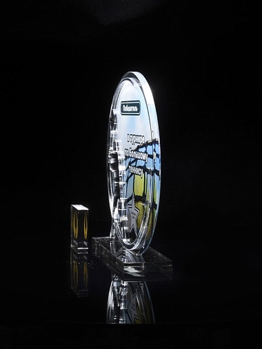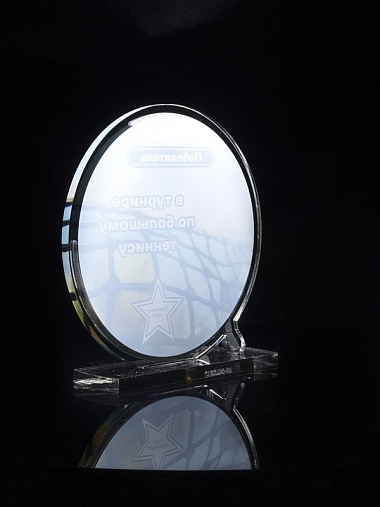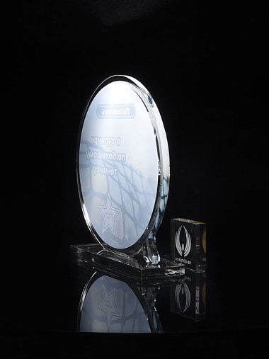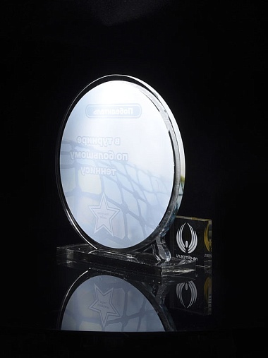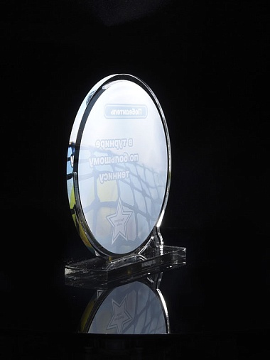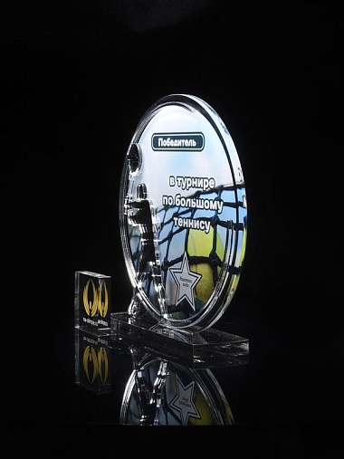 Приз из прозрачного и серебряного акрила с цветной печатью.