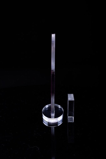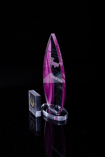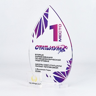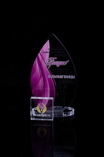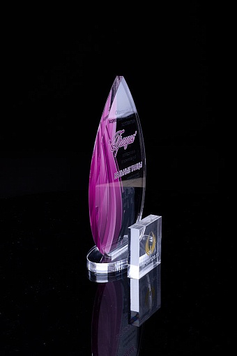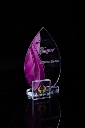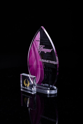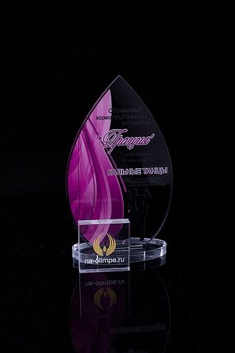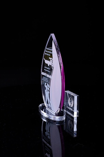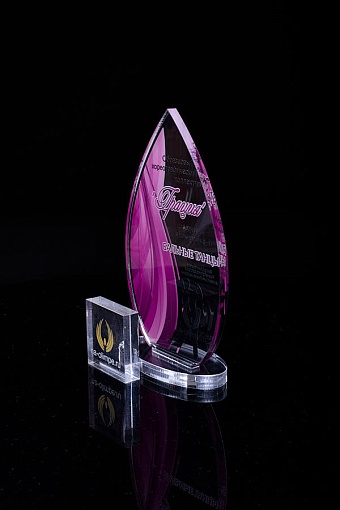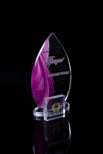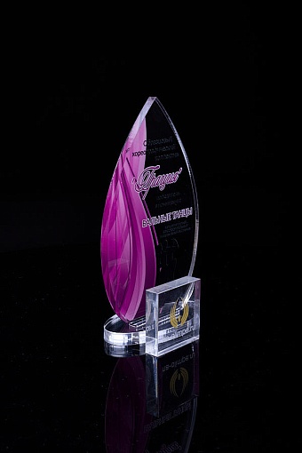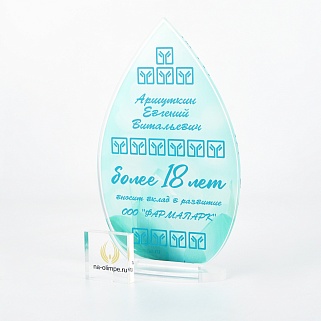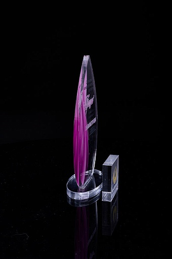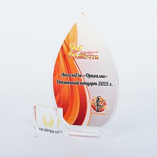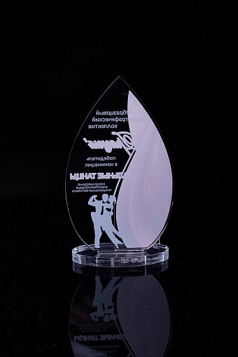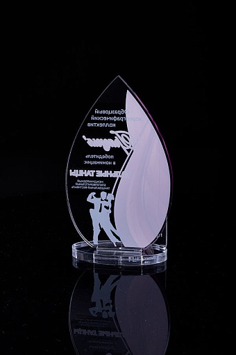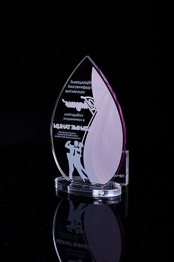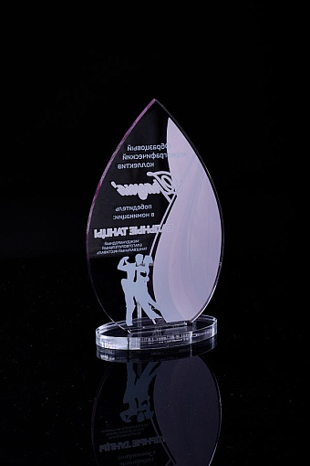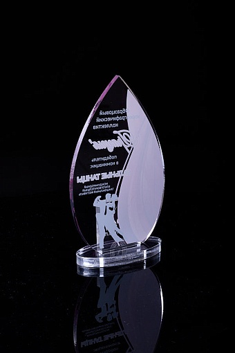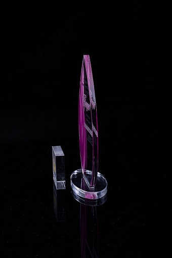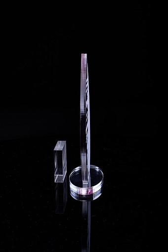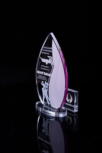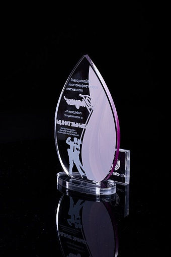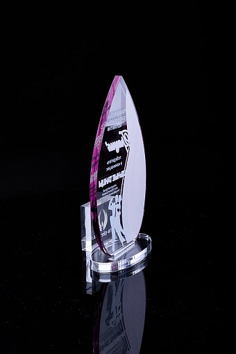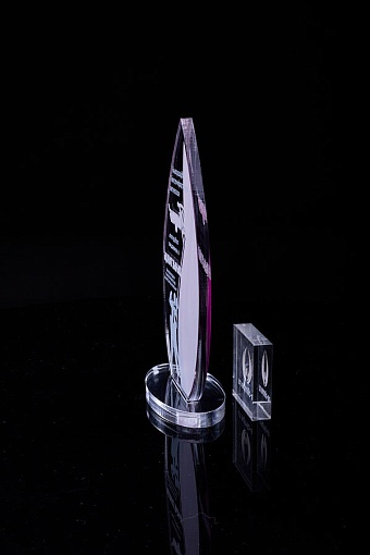 Награда из прозрачного акрила с цветной печатью на постаменте. Акриловая вертикальная основа вставляется в постамент в паз. Такая конструкция проста и надежна в эксплуатации и при транспортировке, так как не имеет склеенных элементов.