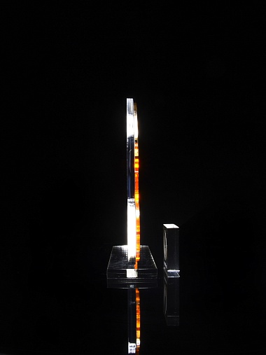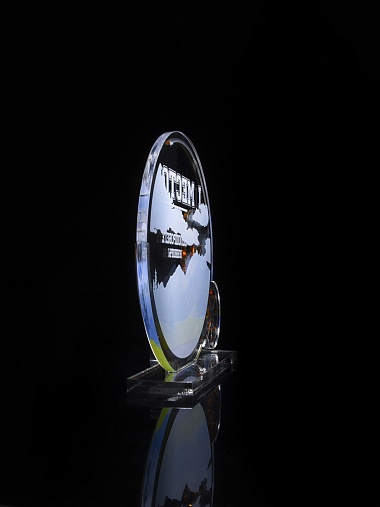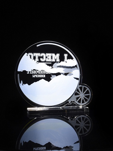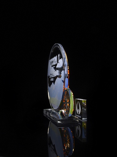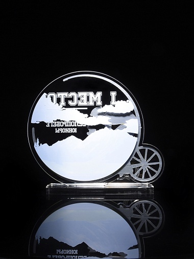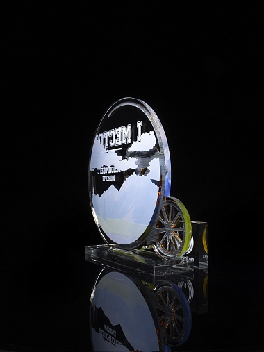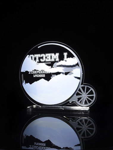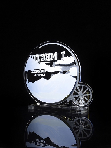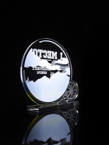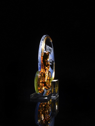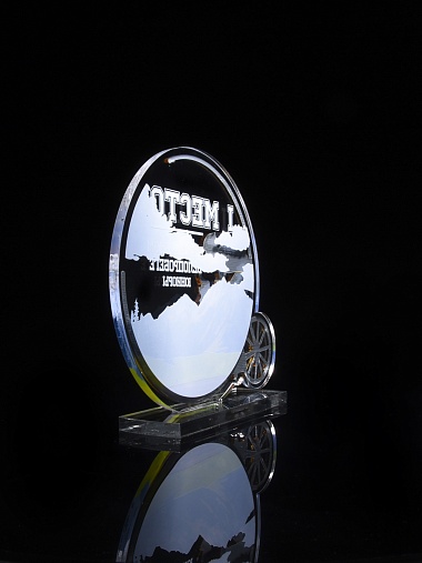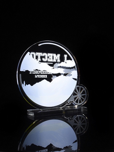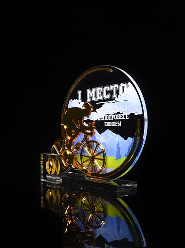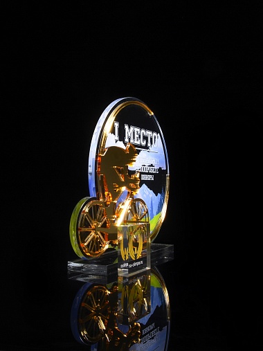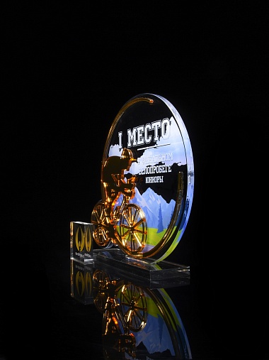 Приз из прозрачного и золотого акрила с цветной печатью высотой 160 мм.