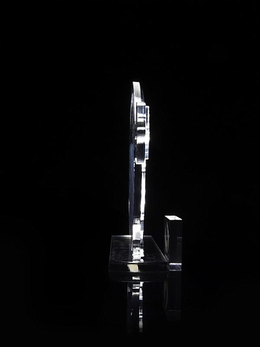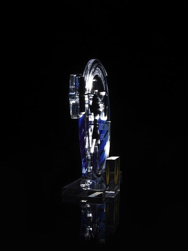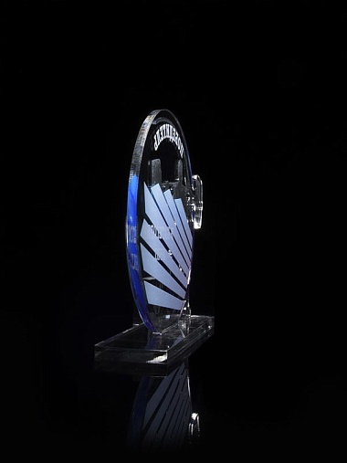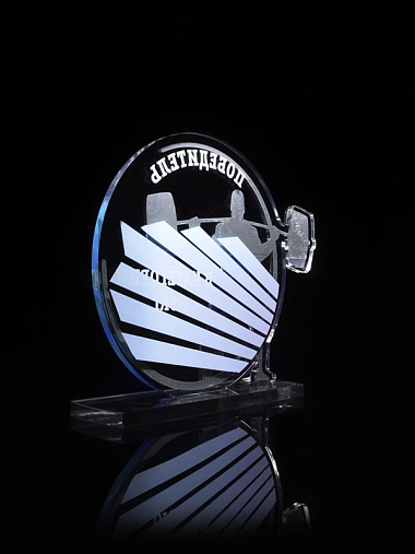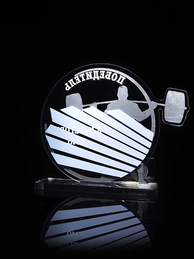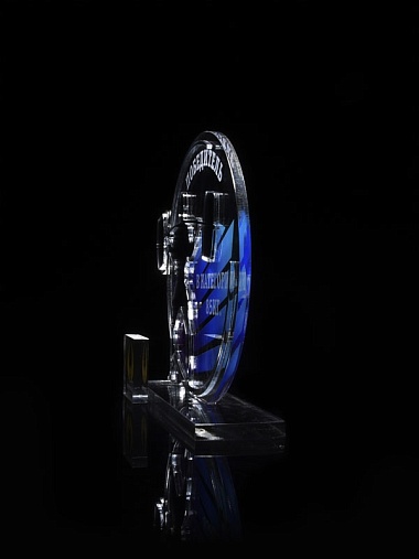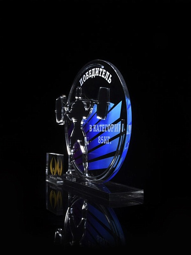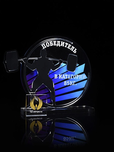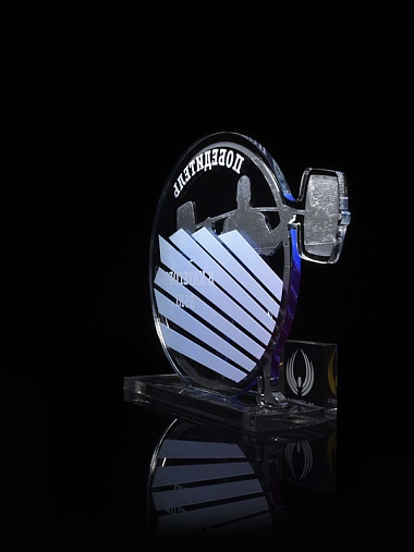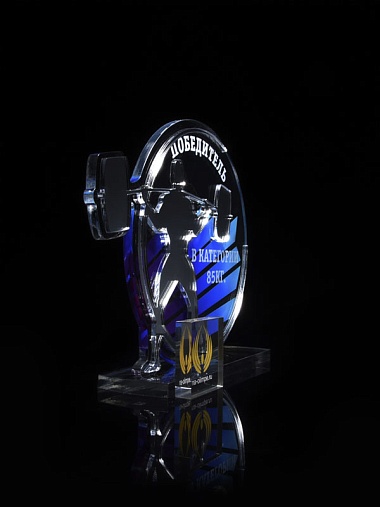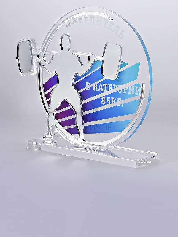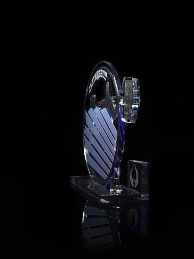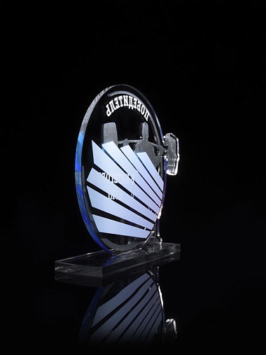 Приз из прозрачного и золотого акрила с цветной печатью высотой 160 мм.