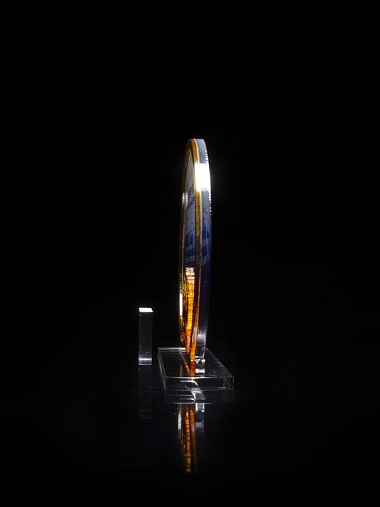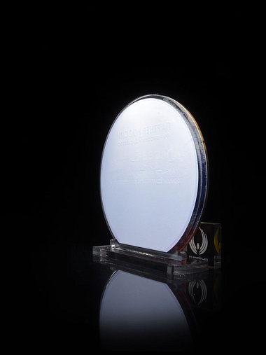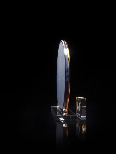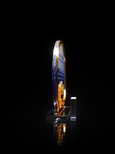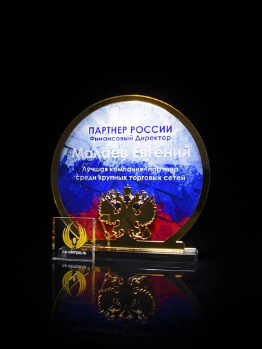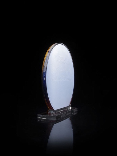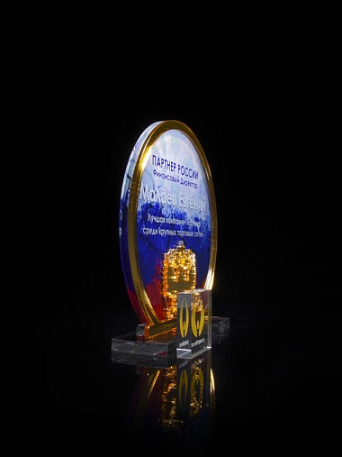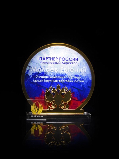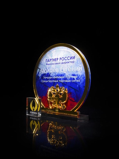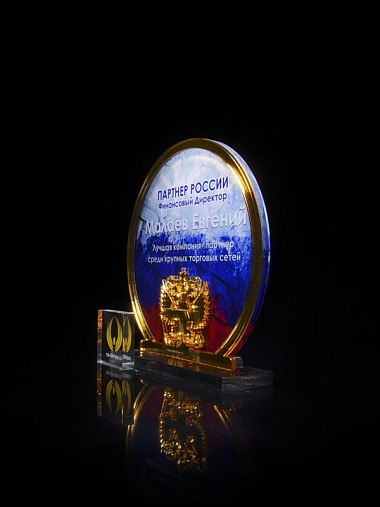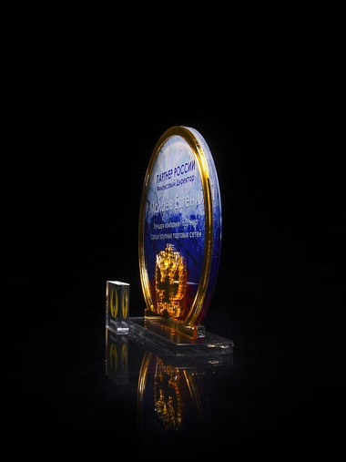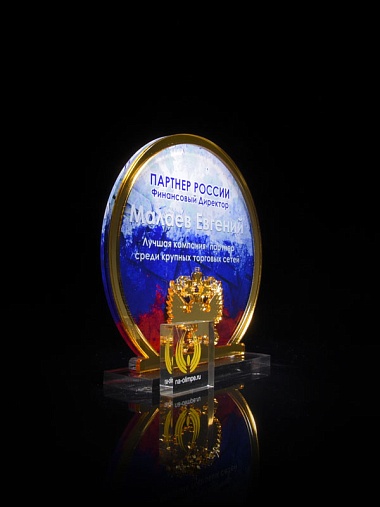 Приз из прозрачного и золотого акрила с цветной печатью высотой 160 мм.