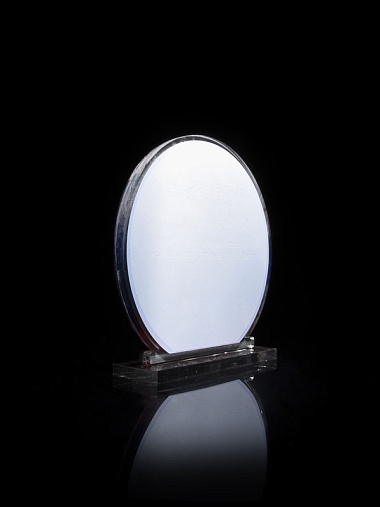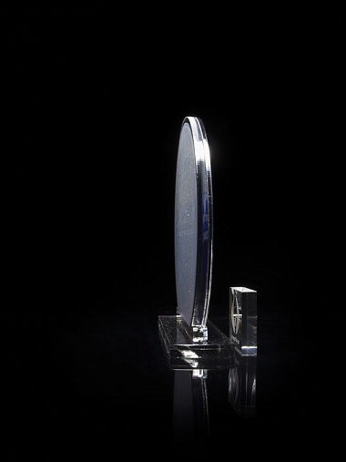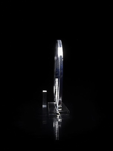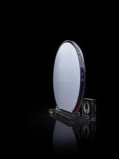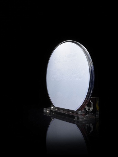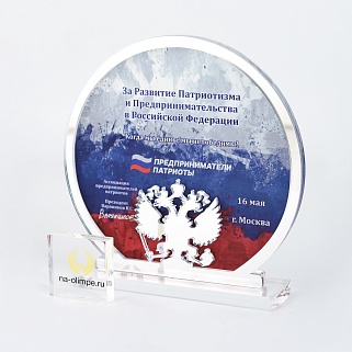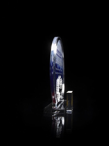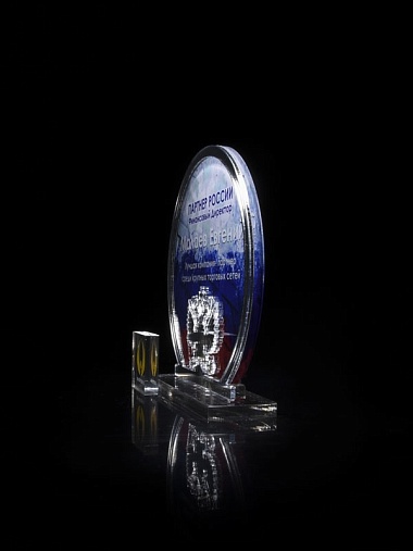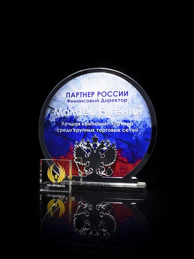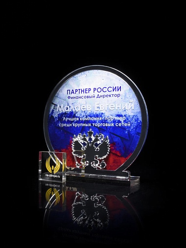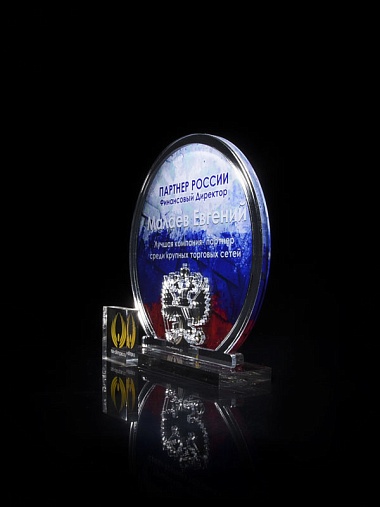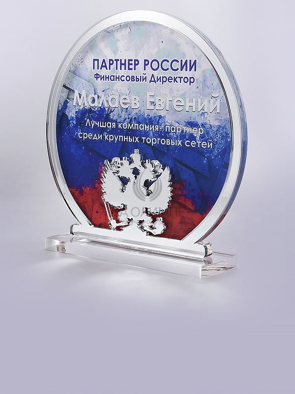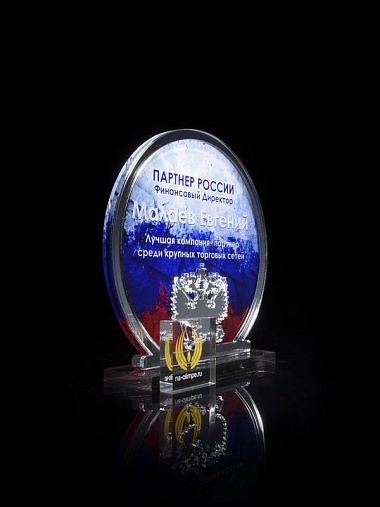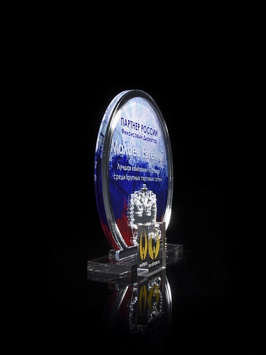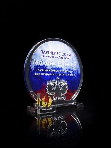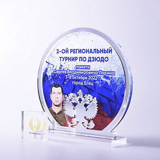Приз из прозрачного и золотого акрила с цветной печатью высотой 160 мм.