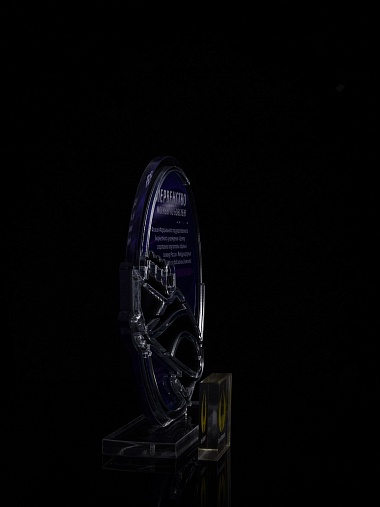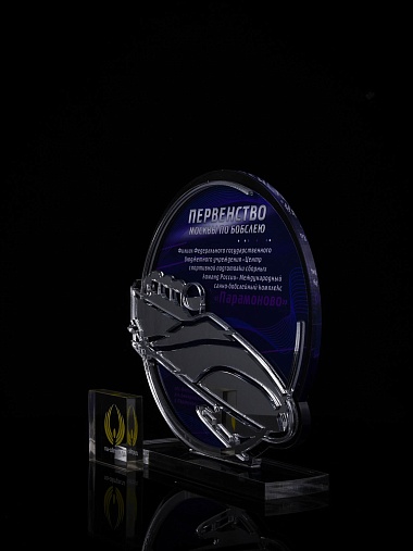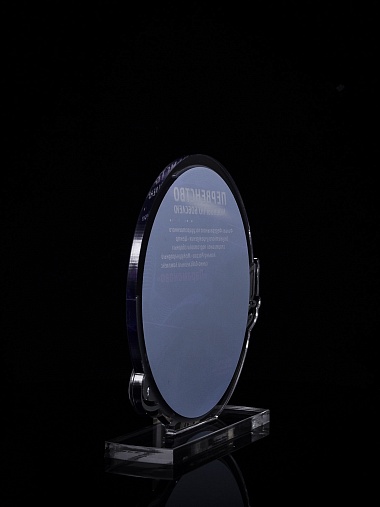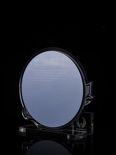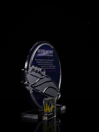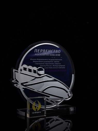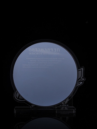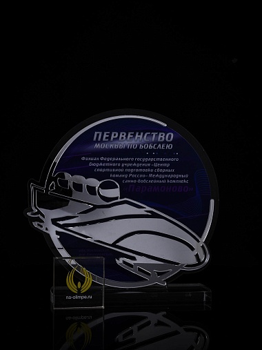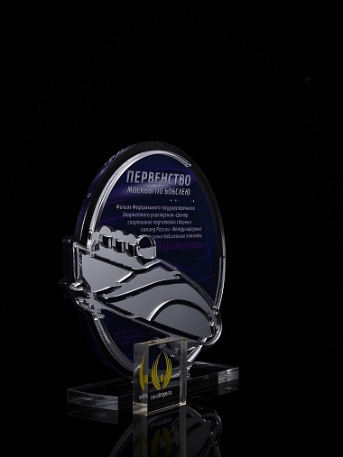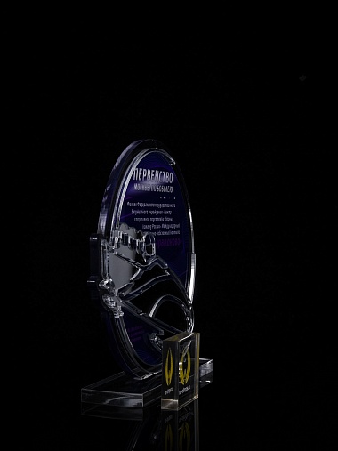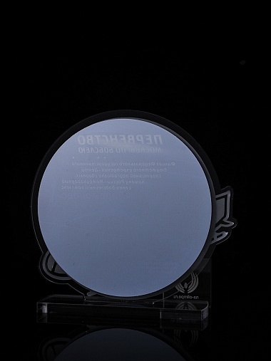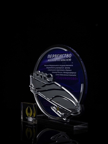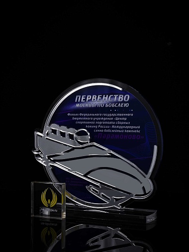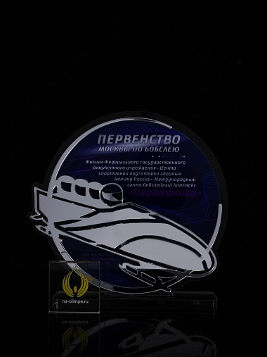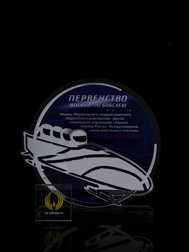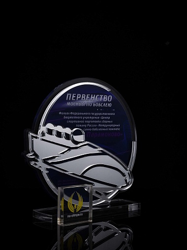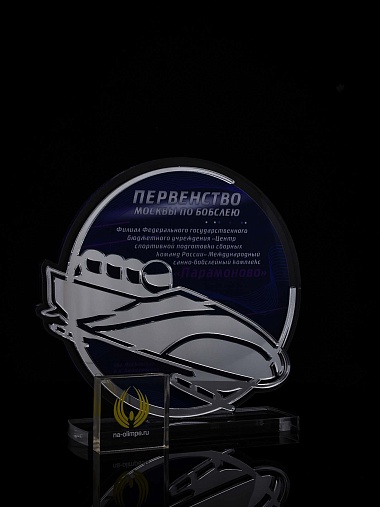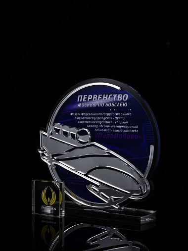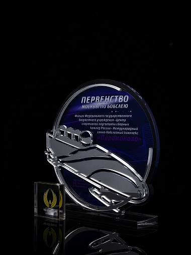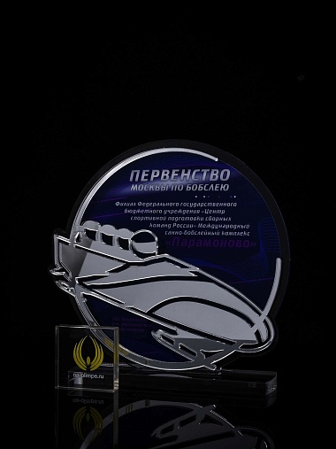 Приз из прозрачного и серебряного акрила с цветной печатью.
