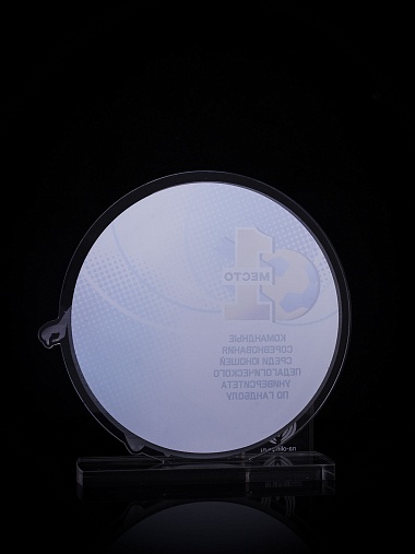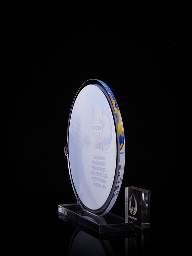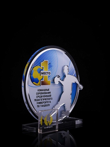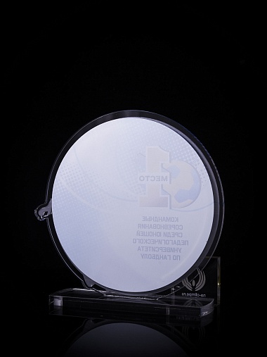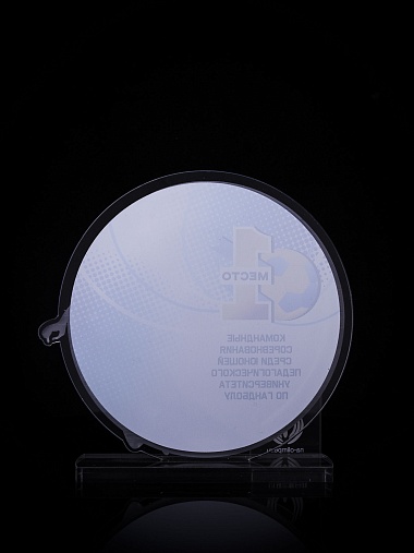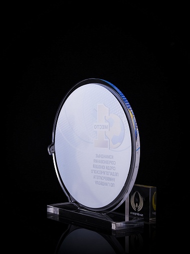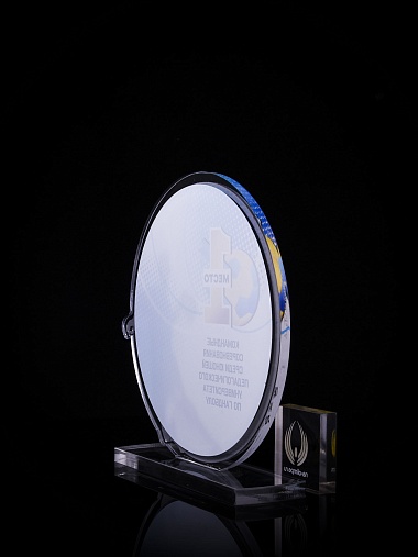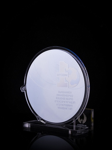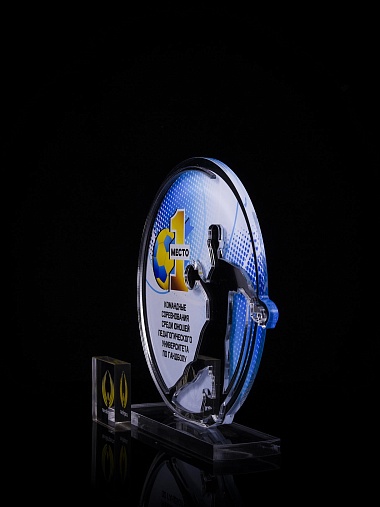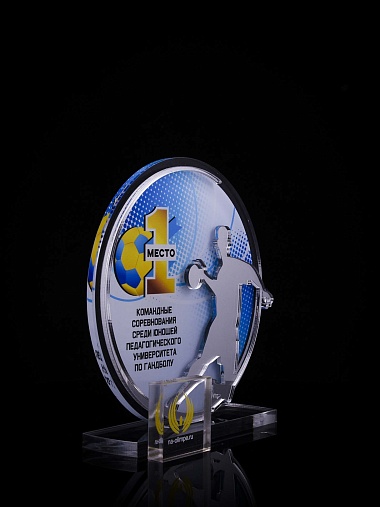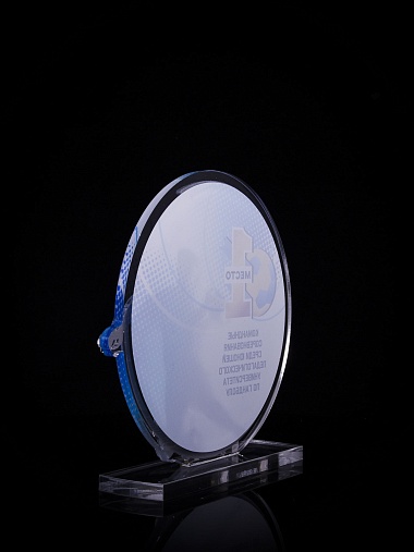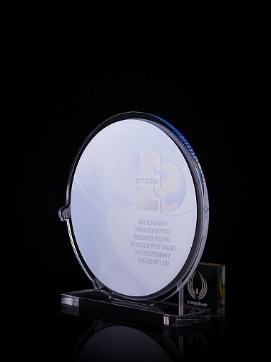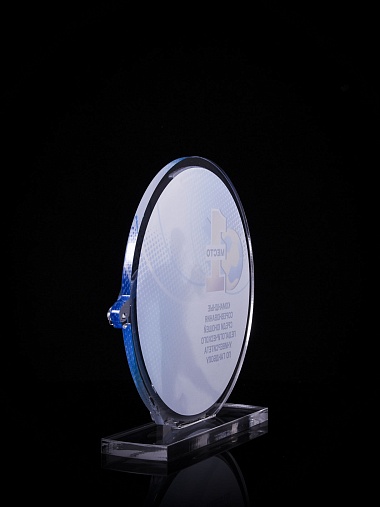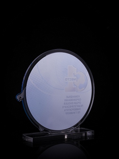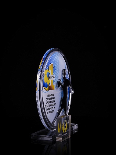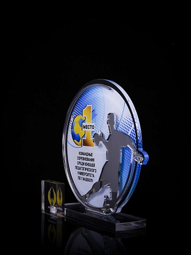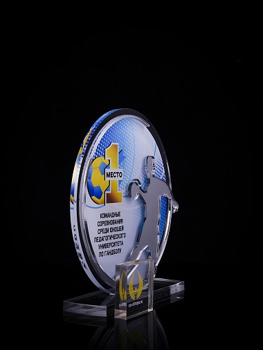 Приз из золотого и прозрачного акрила с цветным нанесением.