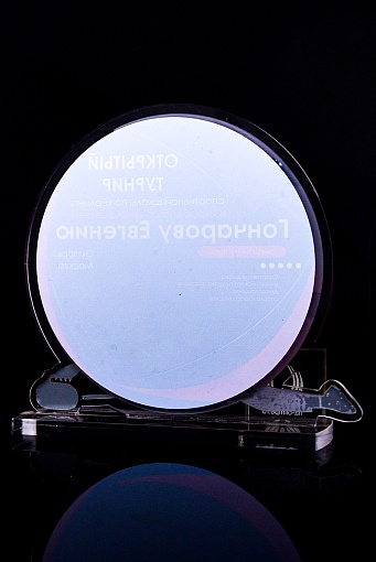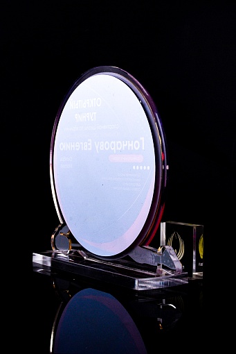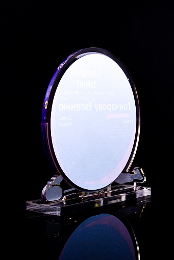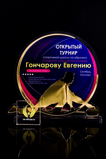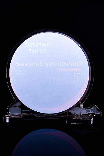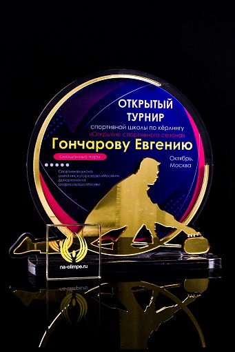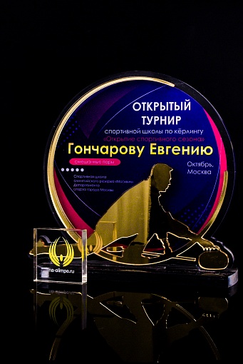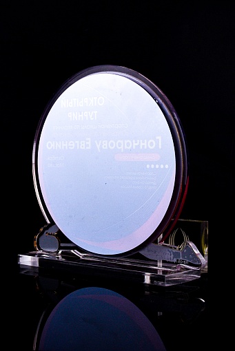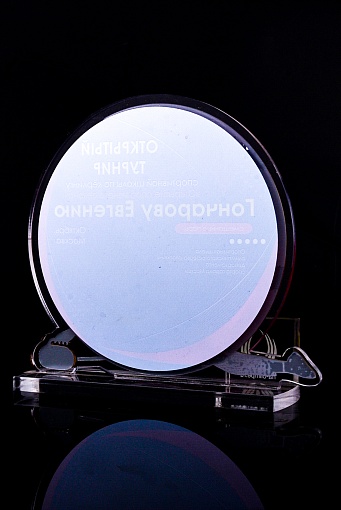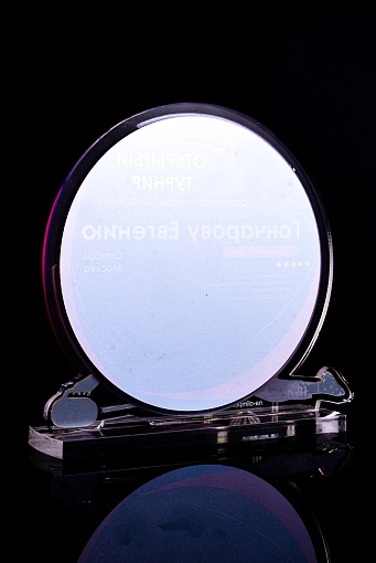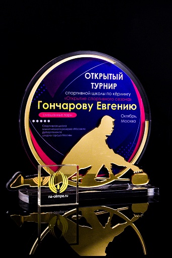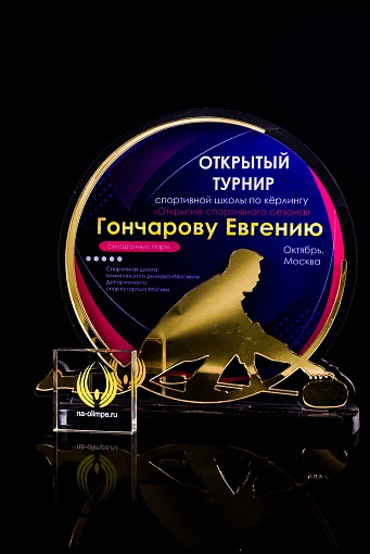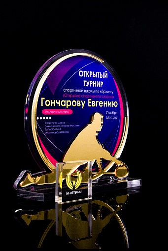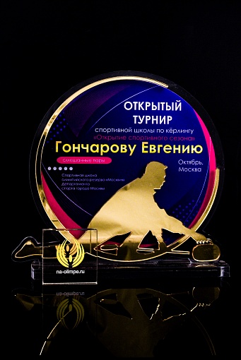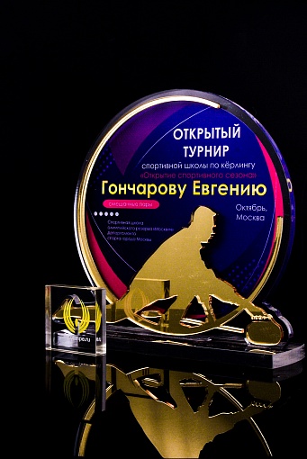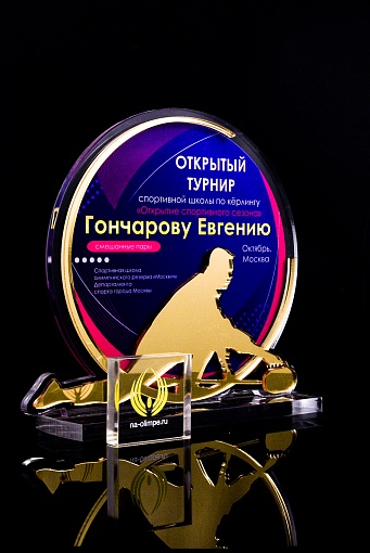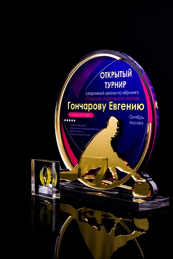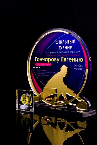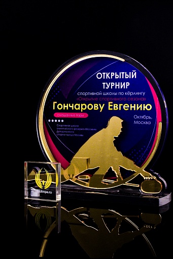 Приз из золотого и прозрачного акрила с цветным нанесением.
