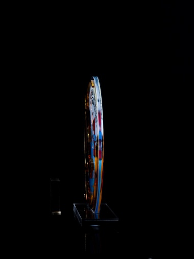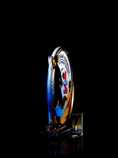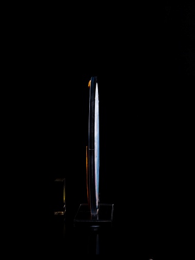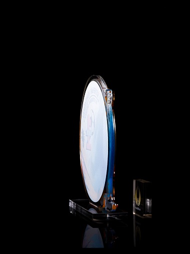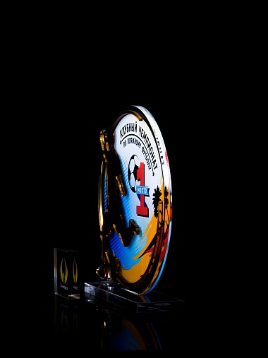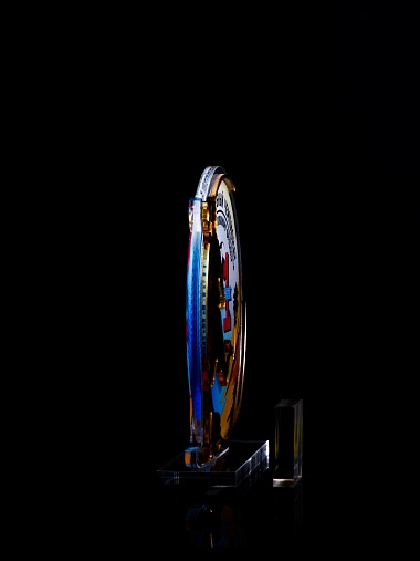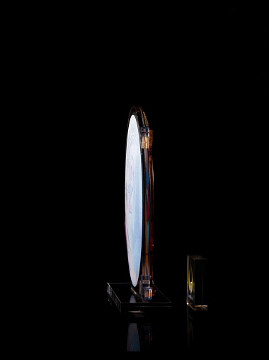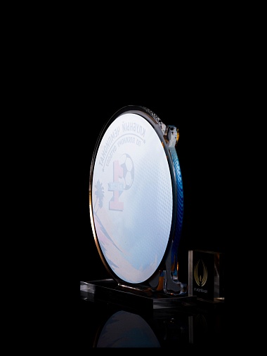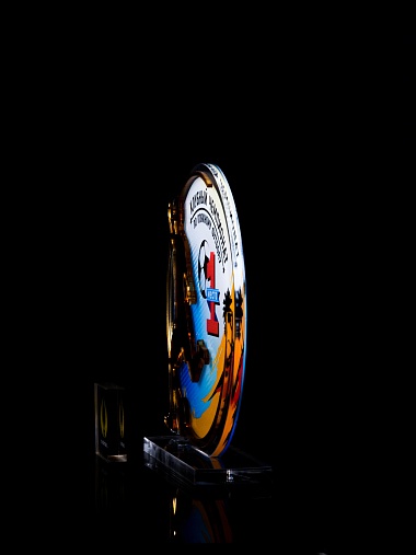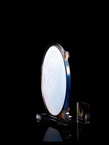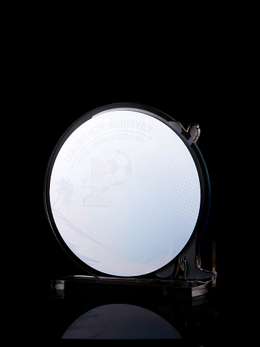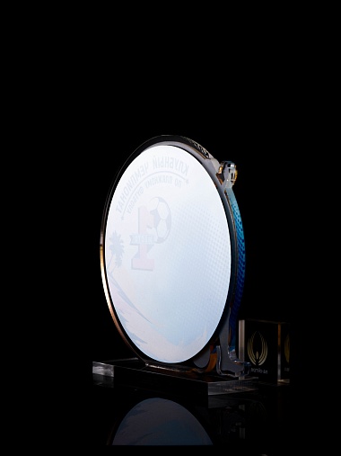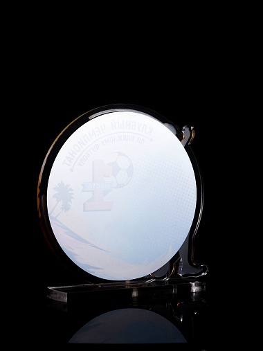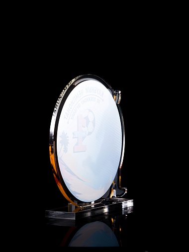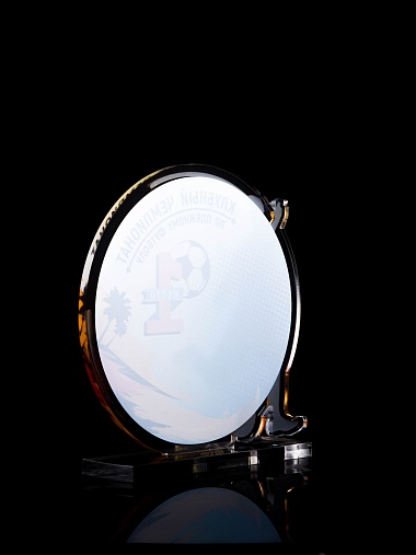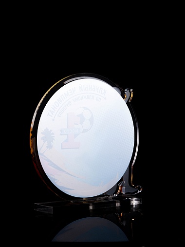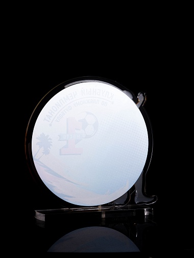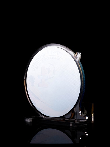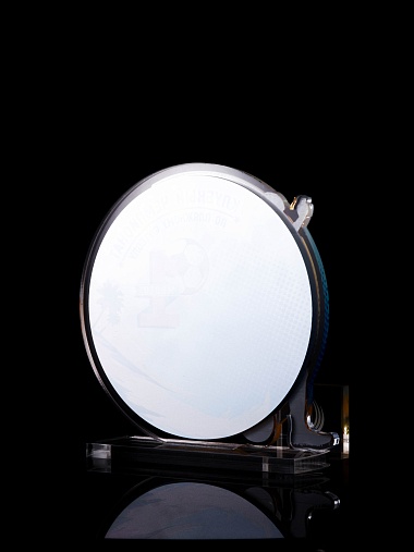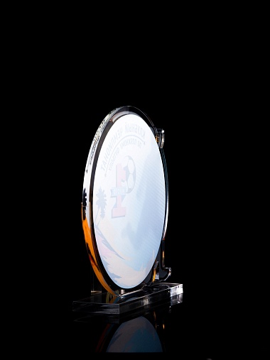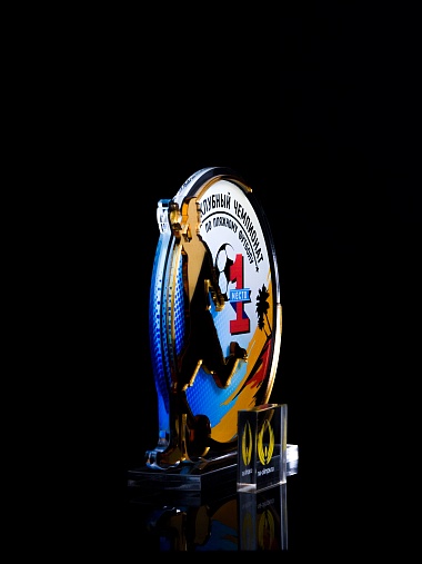 Приз из прозрачного и золотого акрила с цветной печатью.