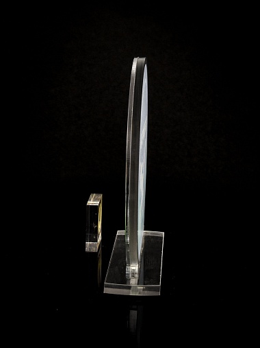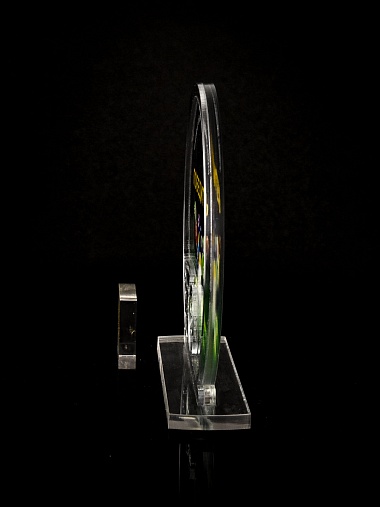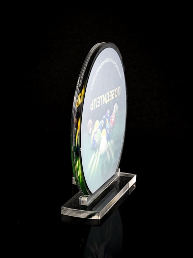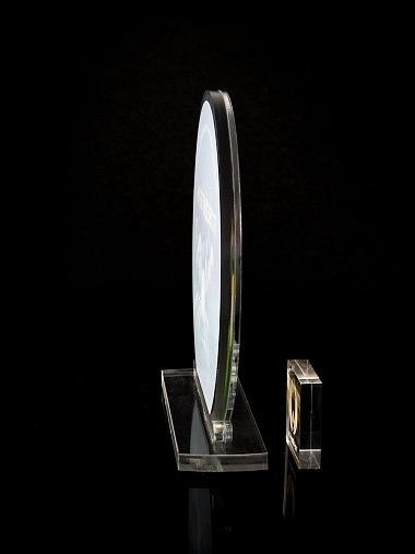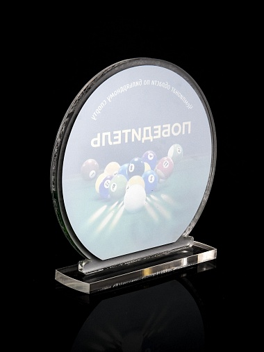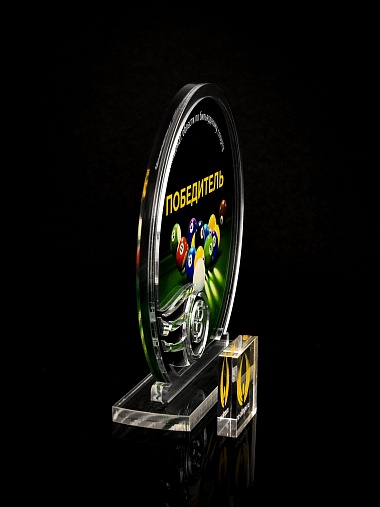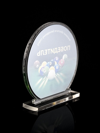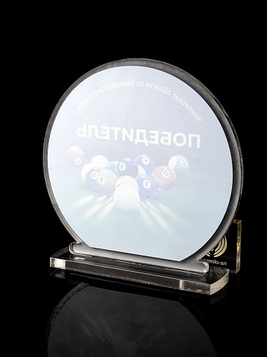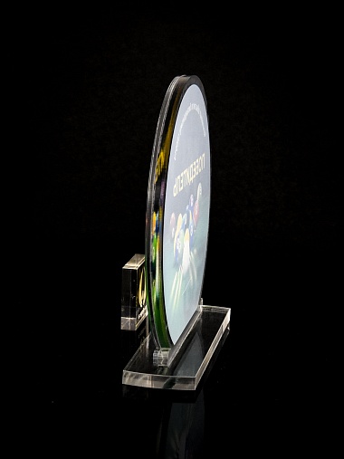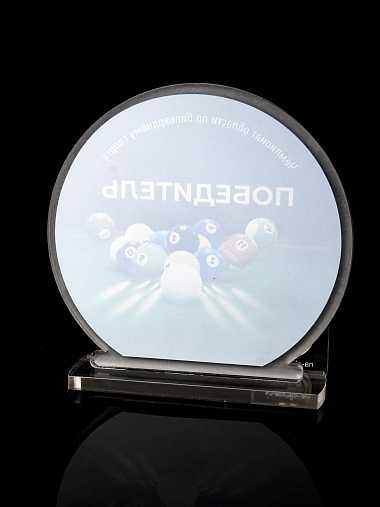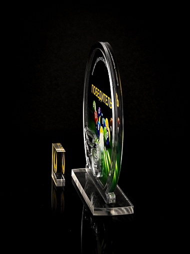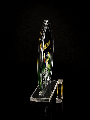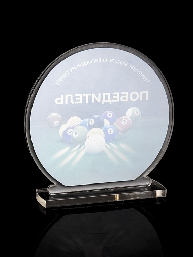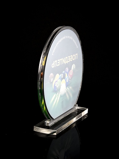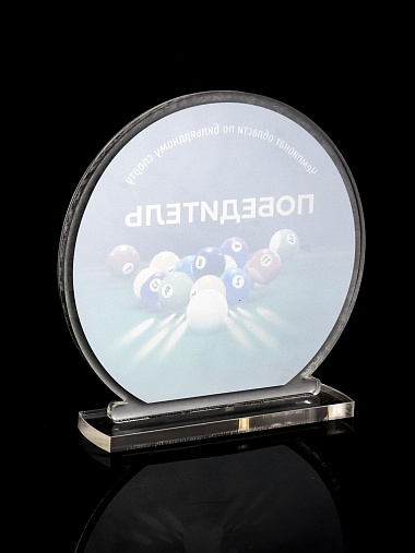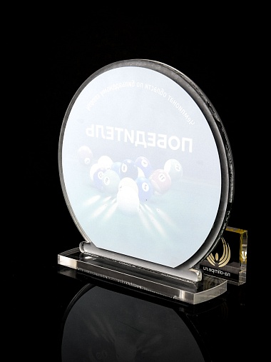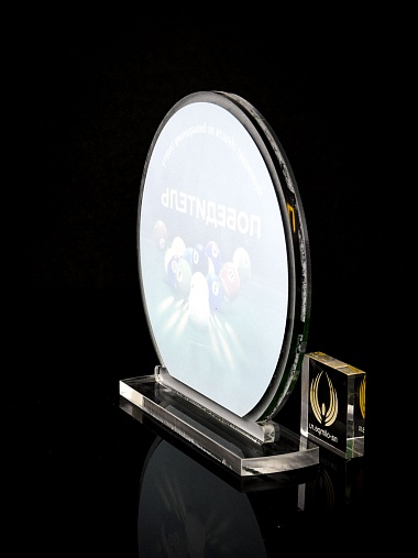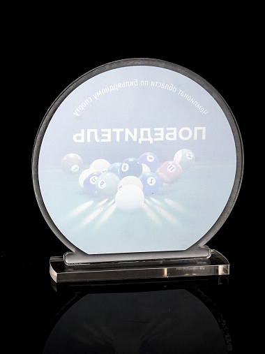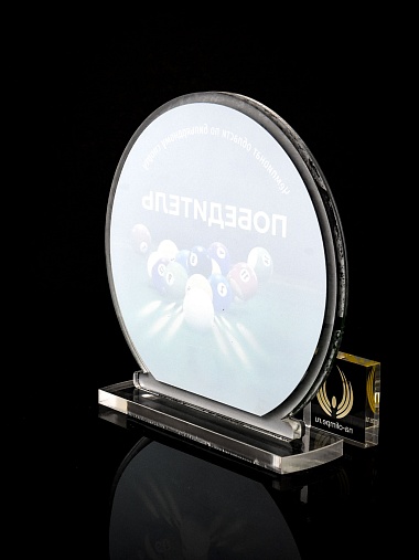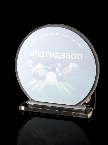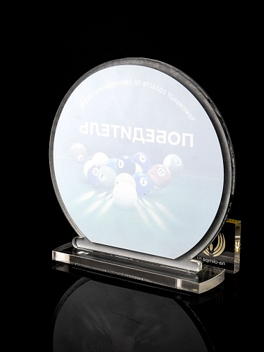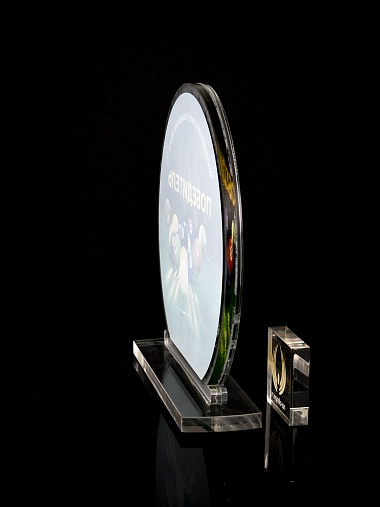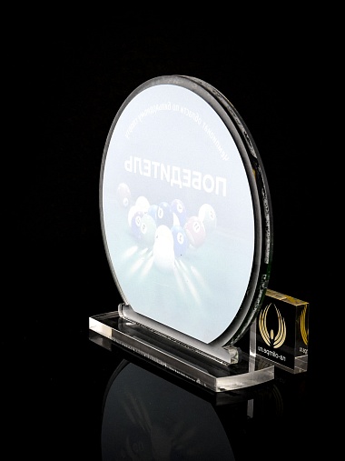 Приз из прозрачного и серебряного акрила с цветной печатью.