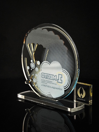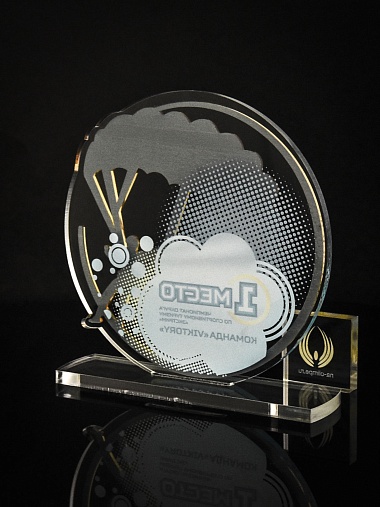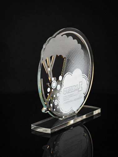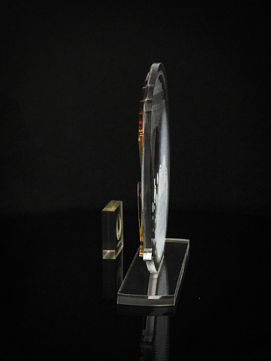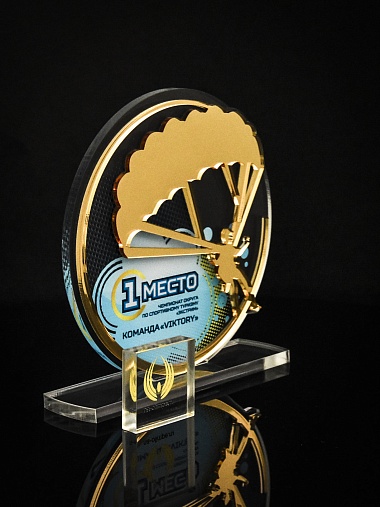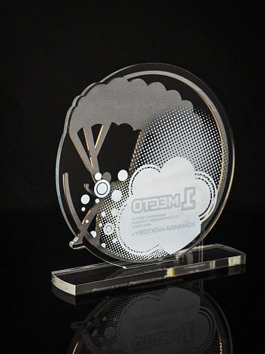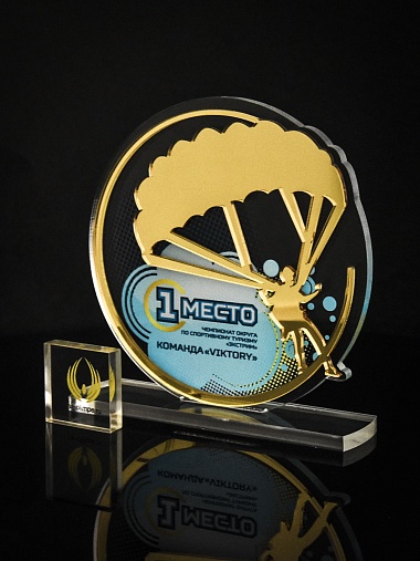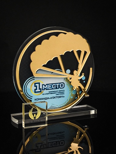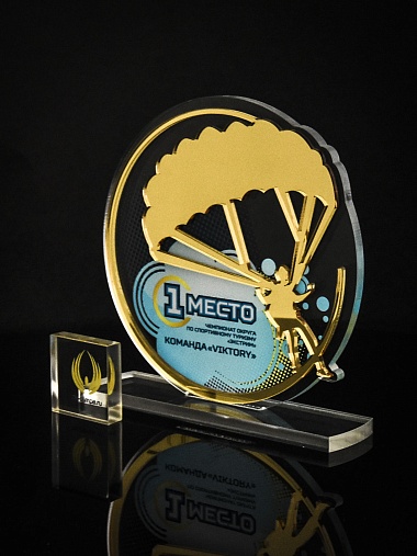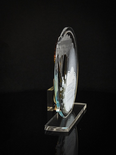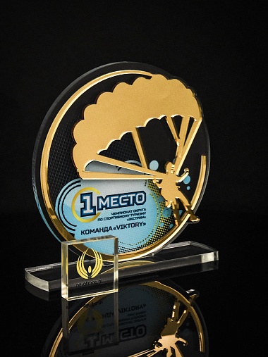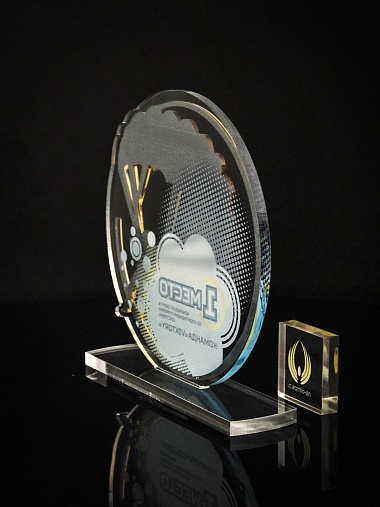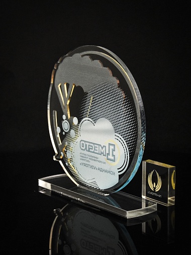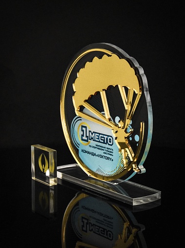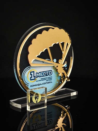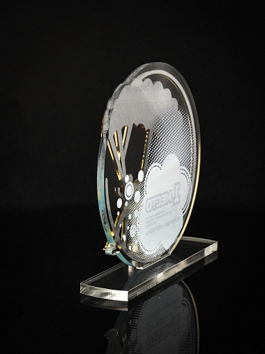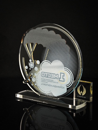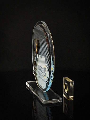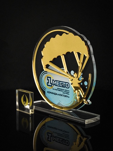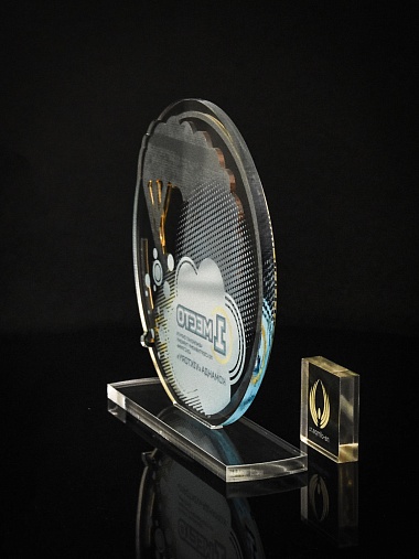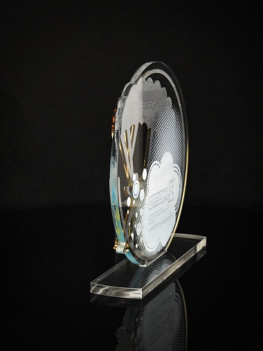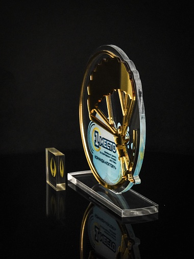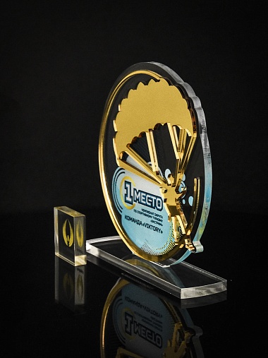 Приз из прозрачного и золотого акрила с цветной печатью.