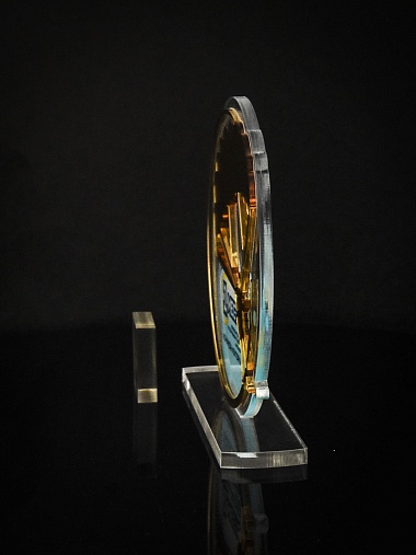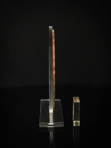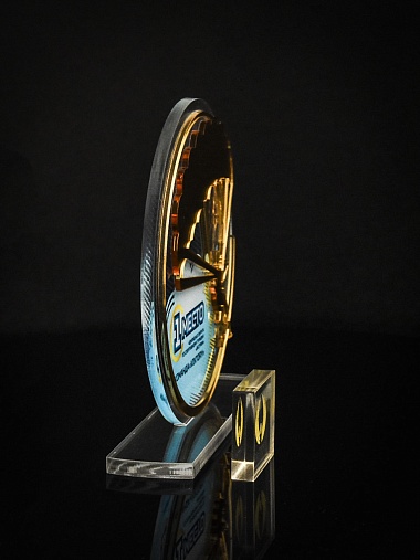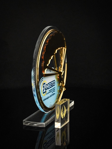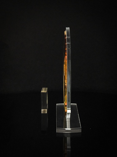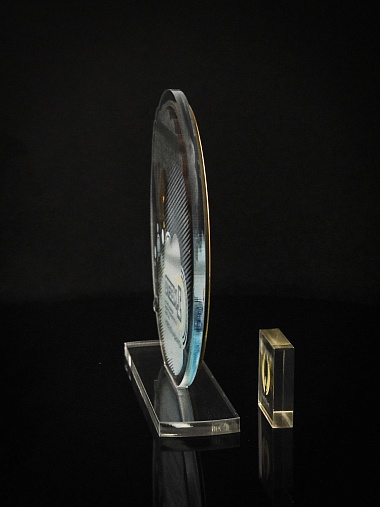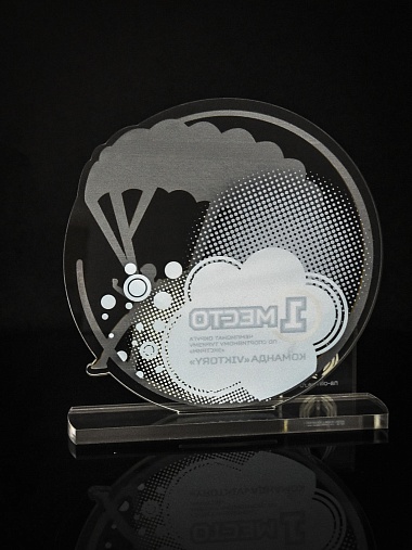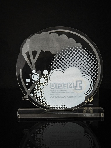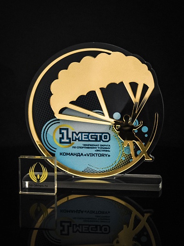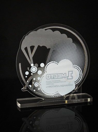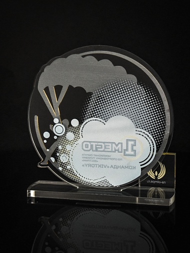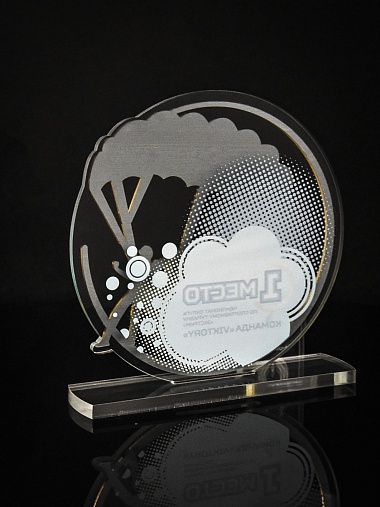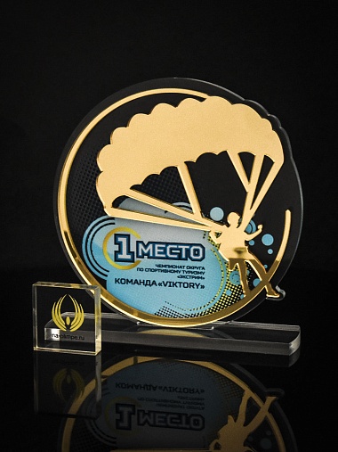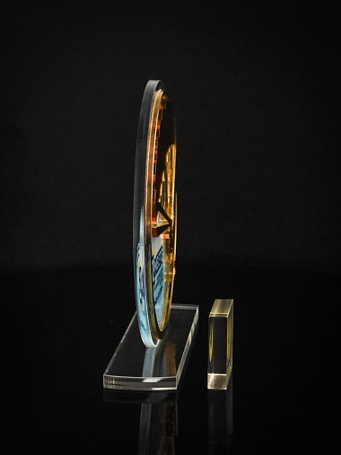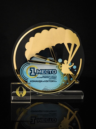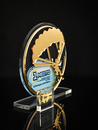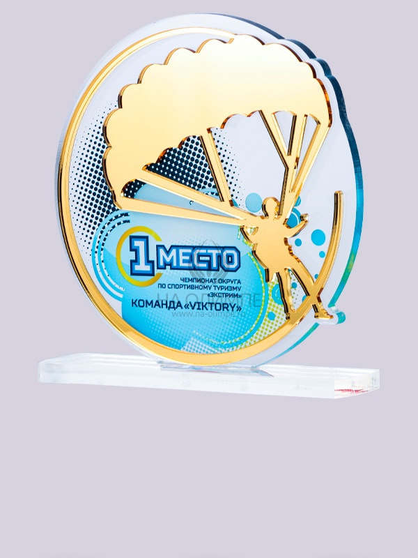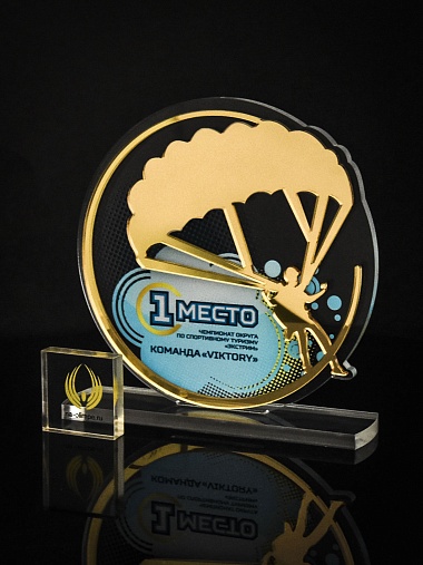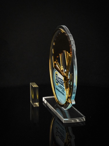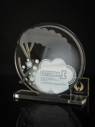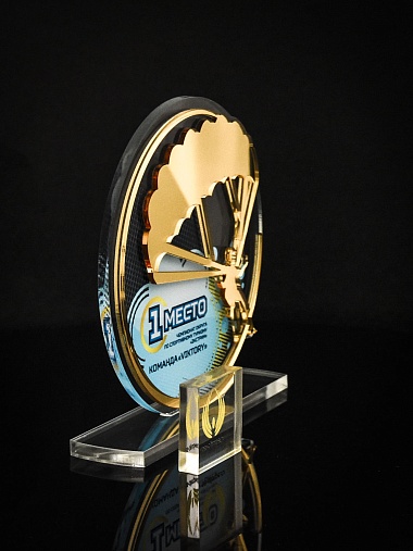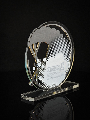 Приз из прозрачного и золотого акрила с цветной печатью.