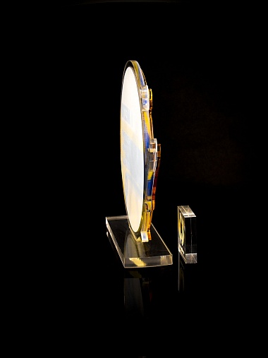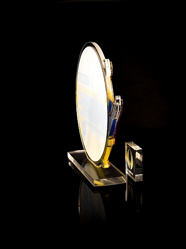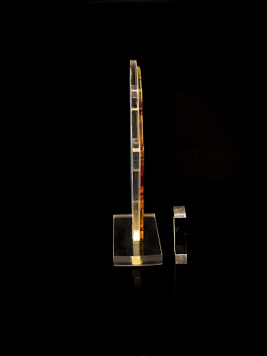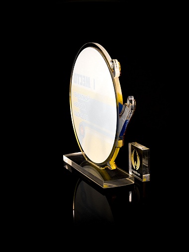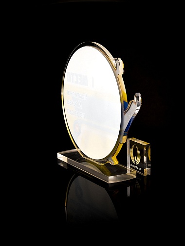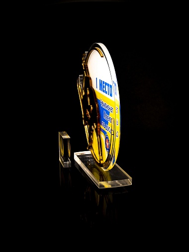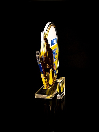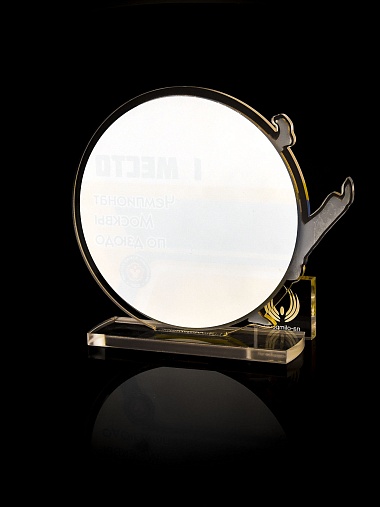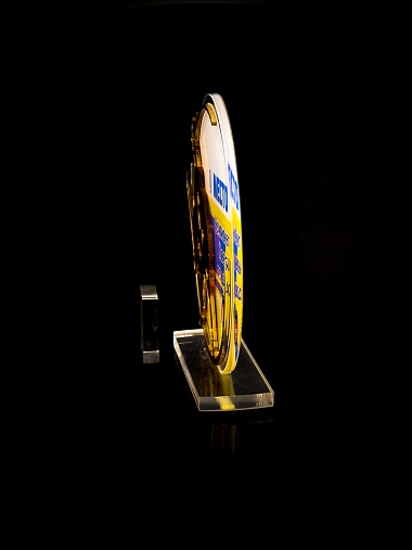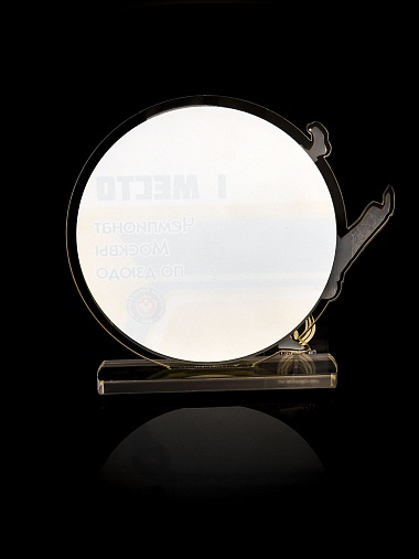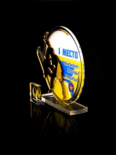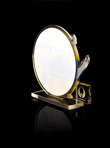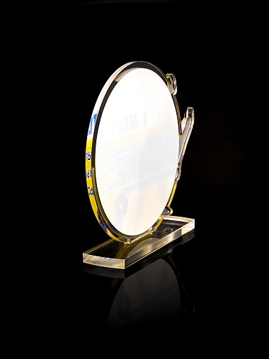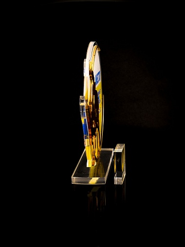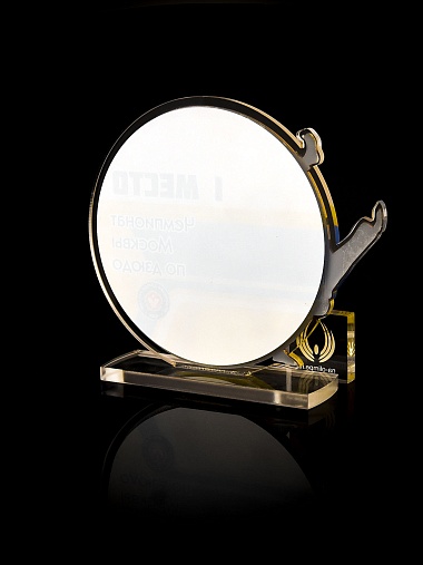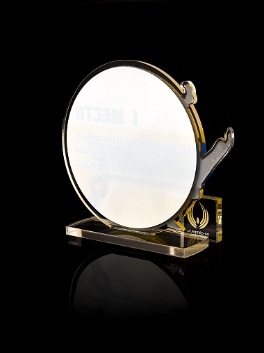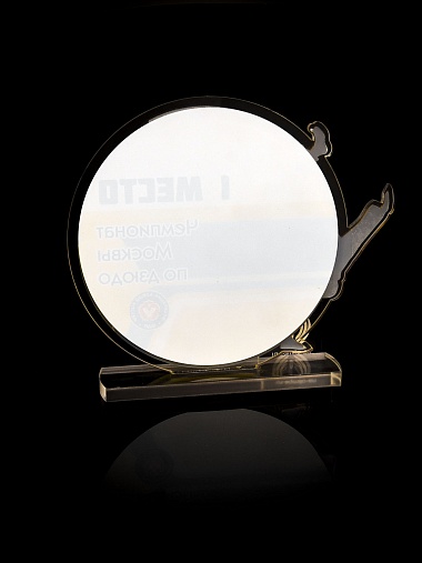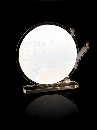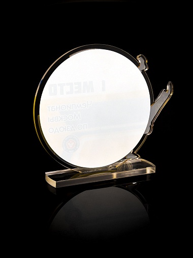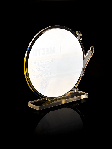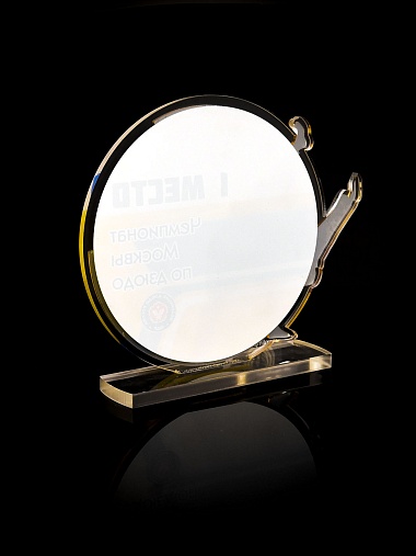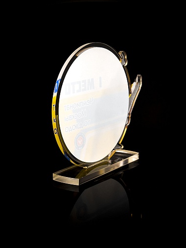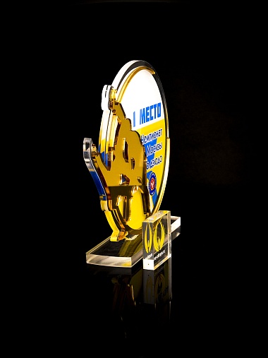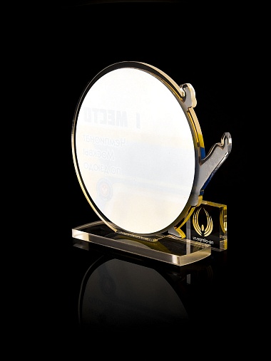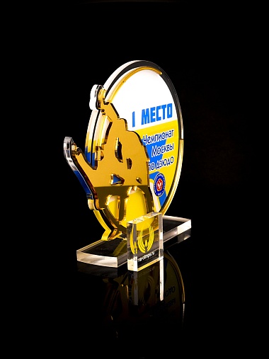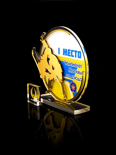 Приз из прозрачного и золотого акрила с цветной печатью.