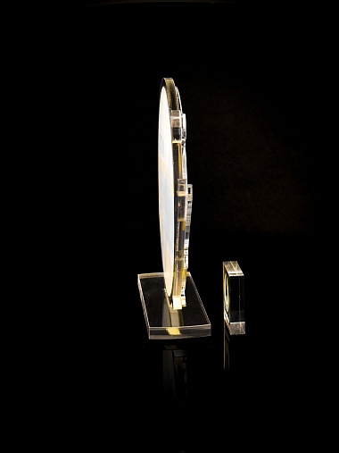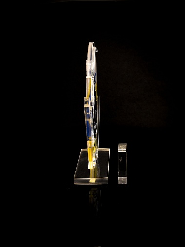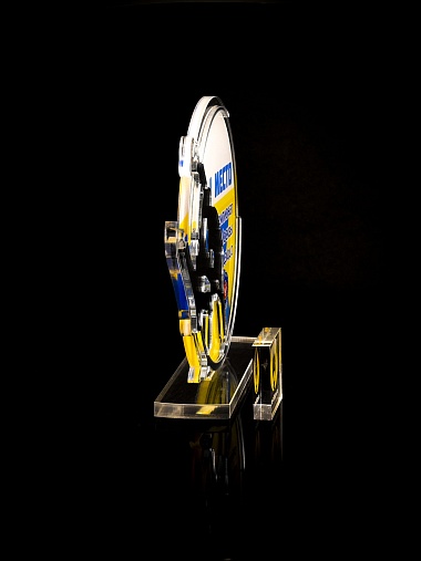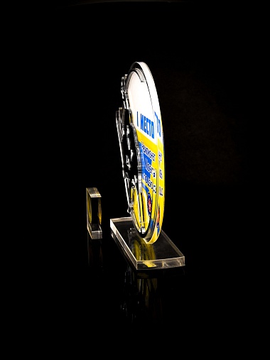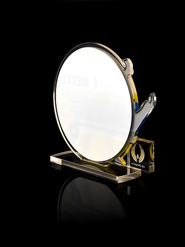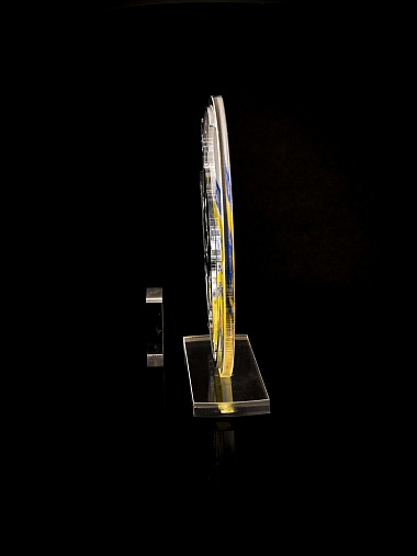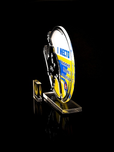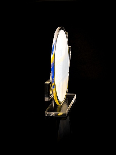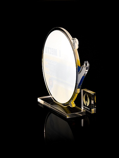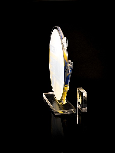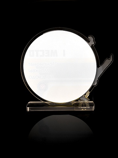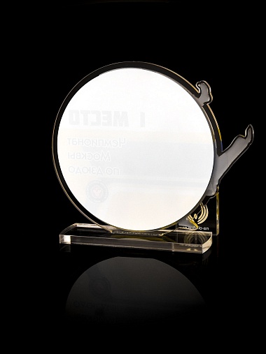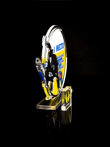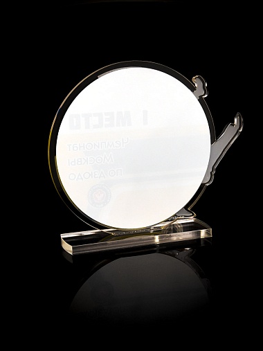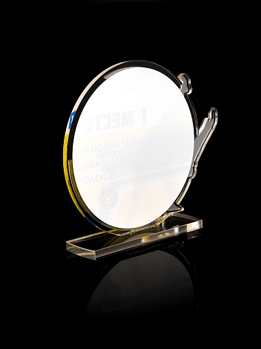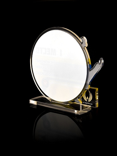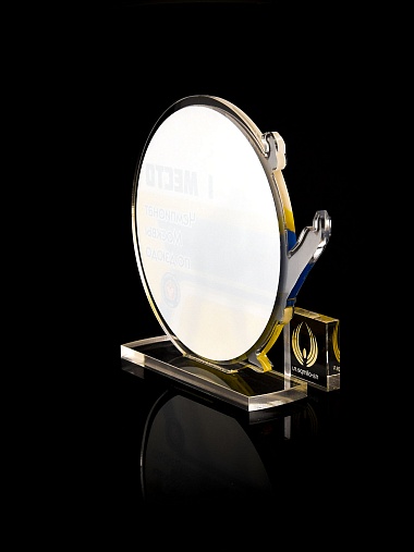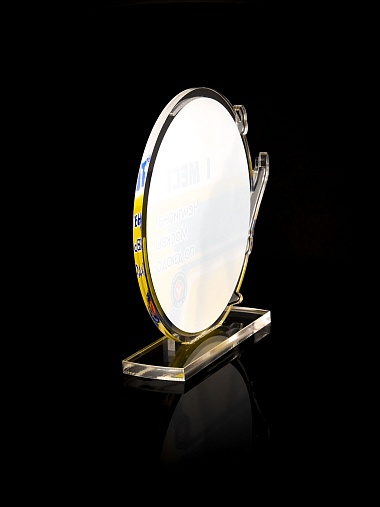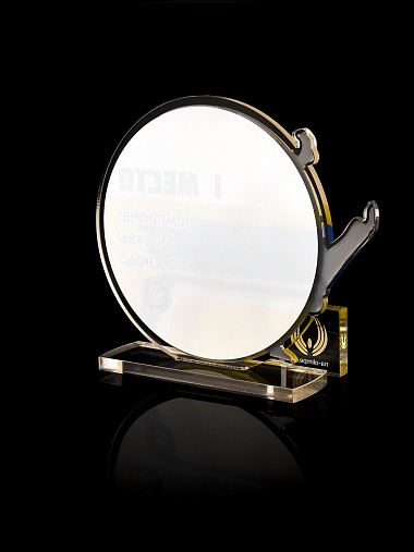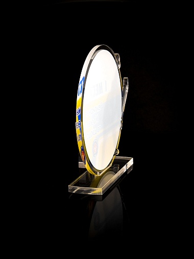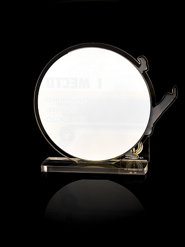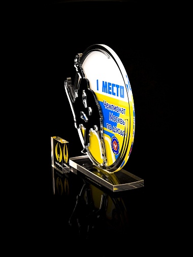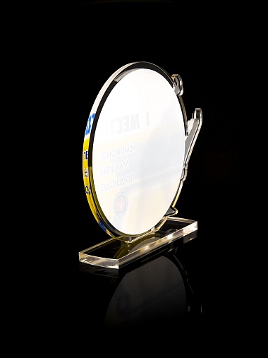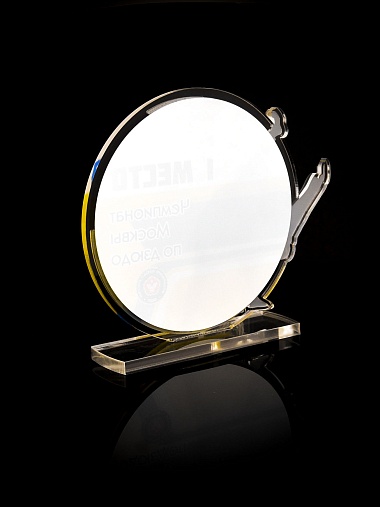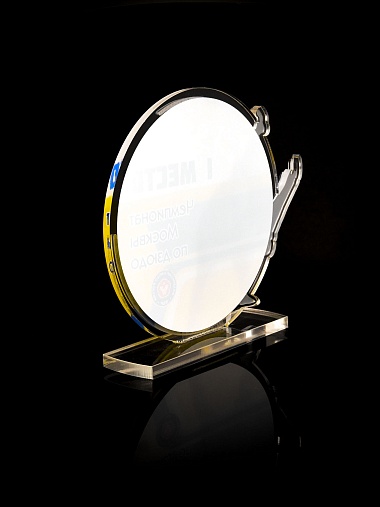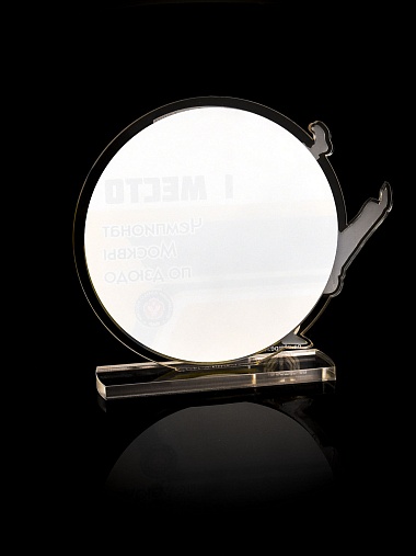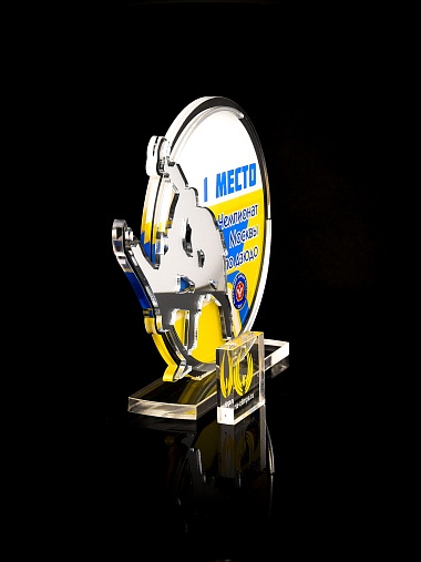 Приз из прозрачного и серебряного акрила с цветной печатью.