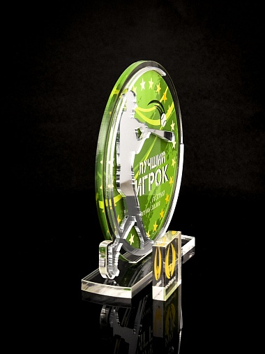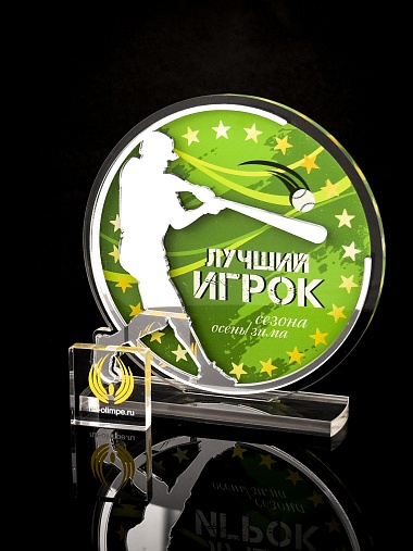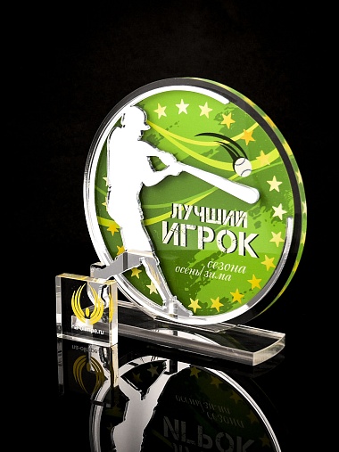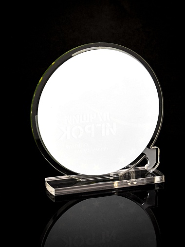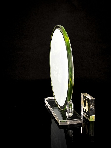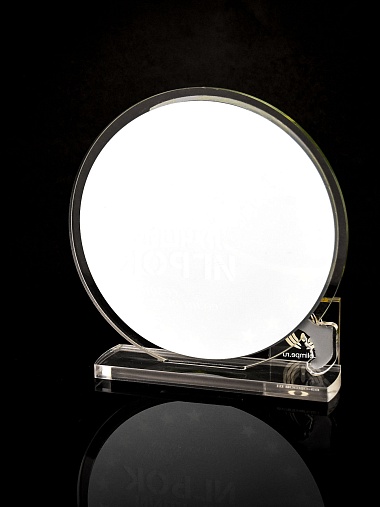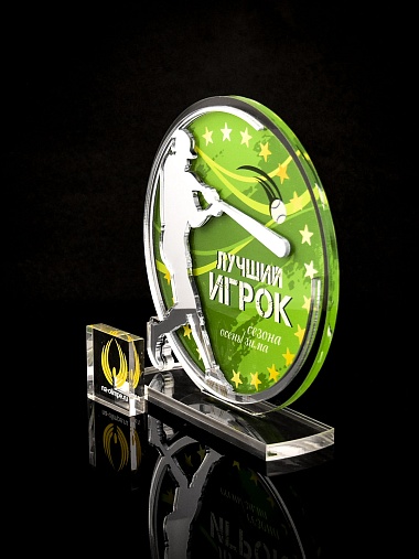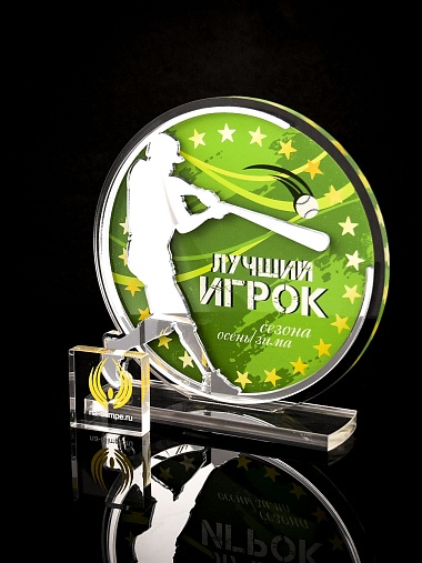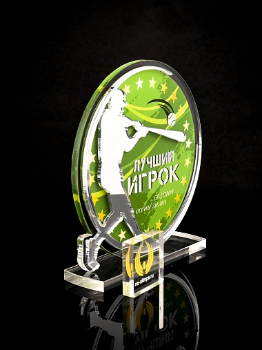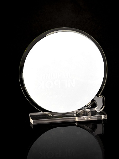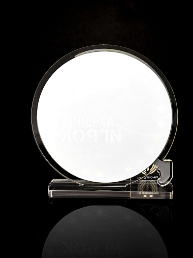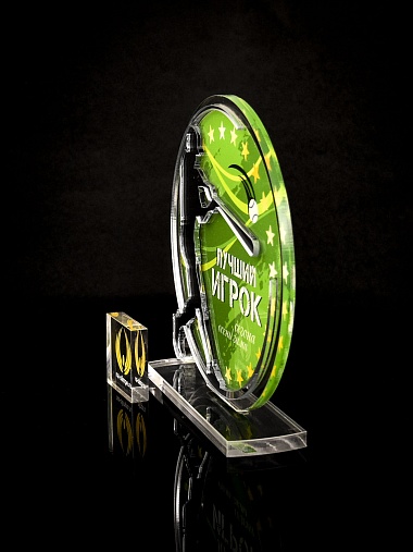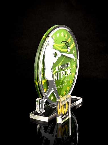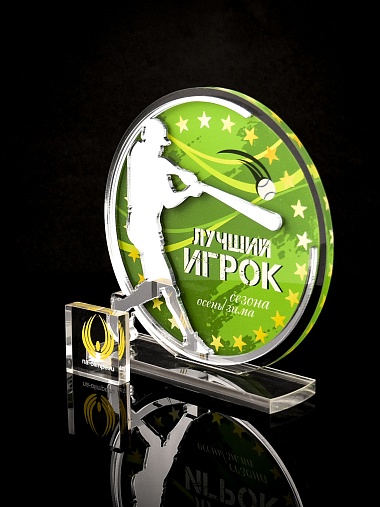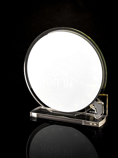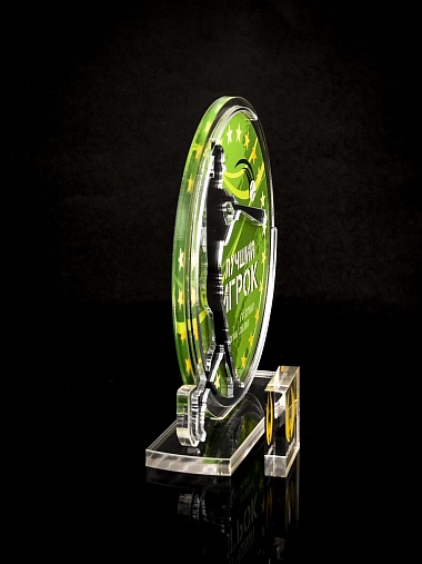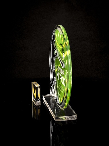 Приз из прозрачного и серебряного акрила с цветной печатью.