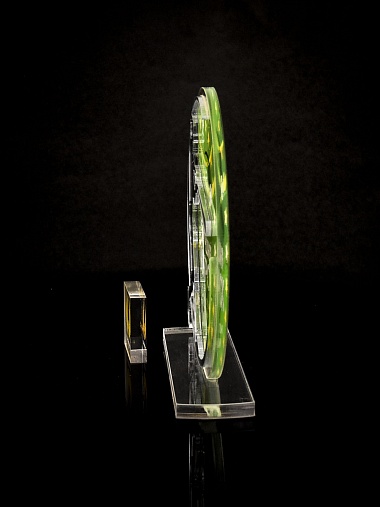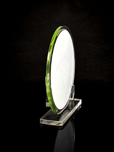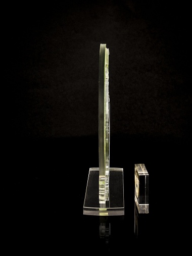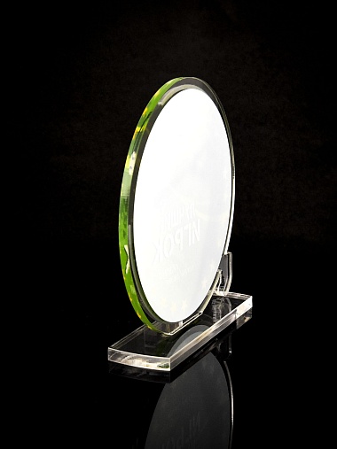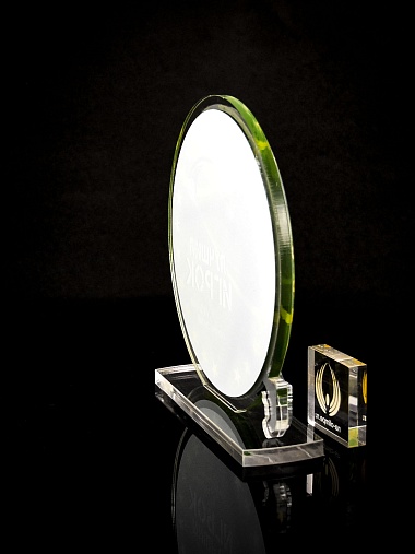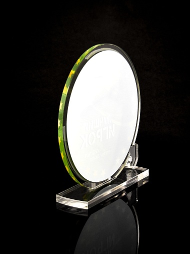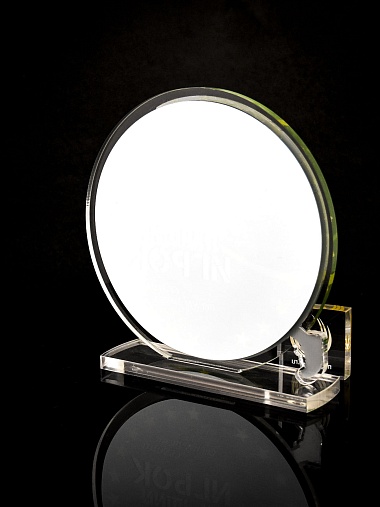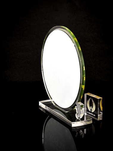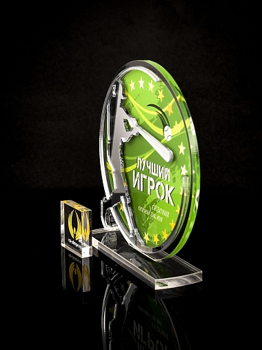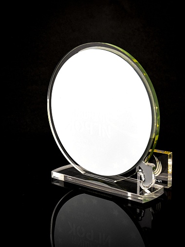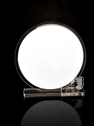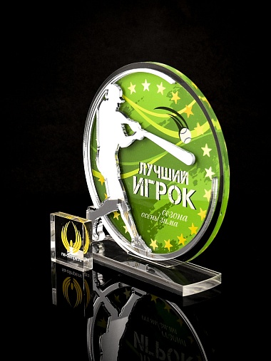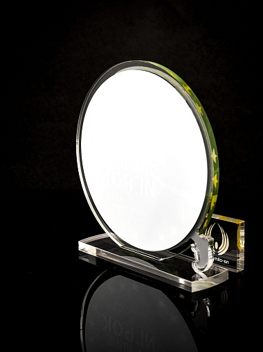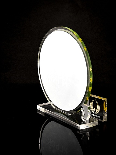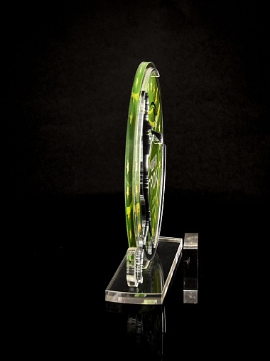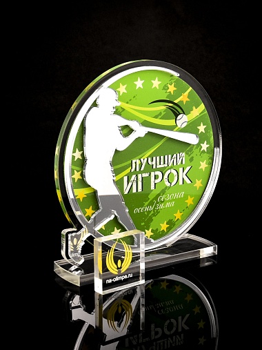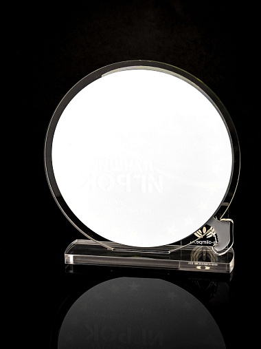 Приз из прозрачного и серебряного акрила с цветной печатью.