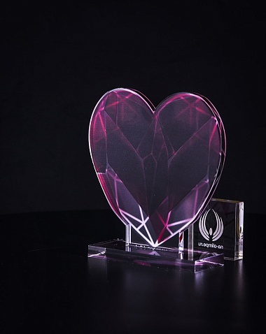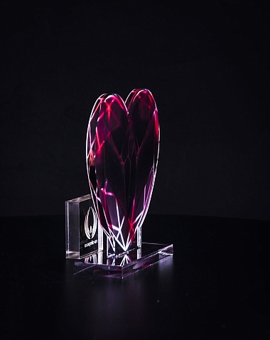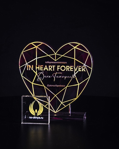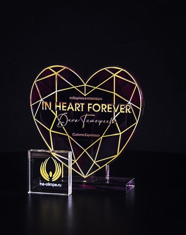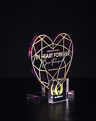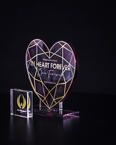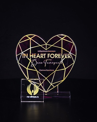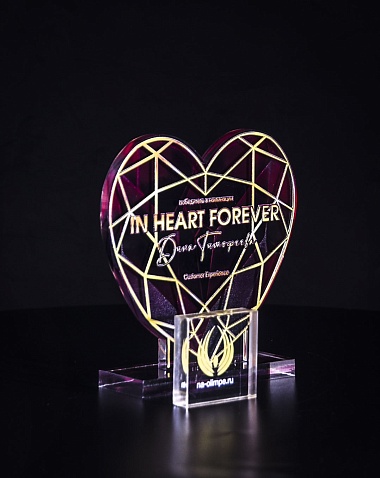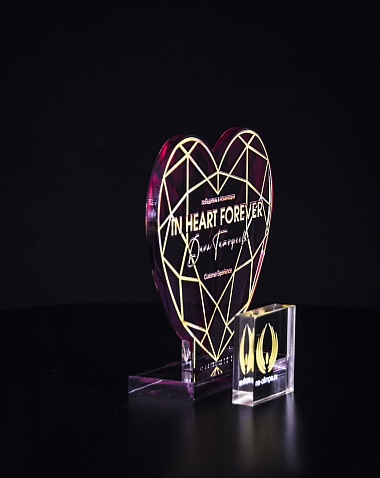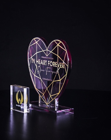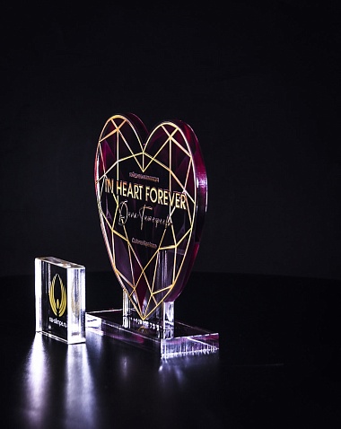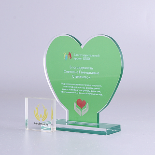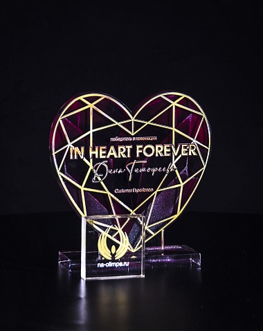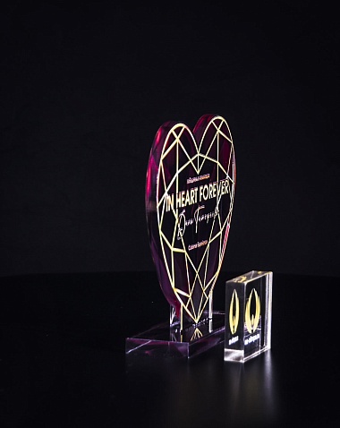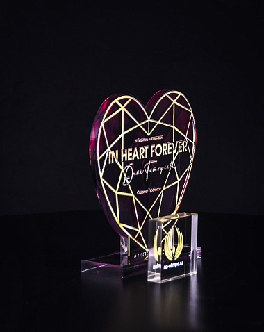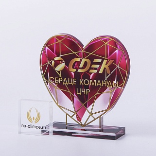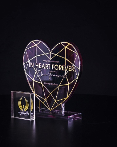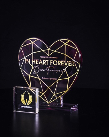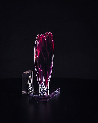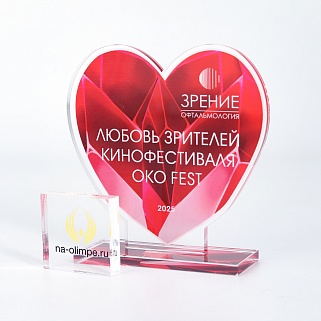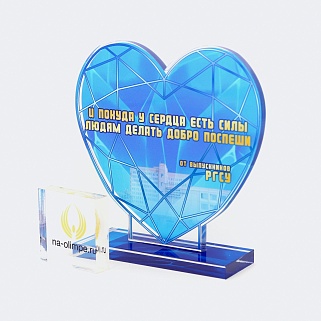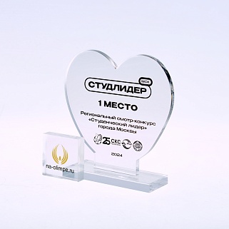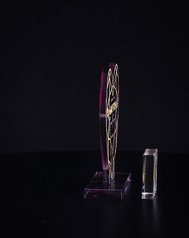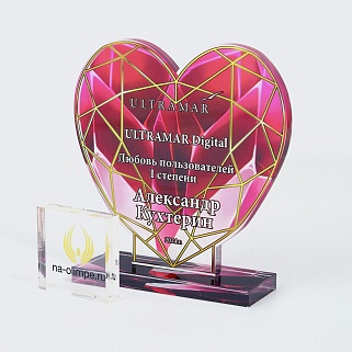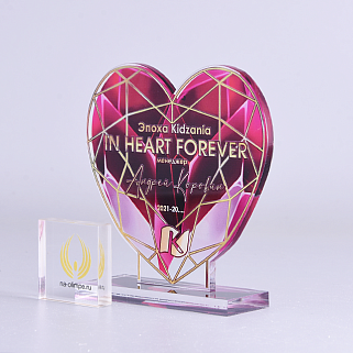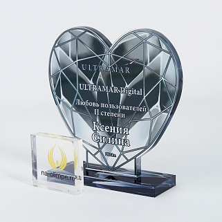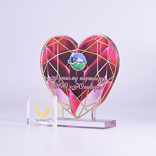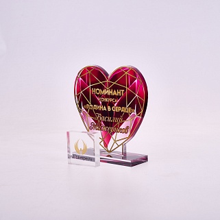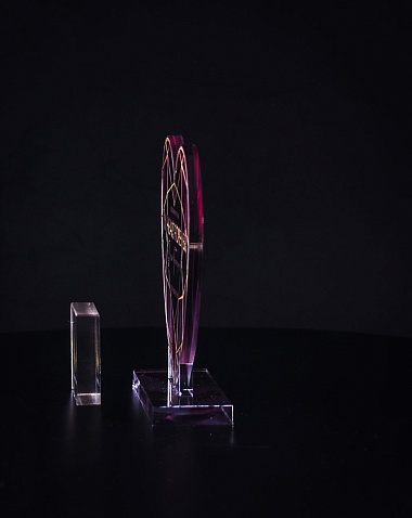 Приз из прозрачного акрила с глянцевой цветной печатью на лицевой стороне и полупрозрачной печатью на задней стенке награды и постаменте.