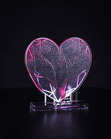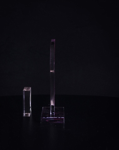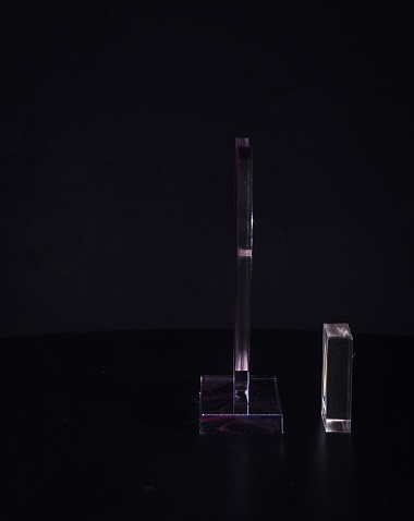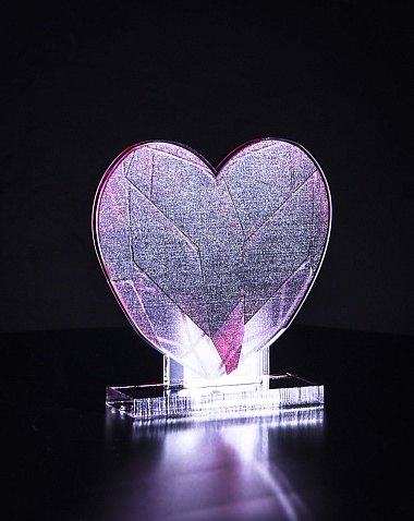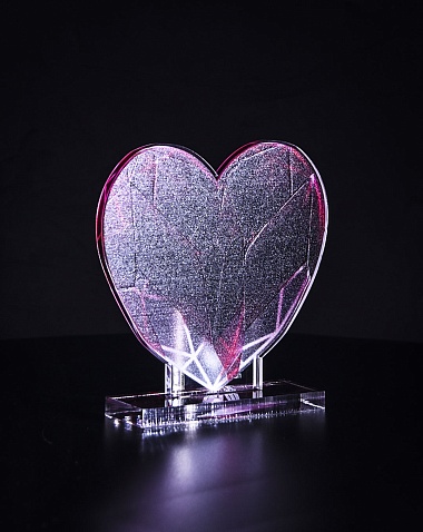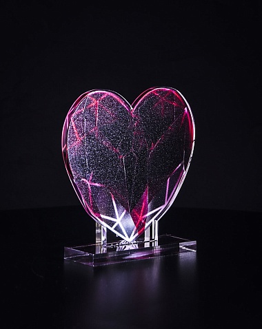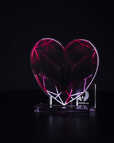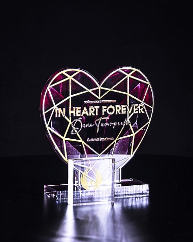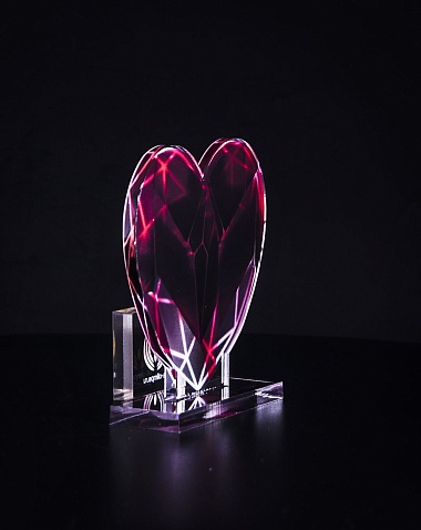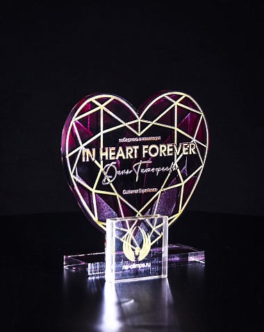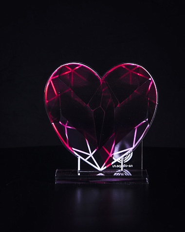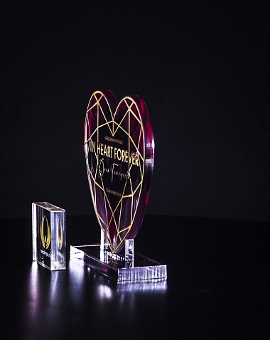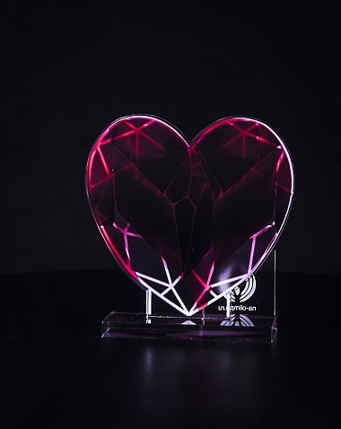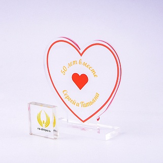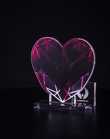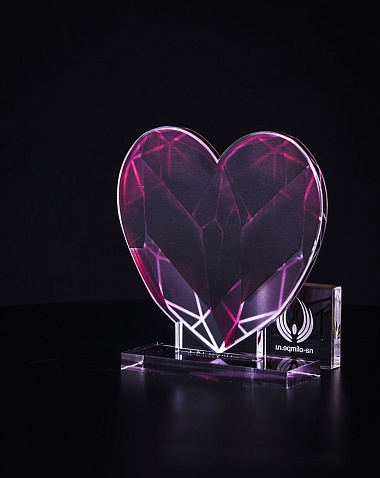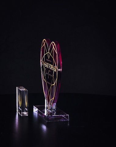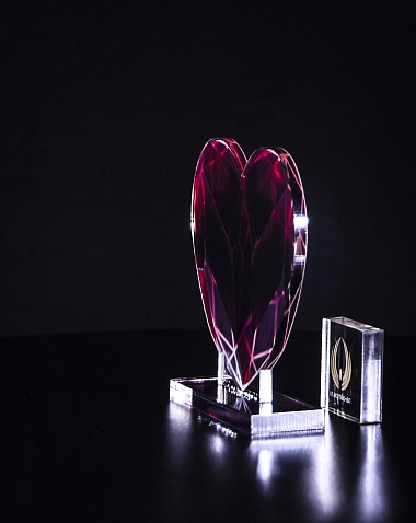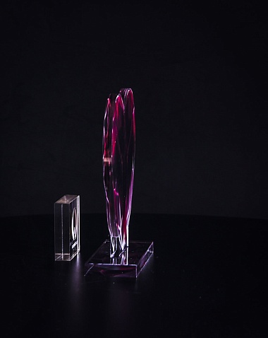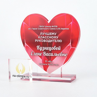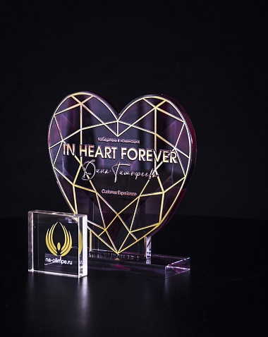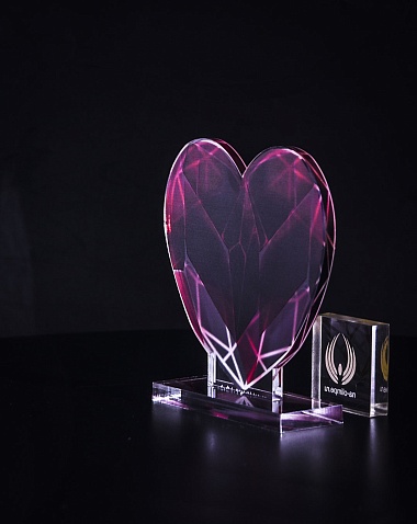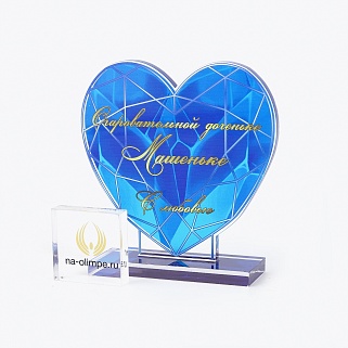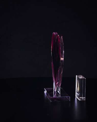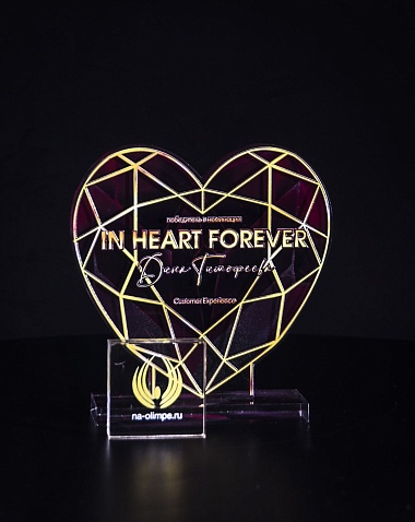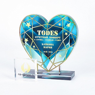 Приз из прозрачного акрила с глянцевой цветной печатью на лицевой стороне и полупрозрачной печатью на задней стенке награды и постаменте.