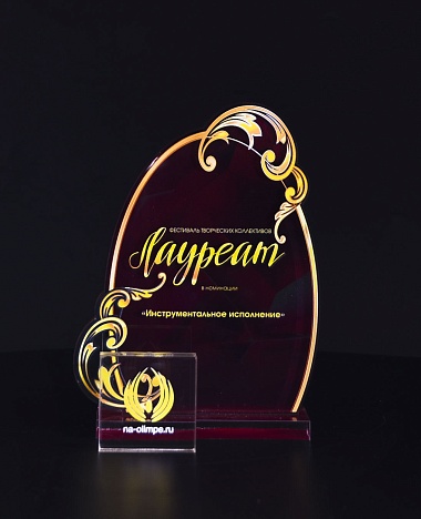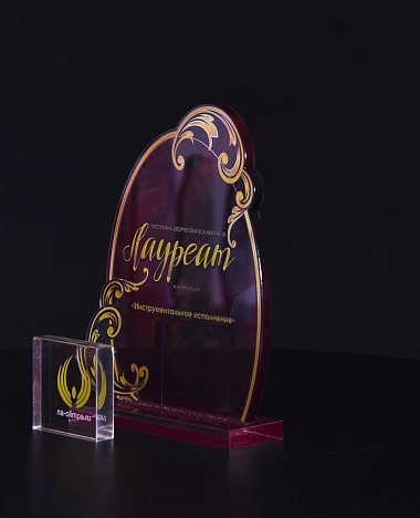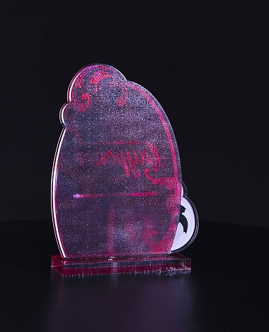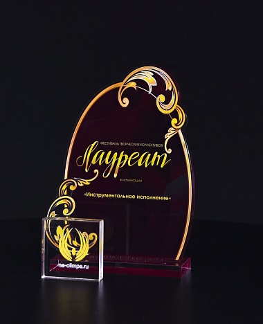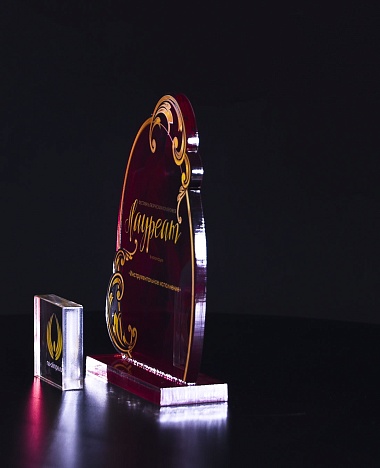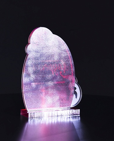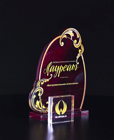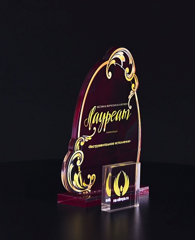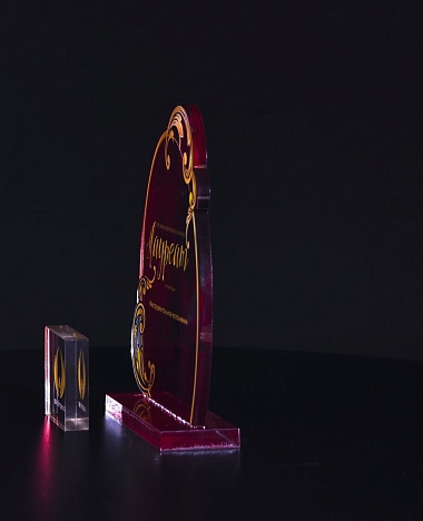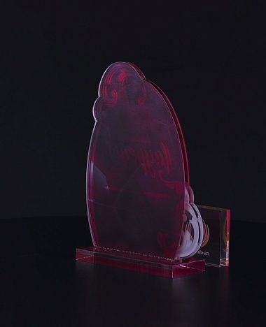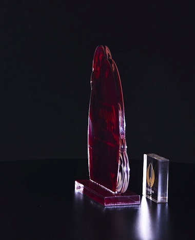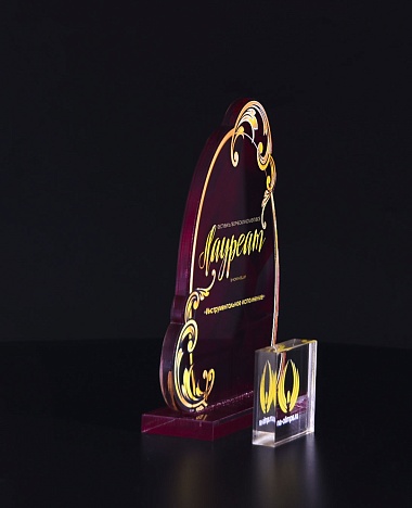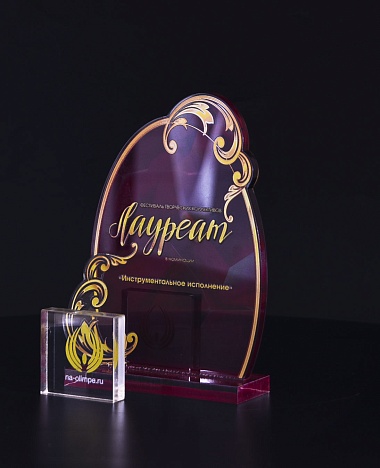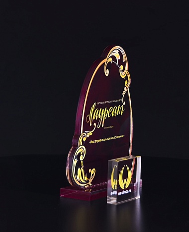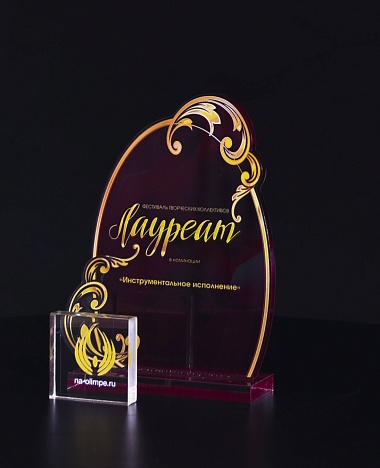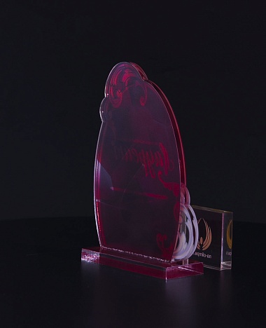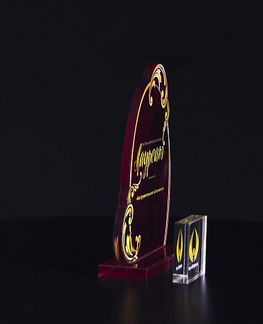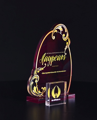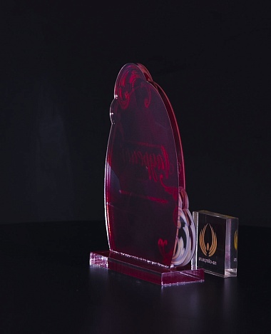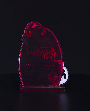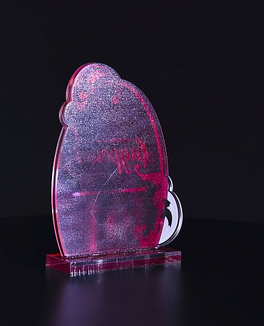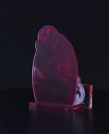 Приз из прозрачного акрила с глянцевой цветной печатью на лицевой стороне и полупрозрачной печатью на задней стенке награды и постаменте.