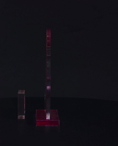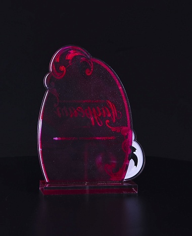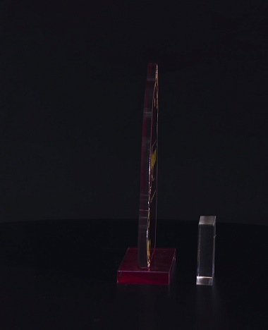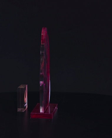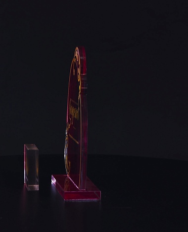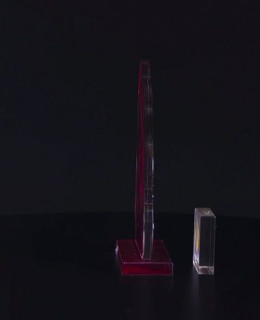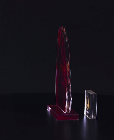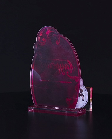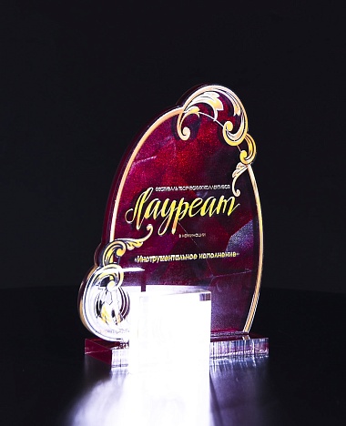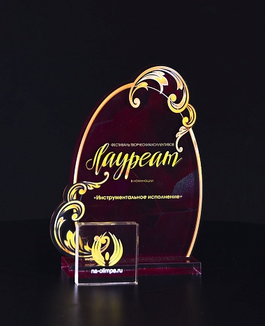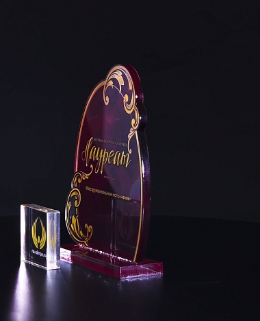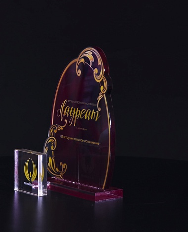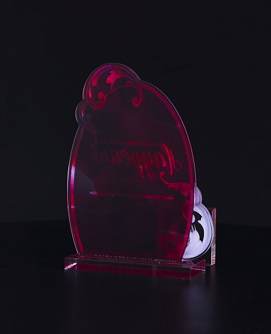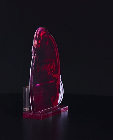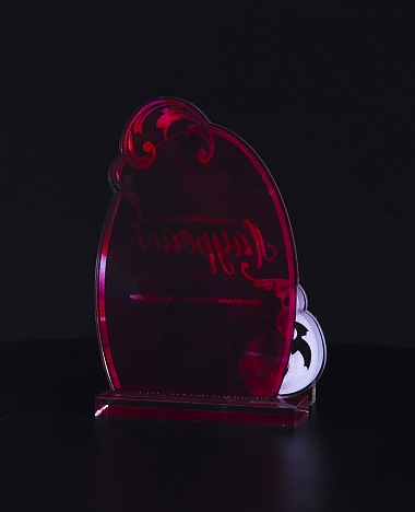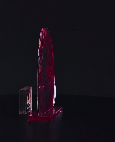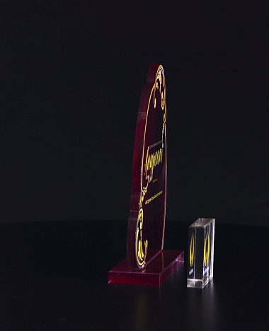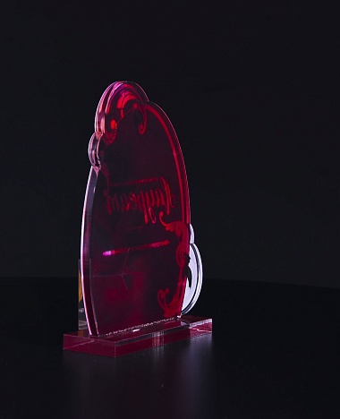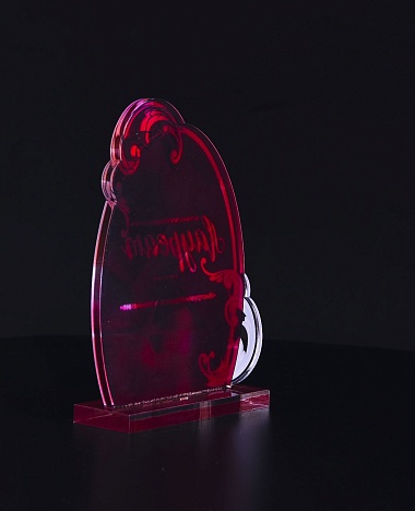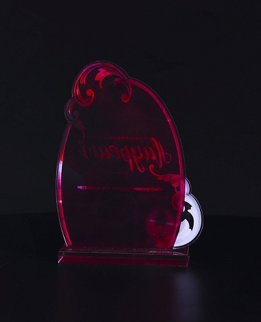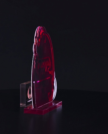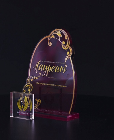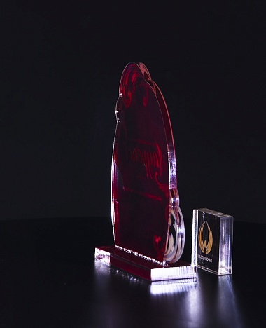 Приз из прозрачного акрила с глянцевой цветной печатью на лицевой стороне и полупрозрачной печатью на задней стенке награды и постаменте.