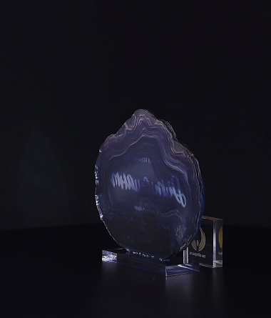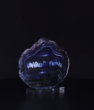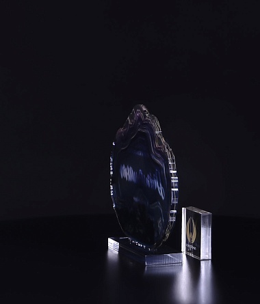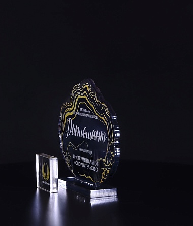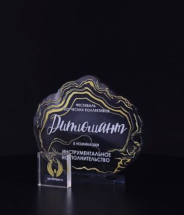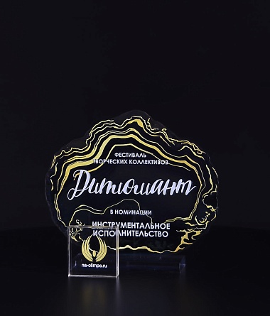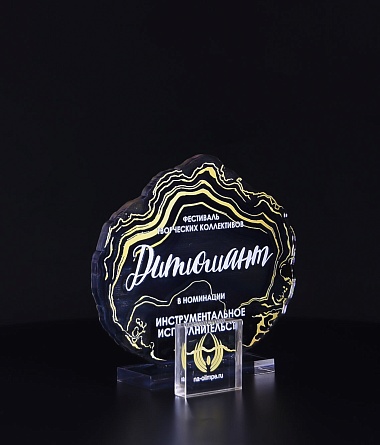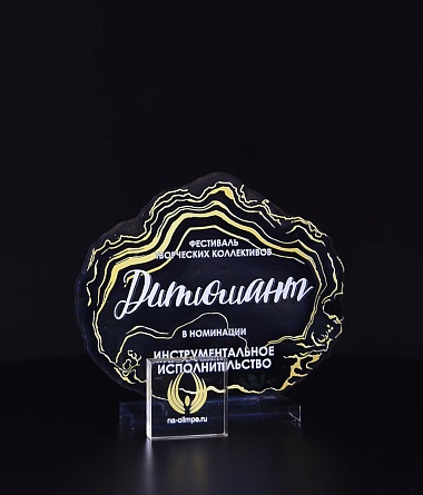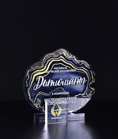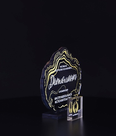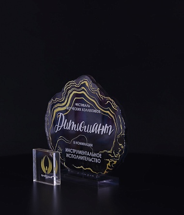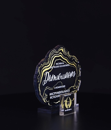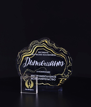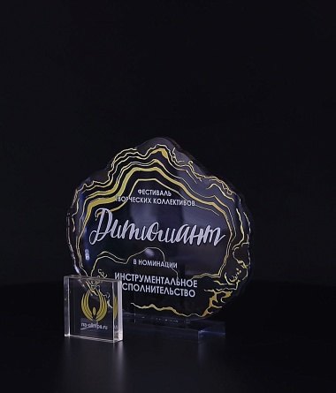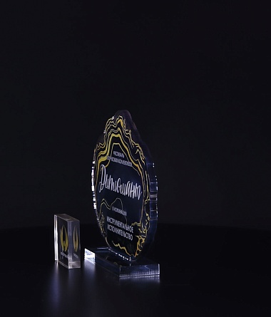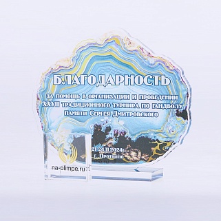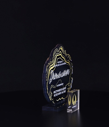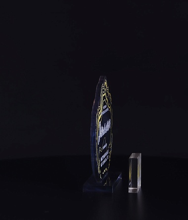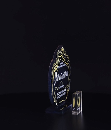 Приз из прозрачного акрила с глянцевой цветной печатью на лицевой стороне и полупрозрачной печатью на задней стенке награды и постаменте.