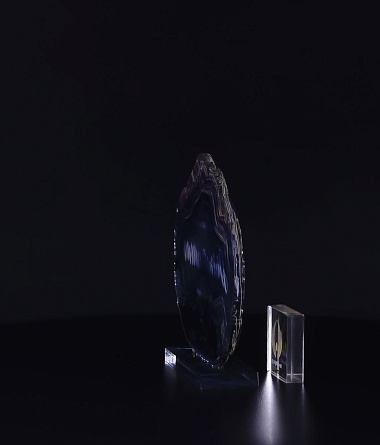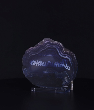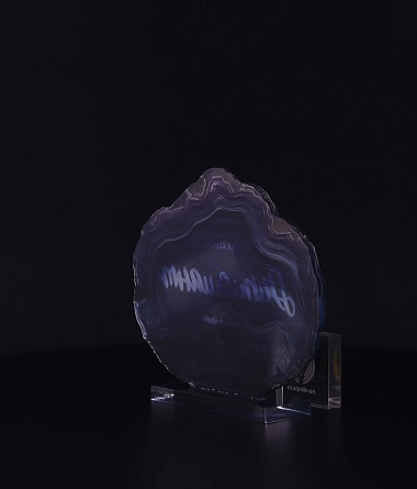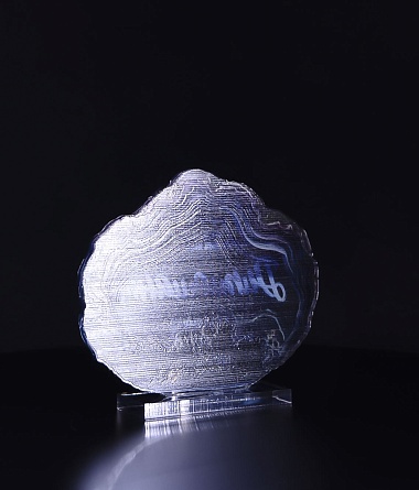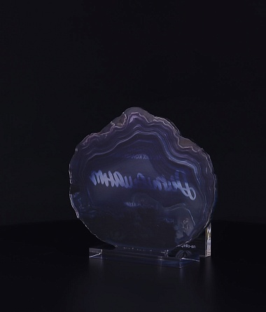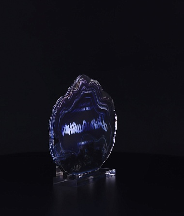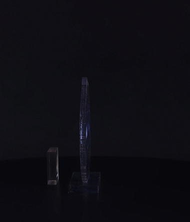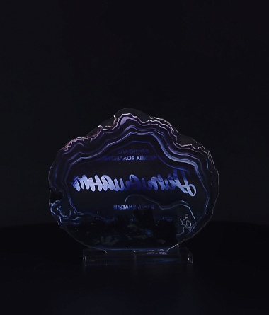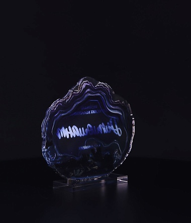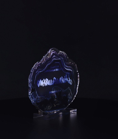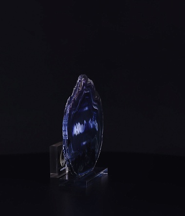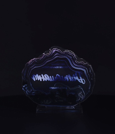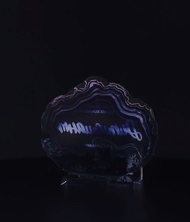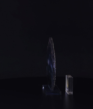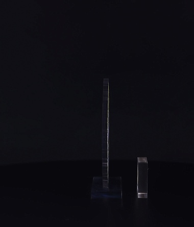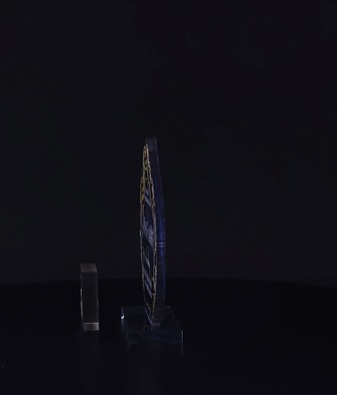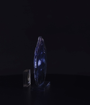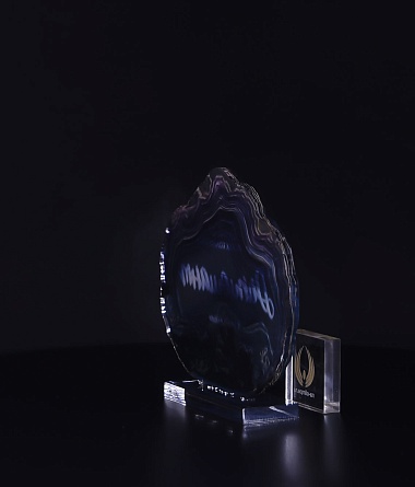 Приз из прозрачного акрила с глянцевой цветной печатью на лицевой стороне и полупрозрачной печатью на задней стенке награды и постаменте.