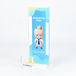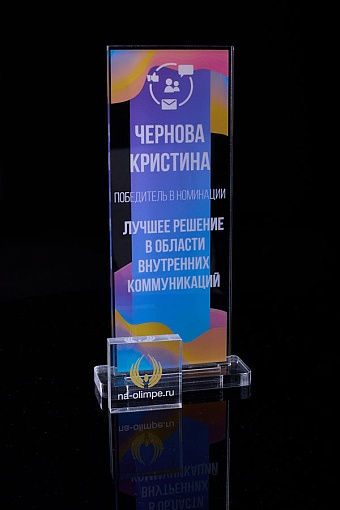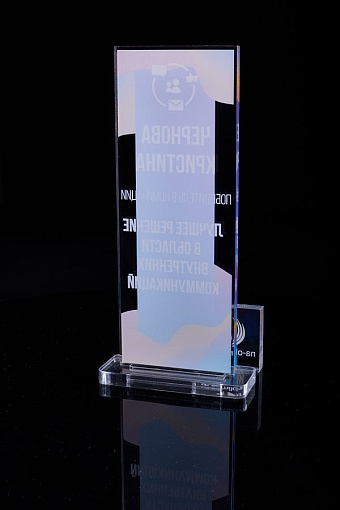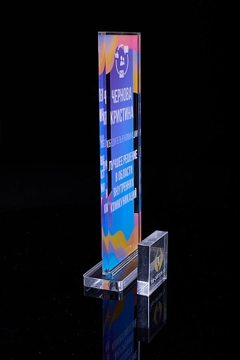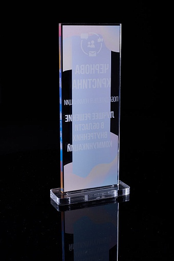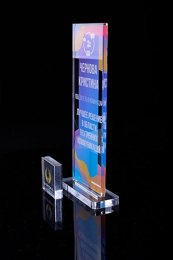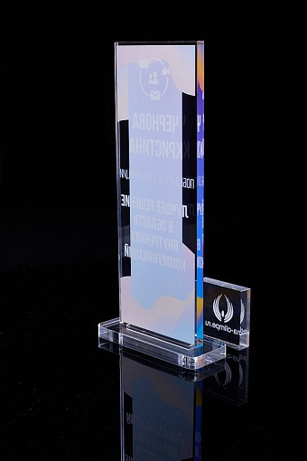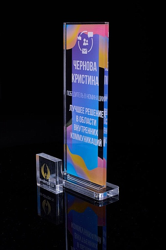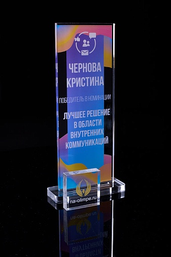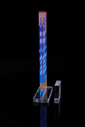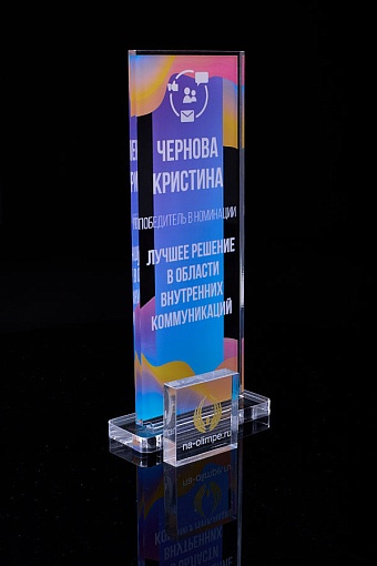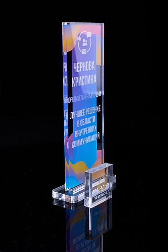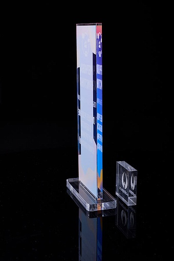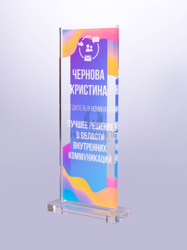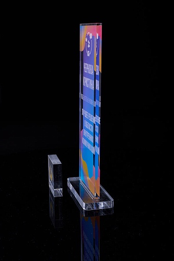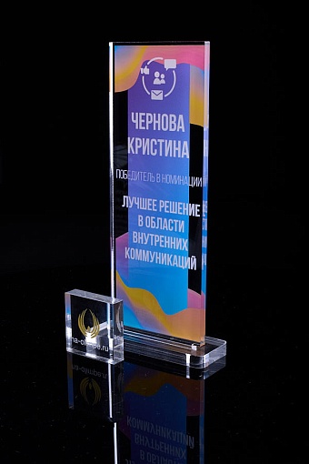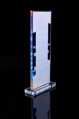 <p>Награда из прозрачного акрила с цветной печатью на постаменте. Акриловая вертикальная основа вставляется в постамент в паз. Такая конструкция проста и надежна в эксплуатации и при транспортировке, так как не имеет склеенных элементов.</p>