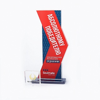 Приз из прозрачного акрила с глянцевой цветной печатью на лицевой стороне и полупрозрачной печатью на задней стенке награды и постаменте.
