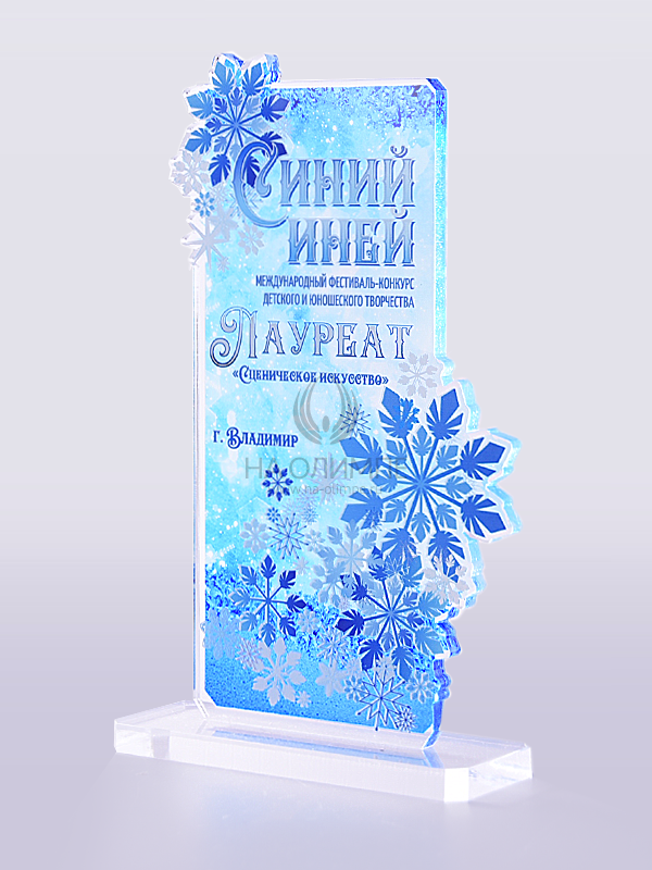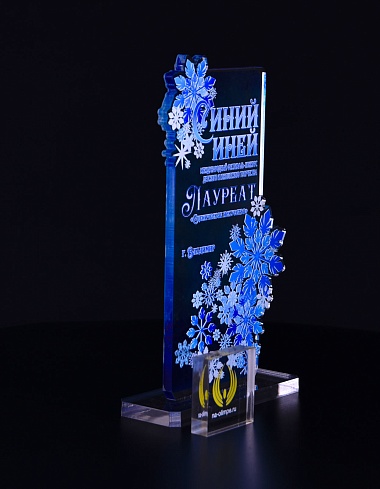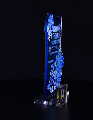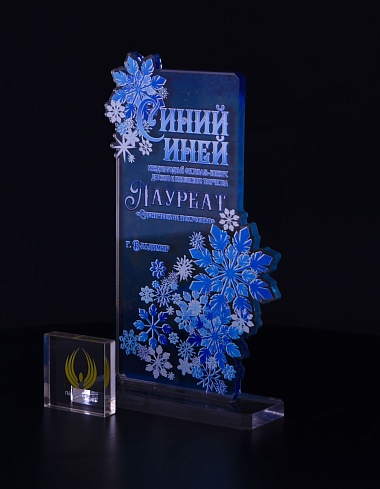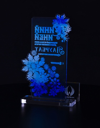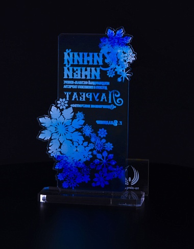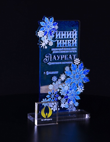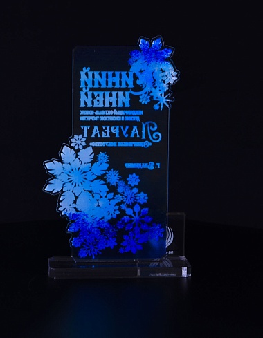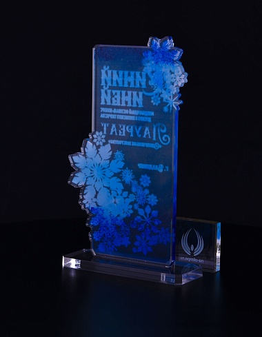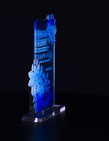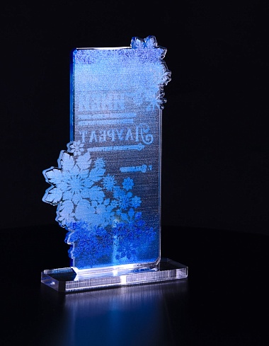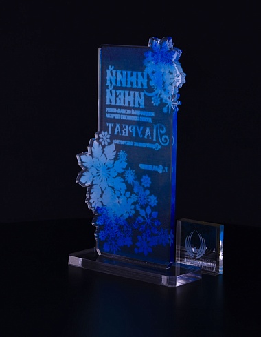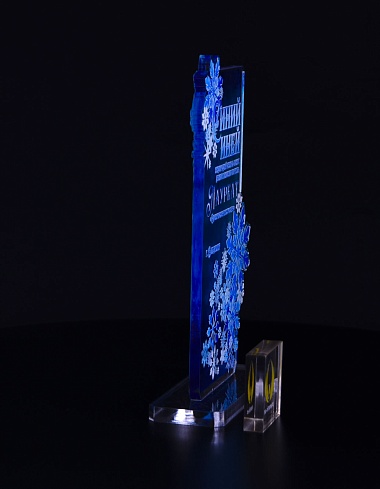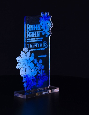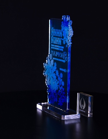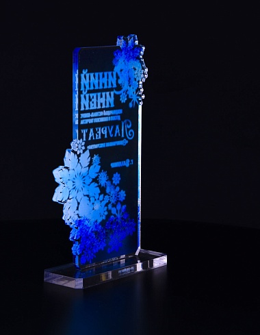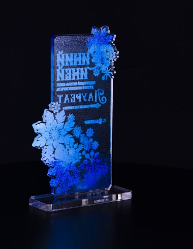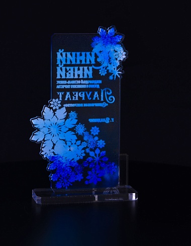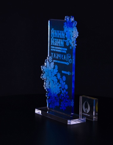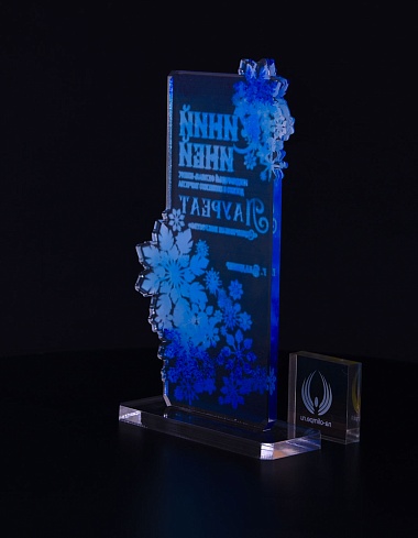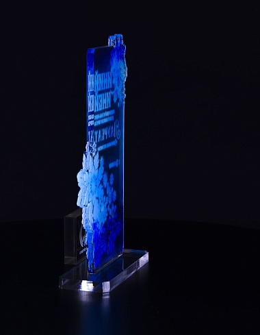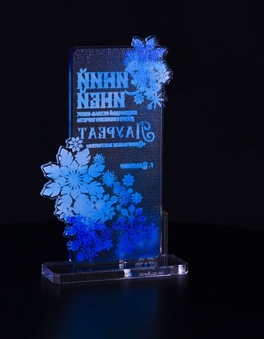 Приз из прозрачного акрила с глянцевой цветной печатью на лицевой стороне и полупрозрачной печатью на задней стенке награды и постаменте.